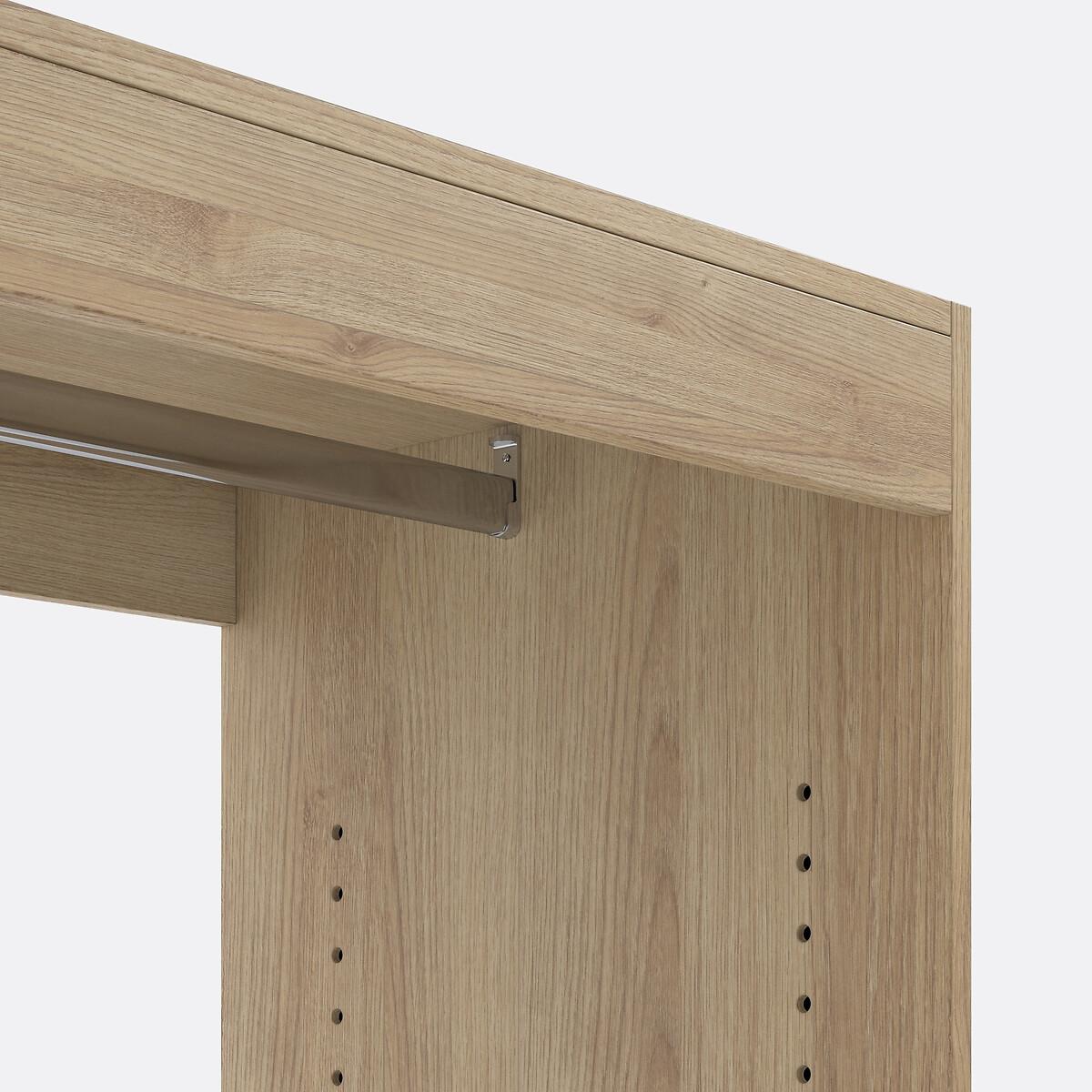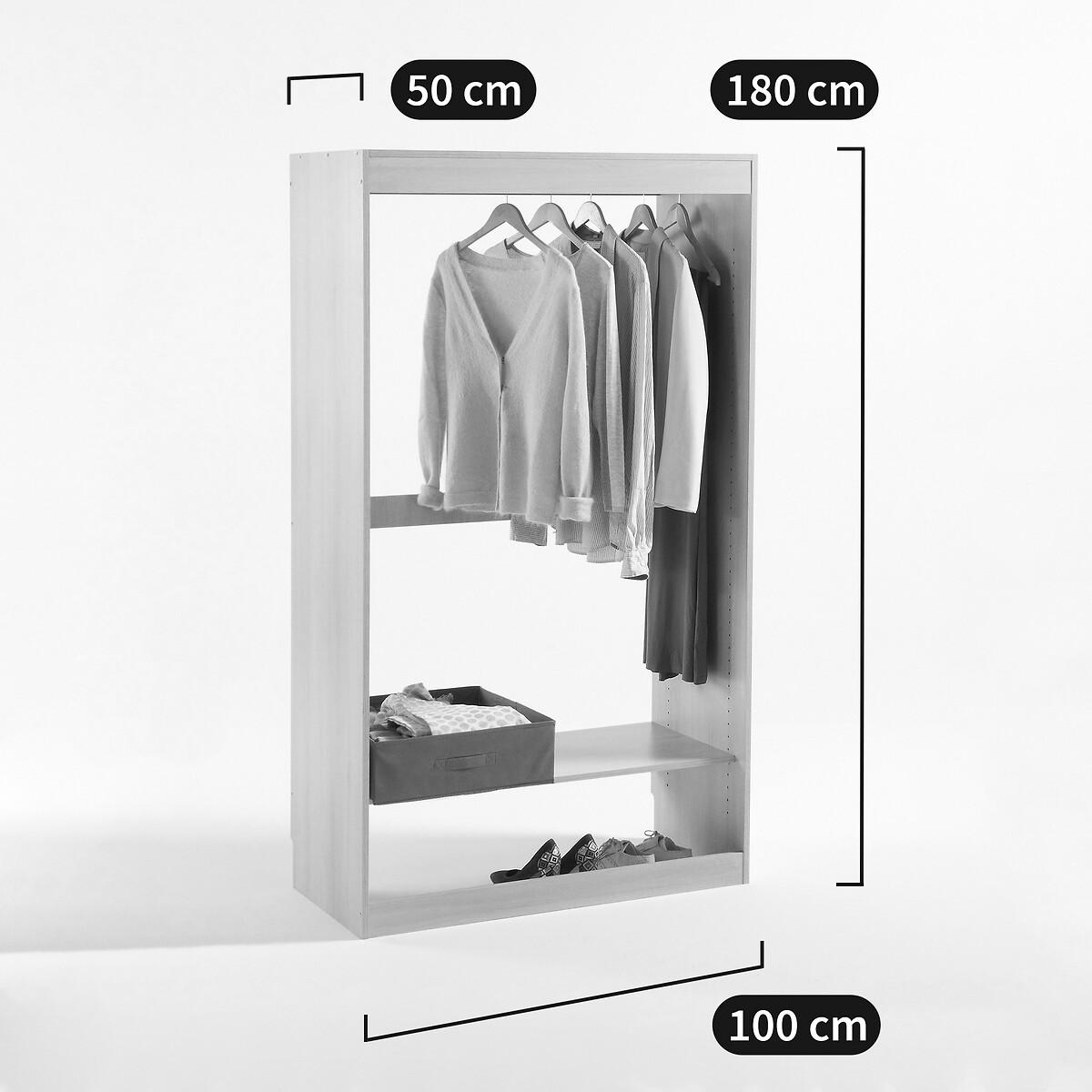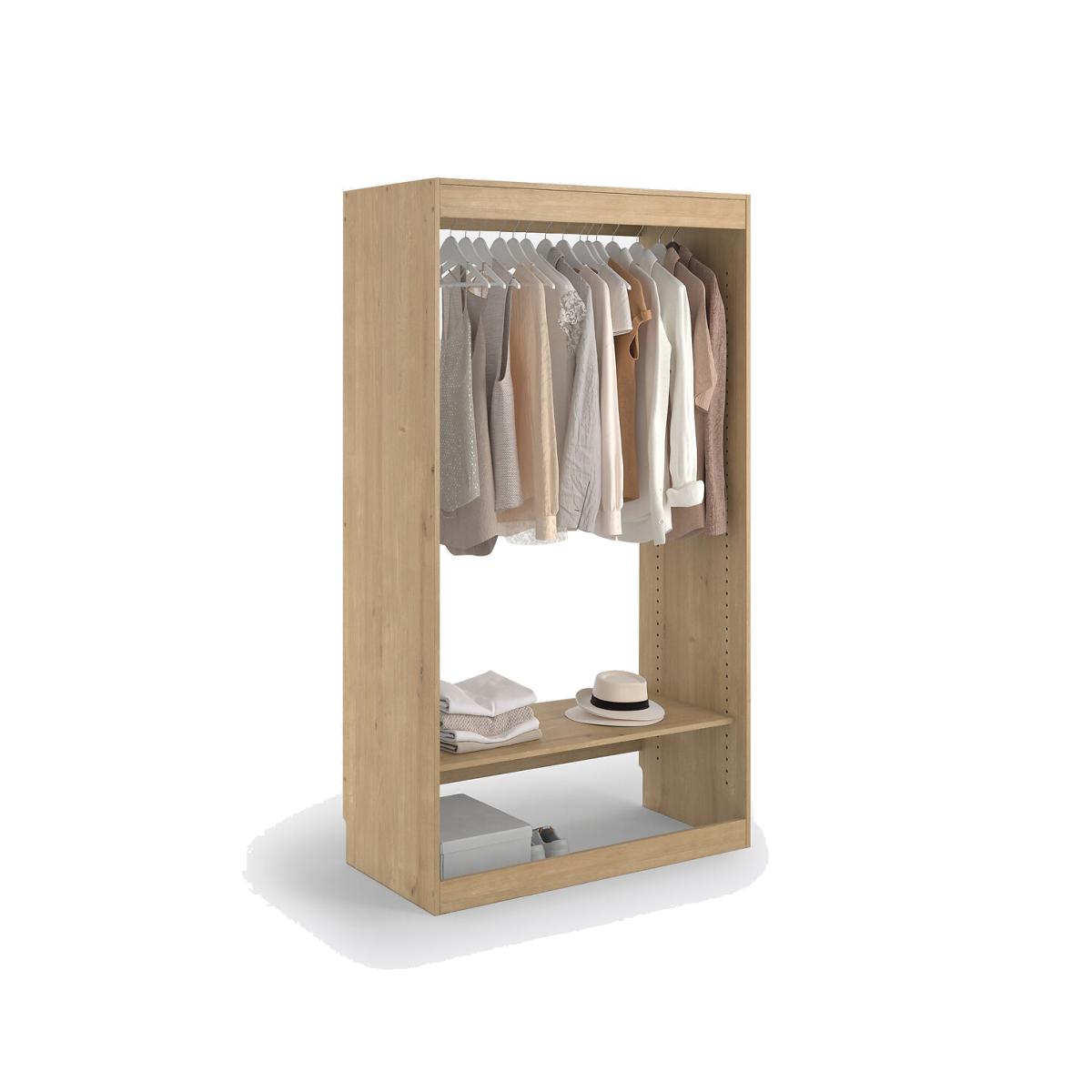 Build your own wardrobe! The Build Hanging wardrobe + 1 shelf module adapts to your needs and your space. Choose from 6 wardrobe modules, then select your favourite blind colour. Product Details • 1 chrome steel hanging rail • 1 vertical shelf at the bottom, height-adjustable, D45cm • Made of PEFC certified melamine particleboard • Must be fixed to wall • Wall mounting system included, screws and dowels not provided • Blind sold separately, size 4 (L96 x H190cm) suitable for this moduleDimensions. Total • Length: 100cm • Height: 180cm • Depth: 50cm • Weight: 38kg. Usable dimensions • Dimensions of shelf:L96.8 x D45cmDelivery:. This product is sold ready to assemble. • Made in France. • WOOD FROM SUSTAINABLY MANAGED FORESTS. PEFC certified wood comes from sustainably managed forests and controlled sources. PEFC contributes to ensuring sustainability and renewal through natural regeneration or planting by preserving trees of the future and promoting the diversity of species. Dimensions and weight of parcel2 parcels • L102 x H7.5 x D54cm - 16.5kg • L185 x H4.5 x D54cm - 22kg