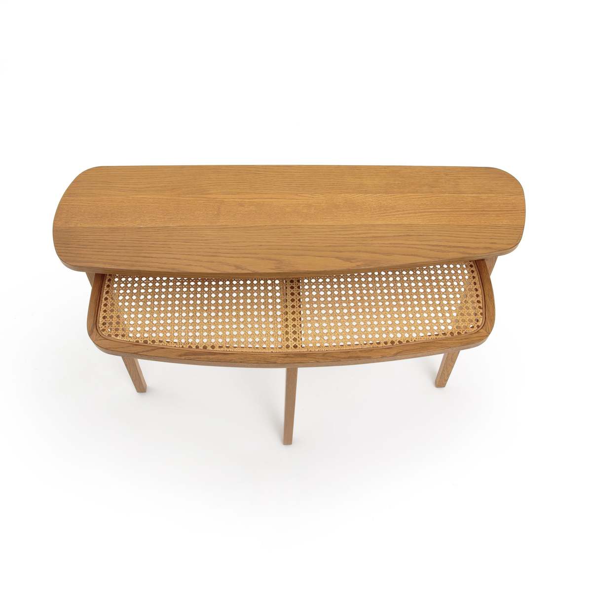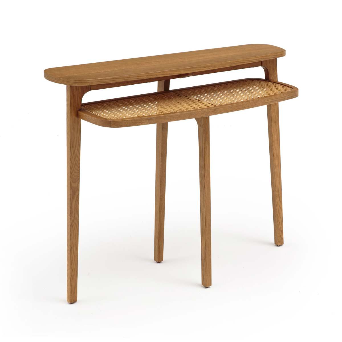 We love the stylish combination of oak and cane on this BUISSEAU console table. It has a natural, retro feel and it’s functional too, thanks to the handy lower shelf. Team it up with the rest of the BUISSEAU collection. Materials• Top: Oak veneered MDF, nitrocellulose varnish• Frame/Legs: Solid oak with nitrocellulose varnish finish• Lower Shelf: Oak and cane