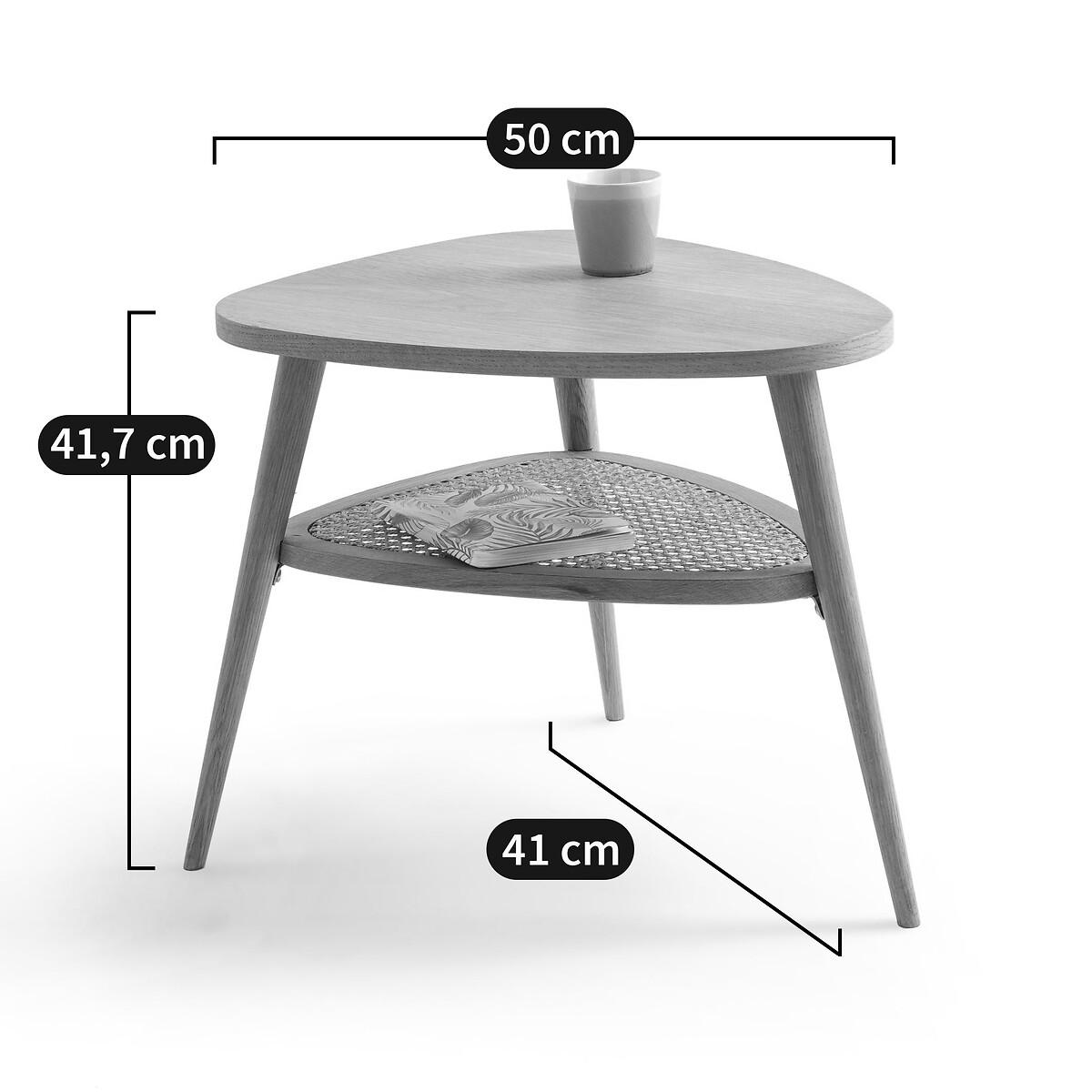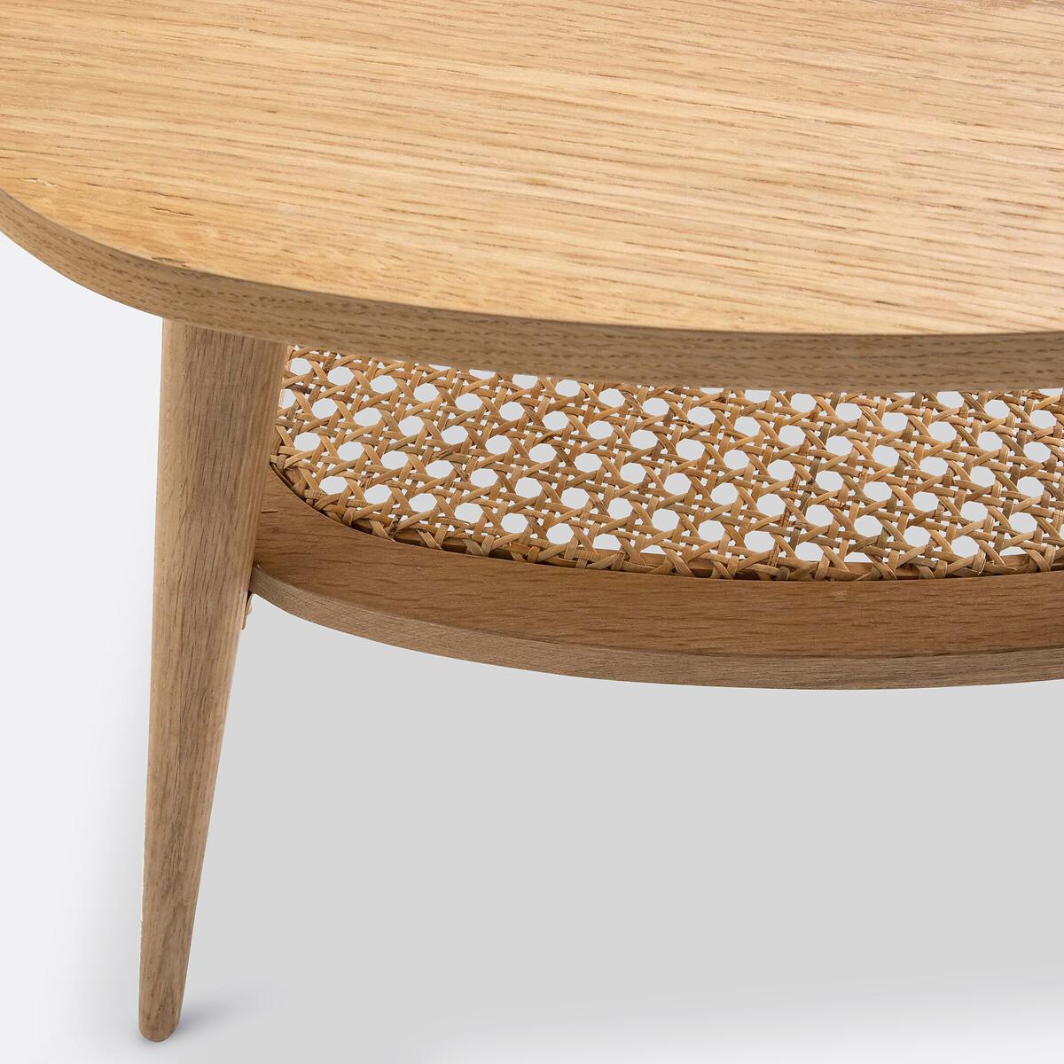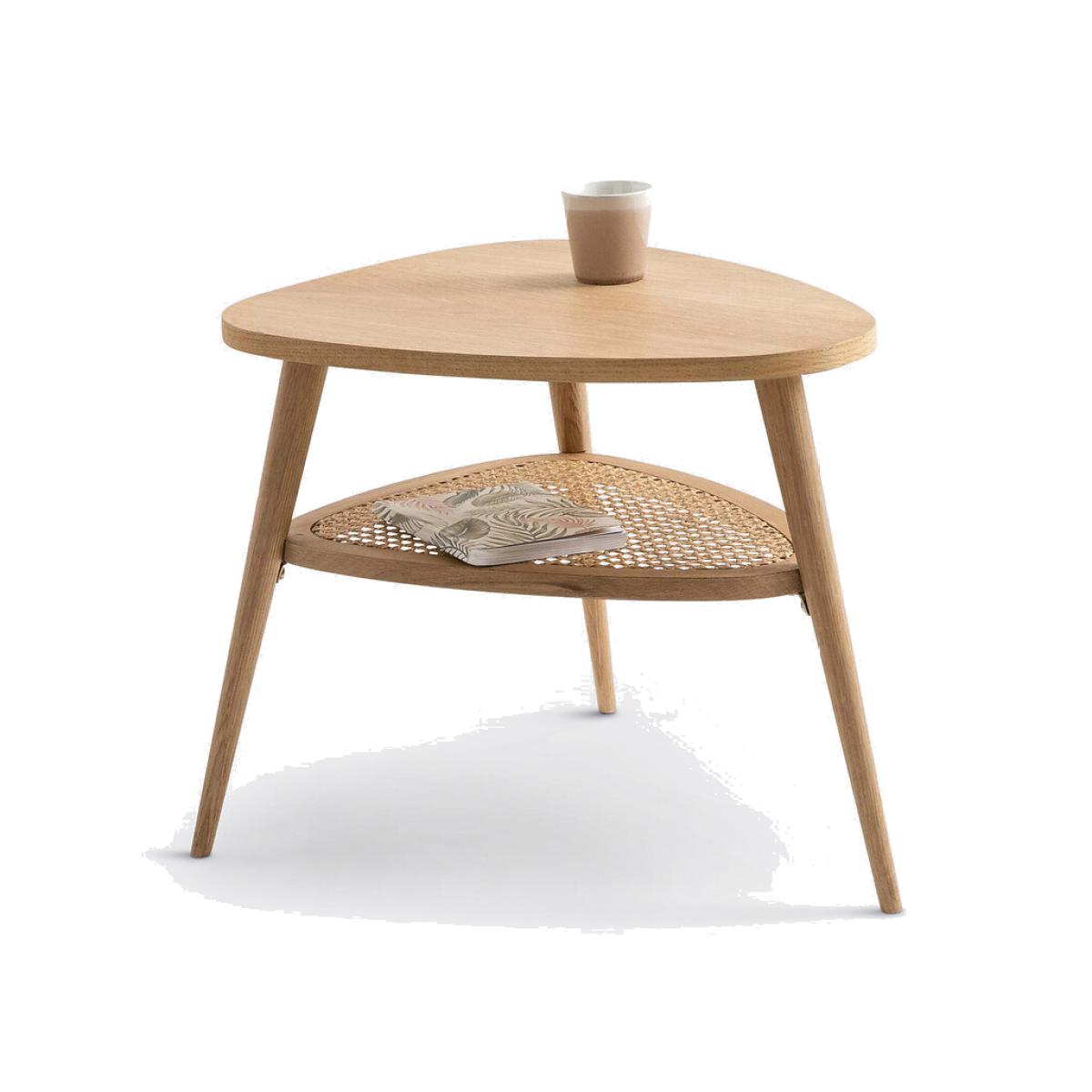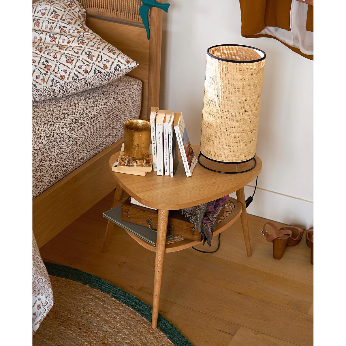 Our Buisseau bedside table is ready to receive your cups, books and anything else you like to keep close at hand. With its gentle curves and natural accents, it radiates retro appeal. Made of oak and rattan cane work, this two-tier bedside table brings a chic touch to your bedroom!Product Details • Two tier • Solid oak base with nitrocellulose varnish finish • Table top in MDF with oak veneer and nitrocellulose finish • Lower tray in rattan cane and solid oakDimensions. Overall • Width: 50cm • Height: 41.7cm • Depth: 41cm • Assembly required. • WOOD FROM SUSTAINABLY MANAGED FORESTS. FSC® certified wood comes from forests that are environmentally, socially and economically well managed. Dimensions and weight of parcel1 parcel • 55.5 x 46.5 x 10 cm. 6kg.