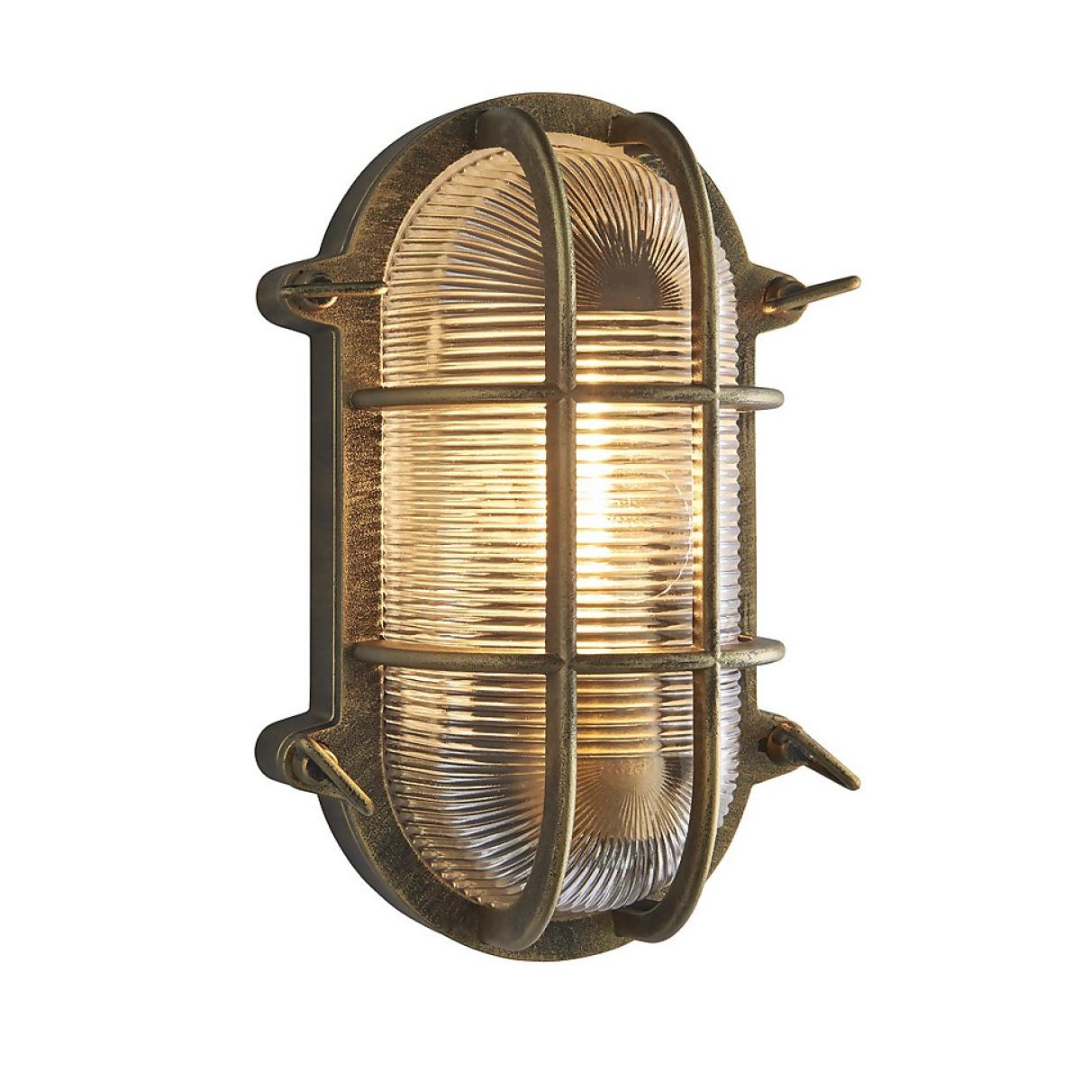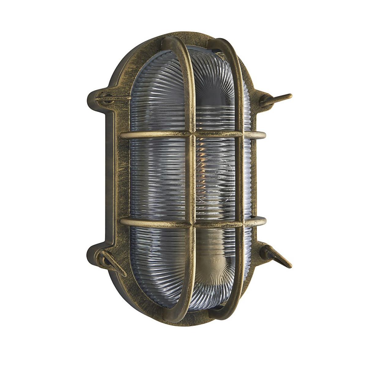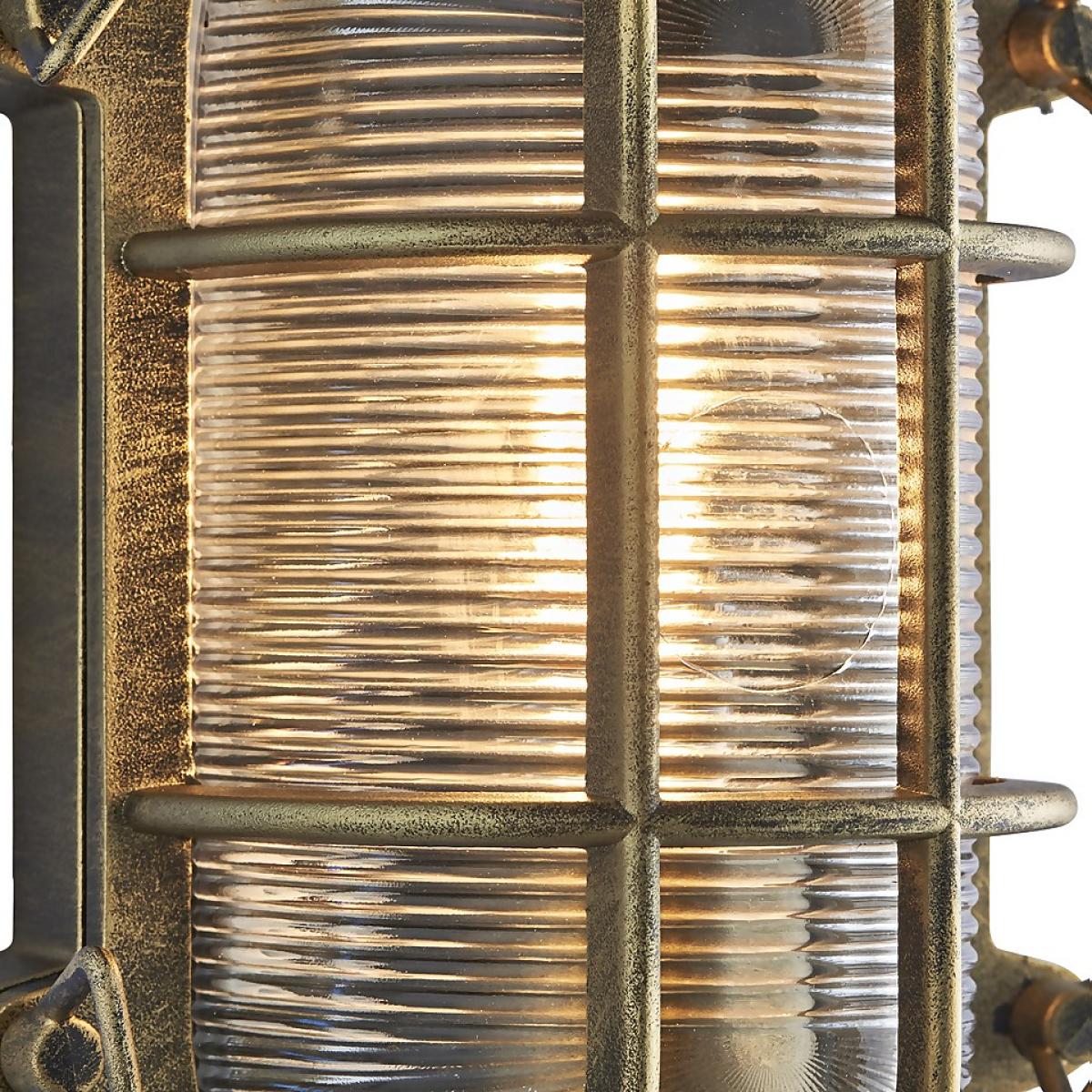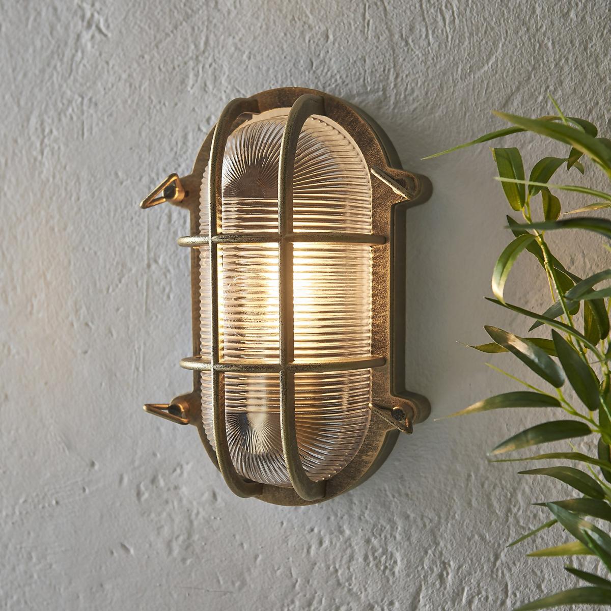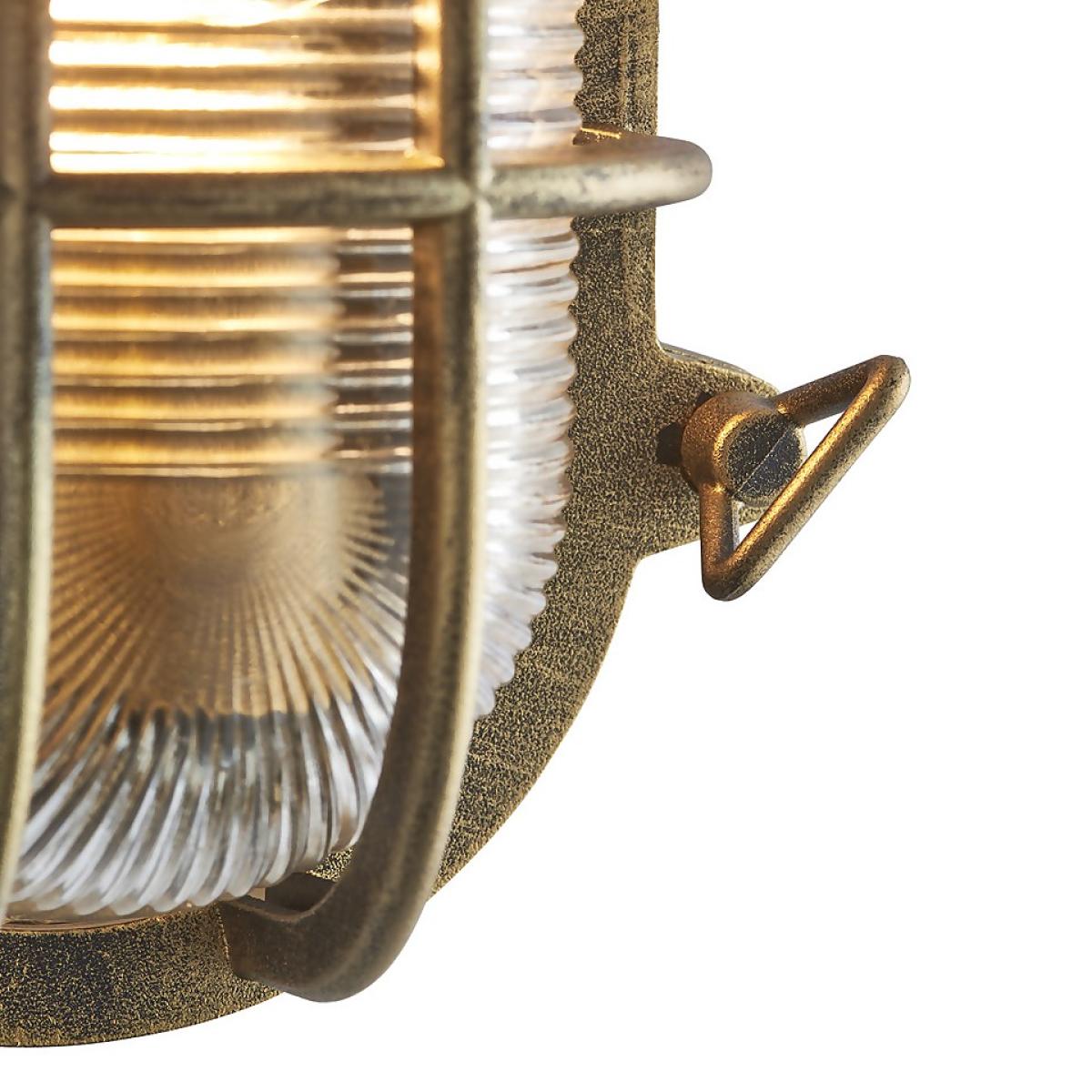 This bulkhead outdoor wall light, crafted from an aluminium alloy offers a robust and industrial style for your home. Finished in a distressed brass finish, this light can be either ceiling or wall mounted providing versatility in your outside space.