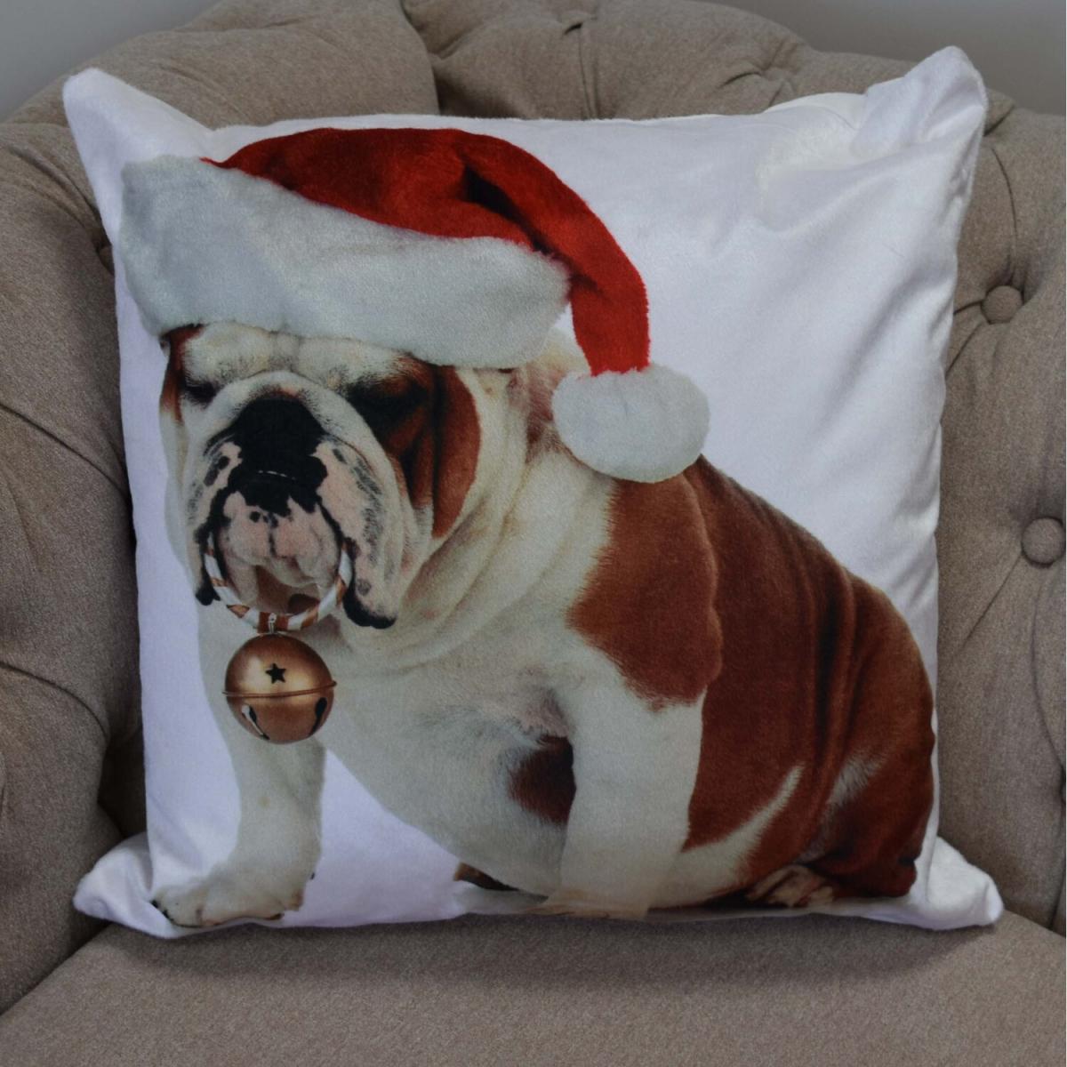 Fun christmas photographic velvet cushion cover featuring a bulldog playing with a bauble.
