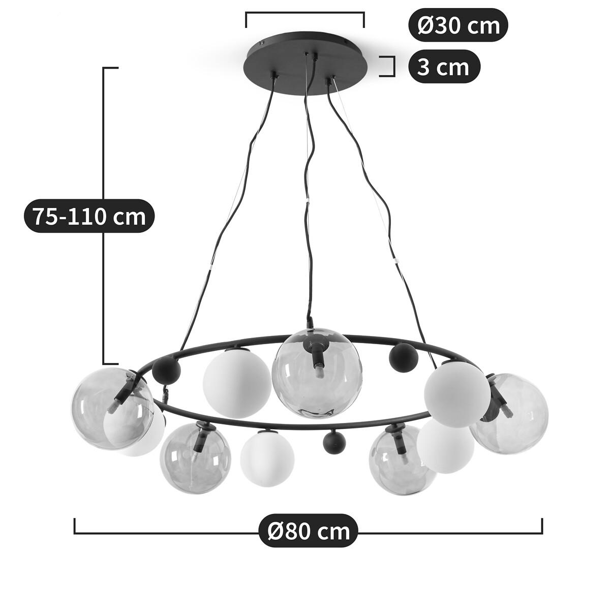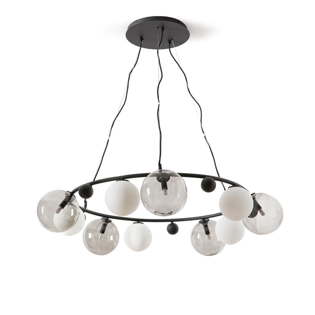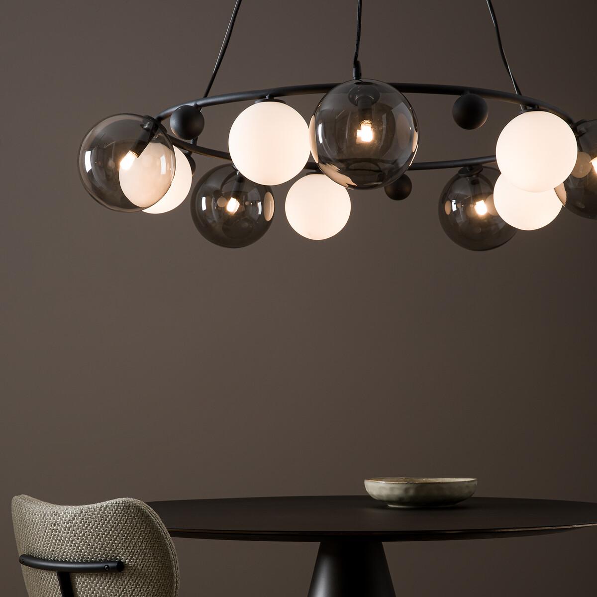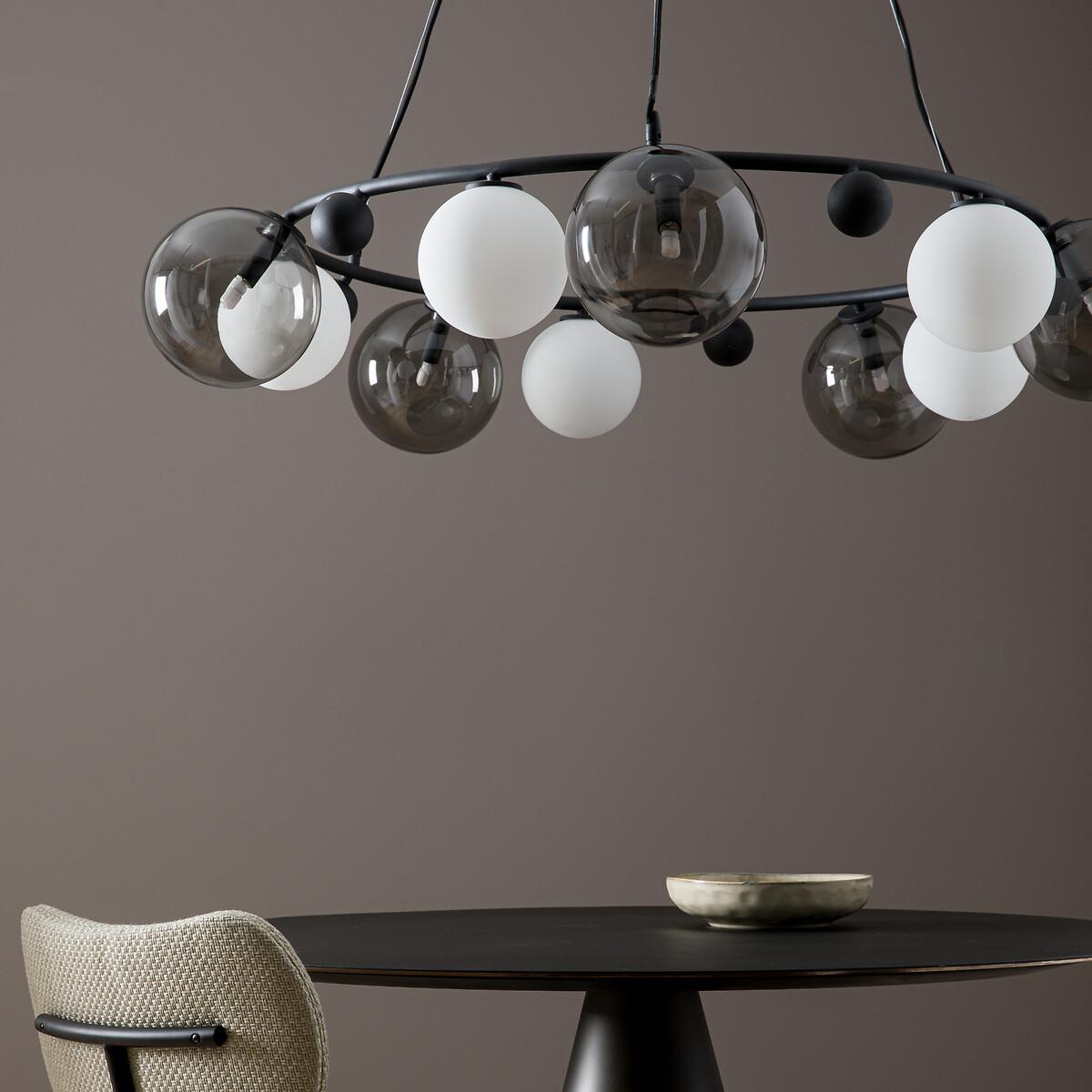 The Bullesco chandelier plays with circular glass 'bubbles' for an unusual but elegant look. Height adjustable, it combines smoked glass, opaline and metal. The perfect design to hang above a table. Product Details • Glass and steel with a gunmetal epoxy finish • 5 smoked blown glass globes diameter, 18cm • 5 matte finish white opaline globes, diameter 14cm • 5 steel globes, diameter 6cm • Height-adjustable steel cables and black fabric-covered electrical cable • 10 GU9 LED sockets for 3W bulbs (not included)Dimensions • Diameter: 80cm • Cable length: 75 to 110cm • Ceiling plate: Diameter 30cm x H3cm. Dimensions and weight of parcel • 1 parcel • L63 x H43 x D50cm.