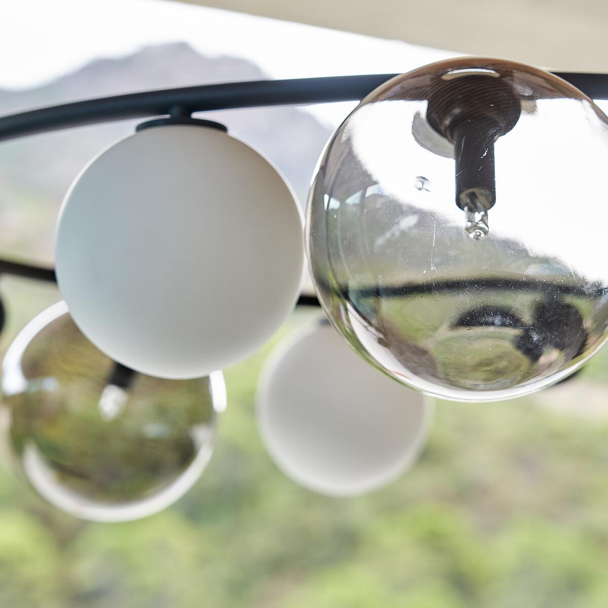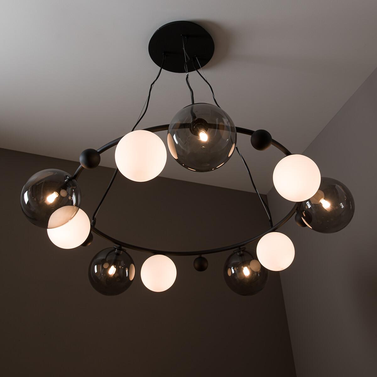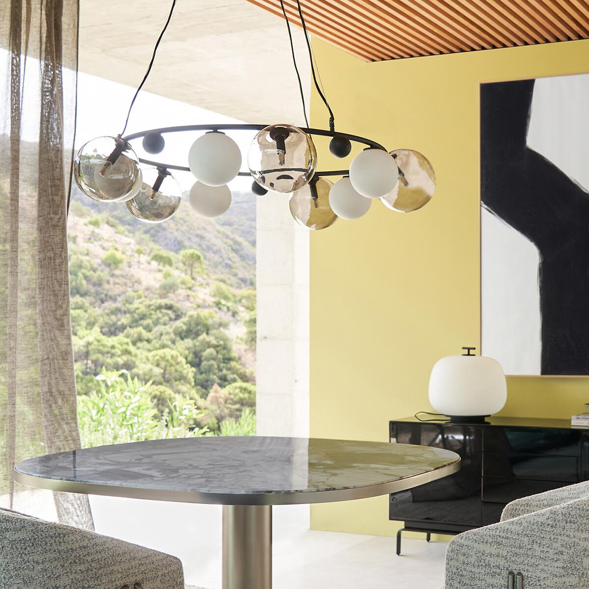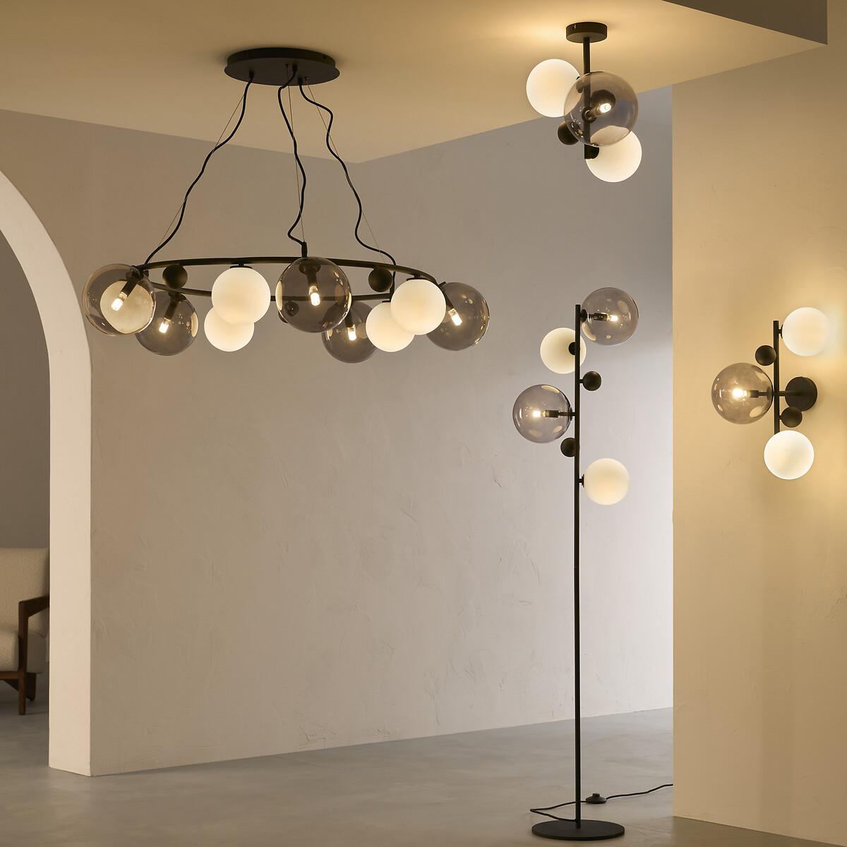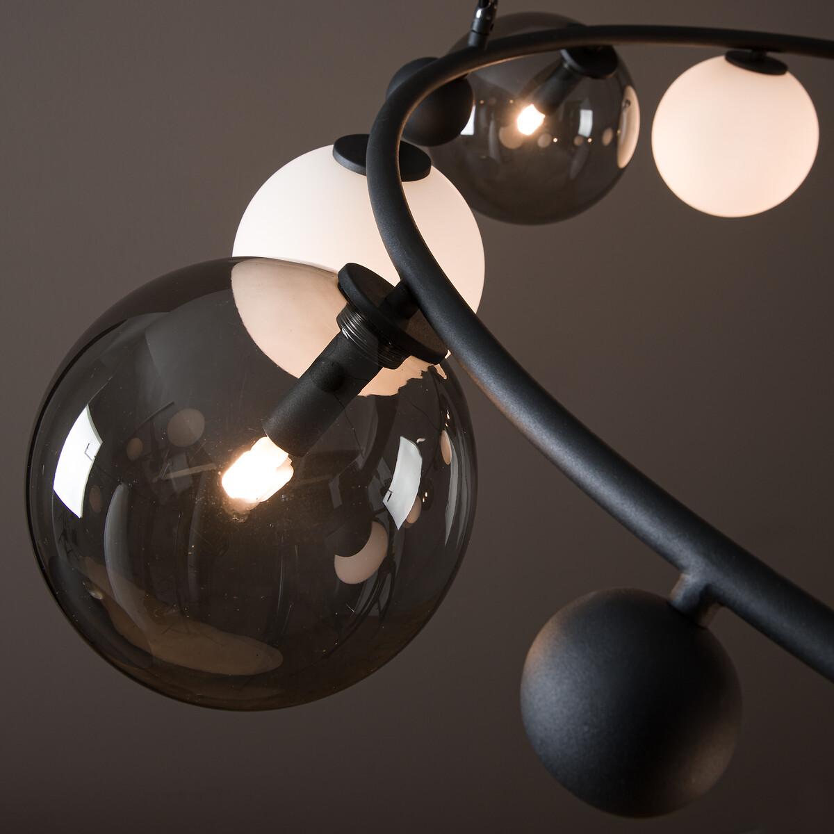 The Bullesco chandelier plays with circular glass 'bubbles' for an unusual but elegant look. Height adjustable, it combines smoked glass, opaline and metal. The perfect design to hang above a table. Product Details • Glass and steel with a gunmetal epoxy finish • 5 smoked blown glass globes diameter, 18cm • 5 matte finish white opaline globes, diameter 14cm • 5 steel globes, diameter 6cm • Height-adjustable steel cables and black fabric-covered electrical cable • 10 GU9 LED sockets for 3W bulbs (not included)Dimensions • Diameter: 80cm • Cable length: 75 to 110cm • Ceiling plate: Diameter 30cm x H3cm. Dimensions and weight of parcel • 1 parcel • L63 x H43 x D50cm.