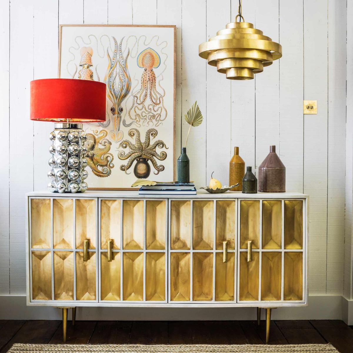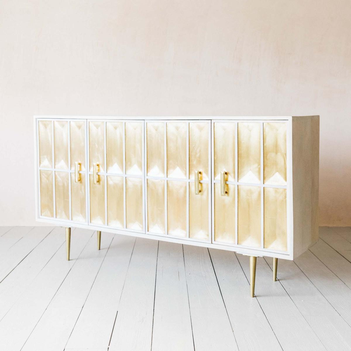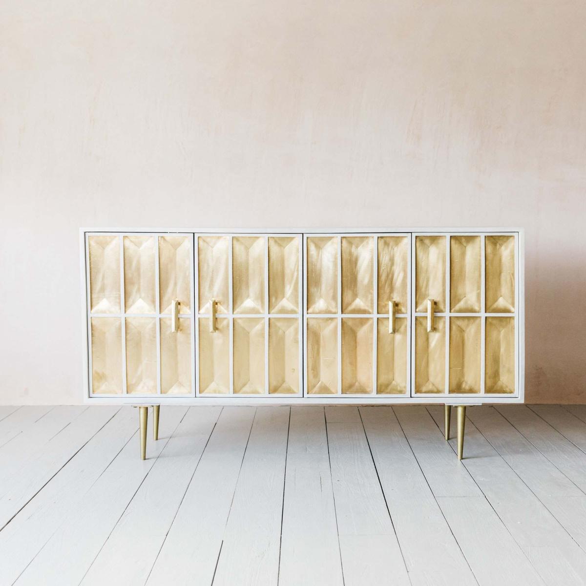Handcrafted from mango wood with a lightly whitewashed finish, our statement Bullion sideboard will make a striking addition to your living space. Featuring four textured doors with a lacquered brass-plated sheet wrap, a single shelf and mid-century style tapered legs, this sideboard truly is an eye-catching piece.