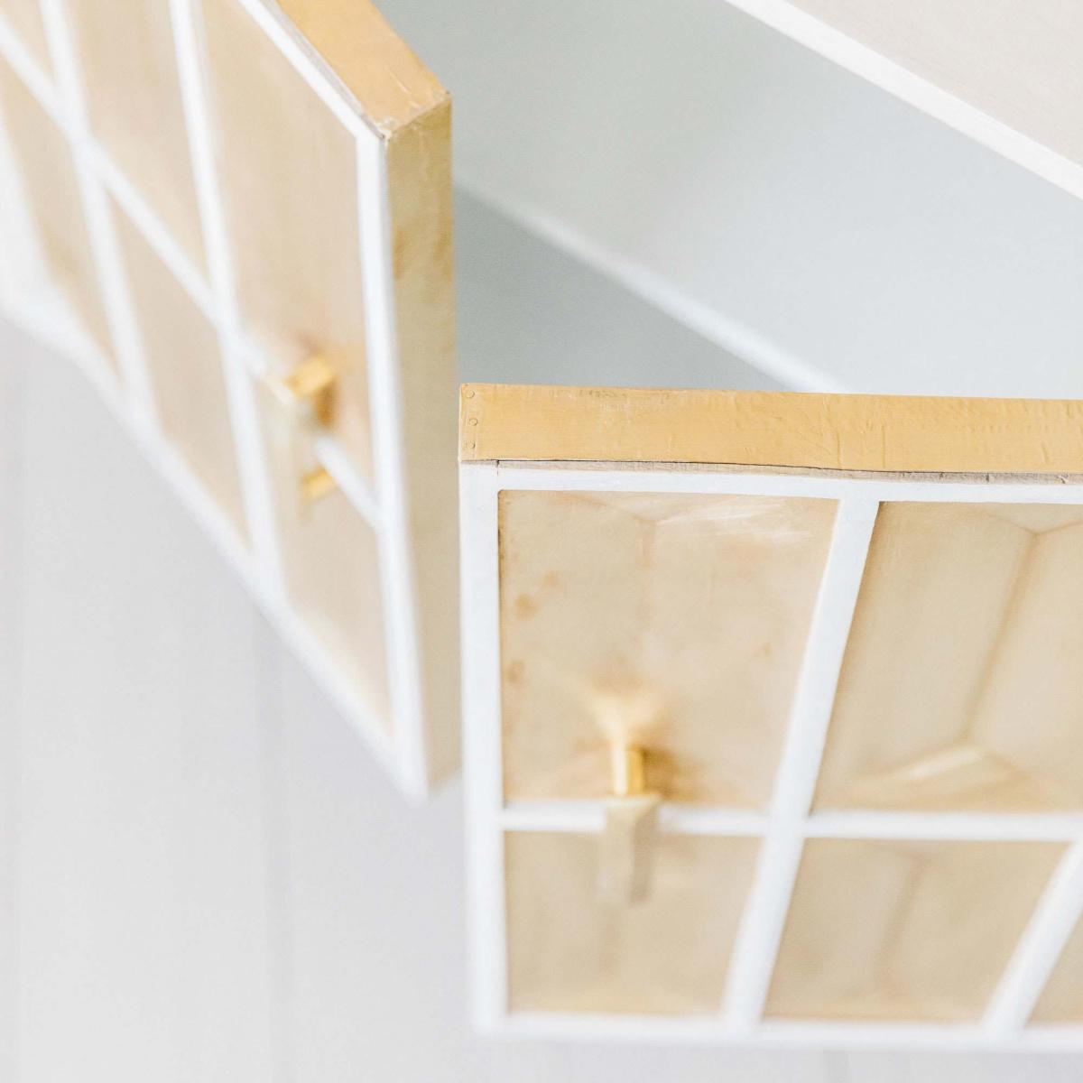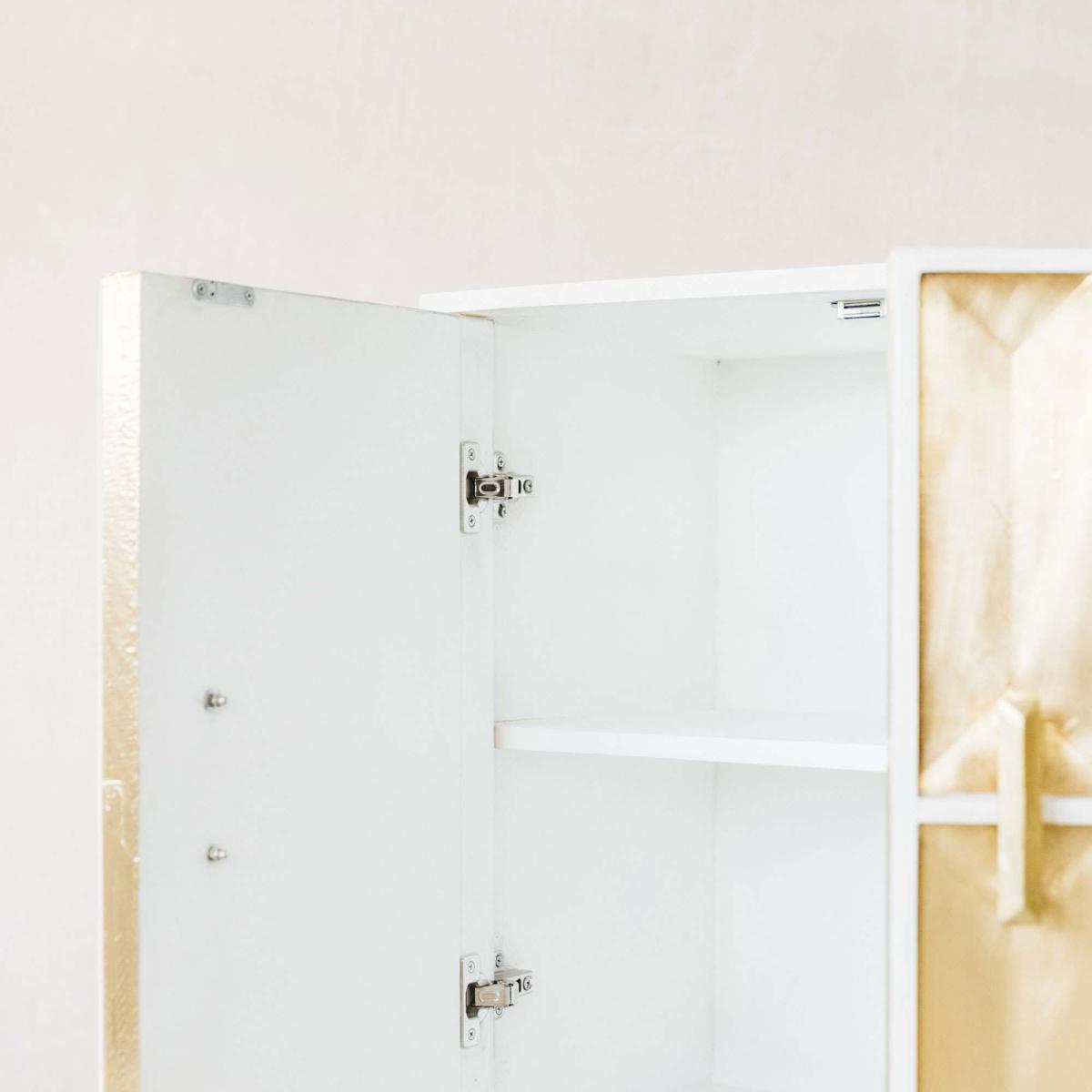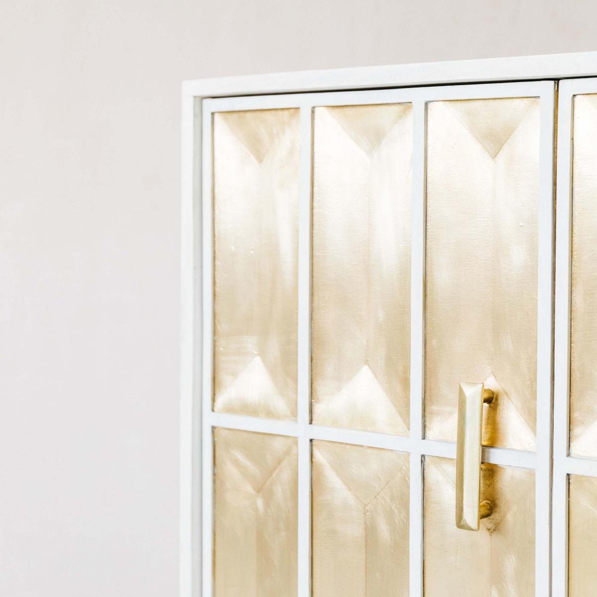 Handcrafted from mango wood with a lightly whitewashed finish, our statement Bullion sideboard will make a striking addition to your living space. Featuring four textured doors with a lacquered brass-plated sheet wrap, a single shelf and mid-century style tapered legs, this sideboard truly is an eye-catching piece.
