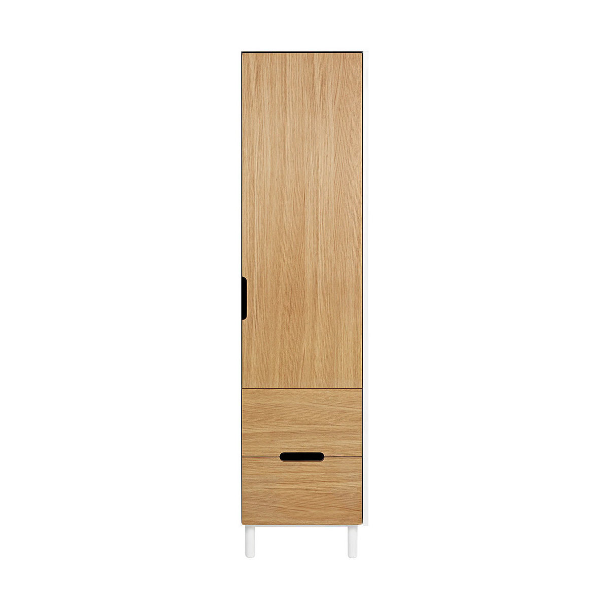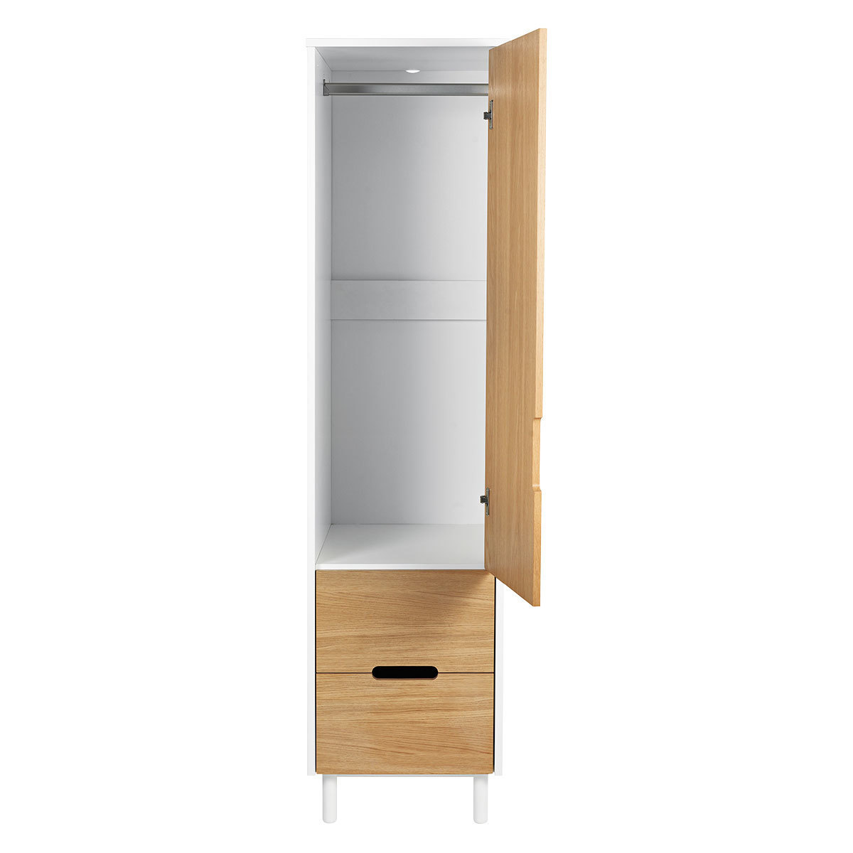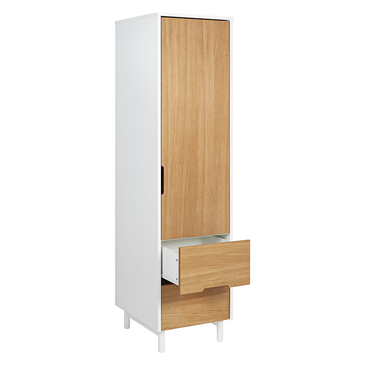 The Bumble white and oak 1 door wardrobe combines a crisp white carcass with warm-toned, beautifully grained veneer in a streamlined design. Perfect for smaller spaces, the narrow-profile wardrobe has a metal hanging rail and 2 drawers, its door and drawers have a feature cut-out detail for handles and the design sits on solid wood feet. Designed in house and exclusive to Habitat, the Bumble range includes white and oak bedroom furniture and occasional tables in a choice of colours.