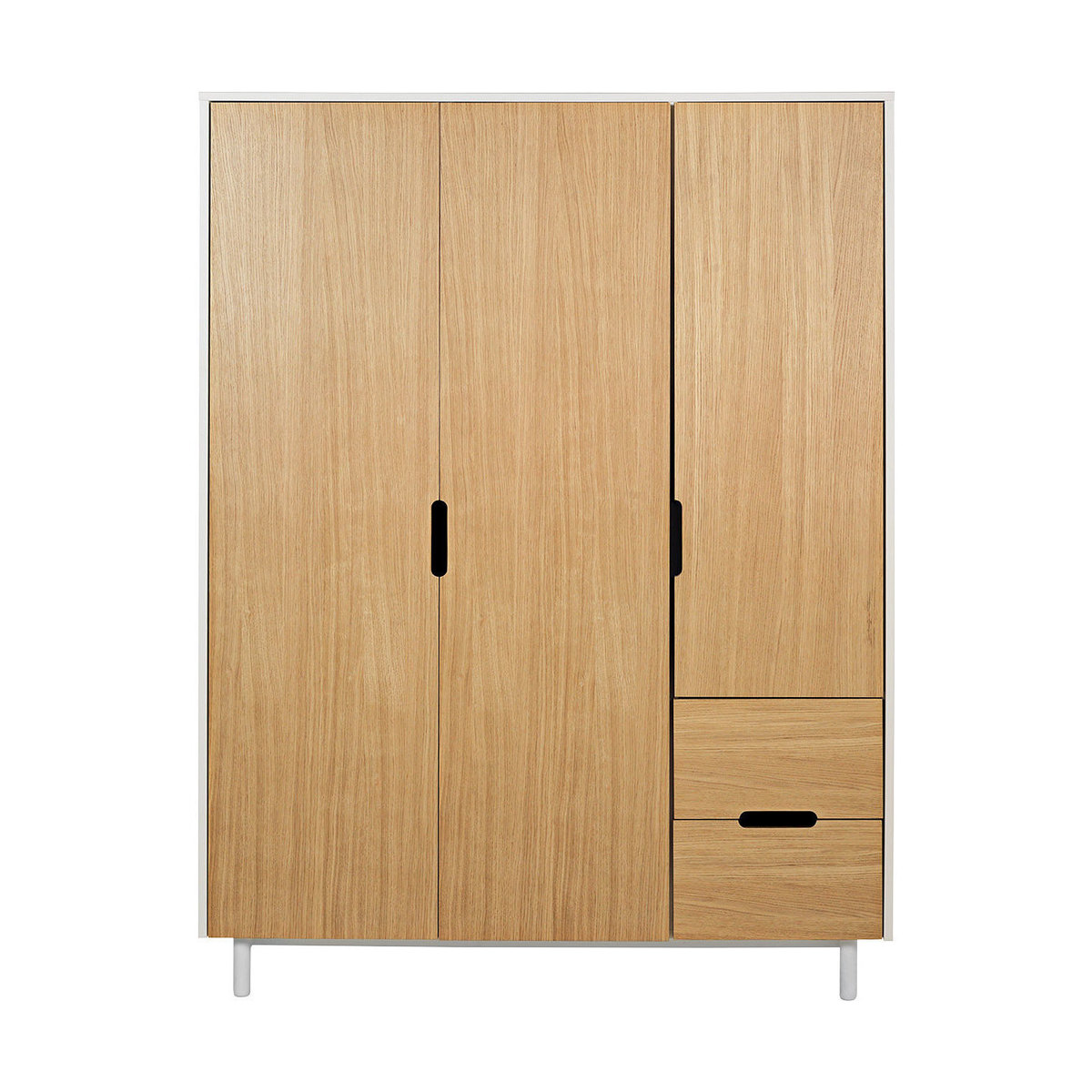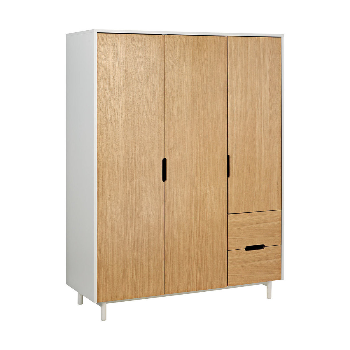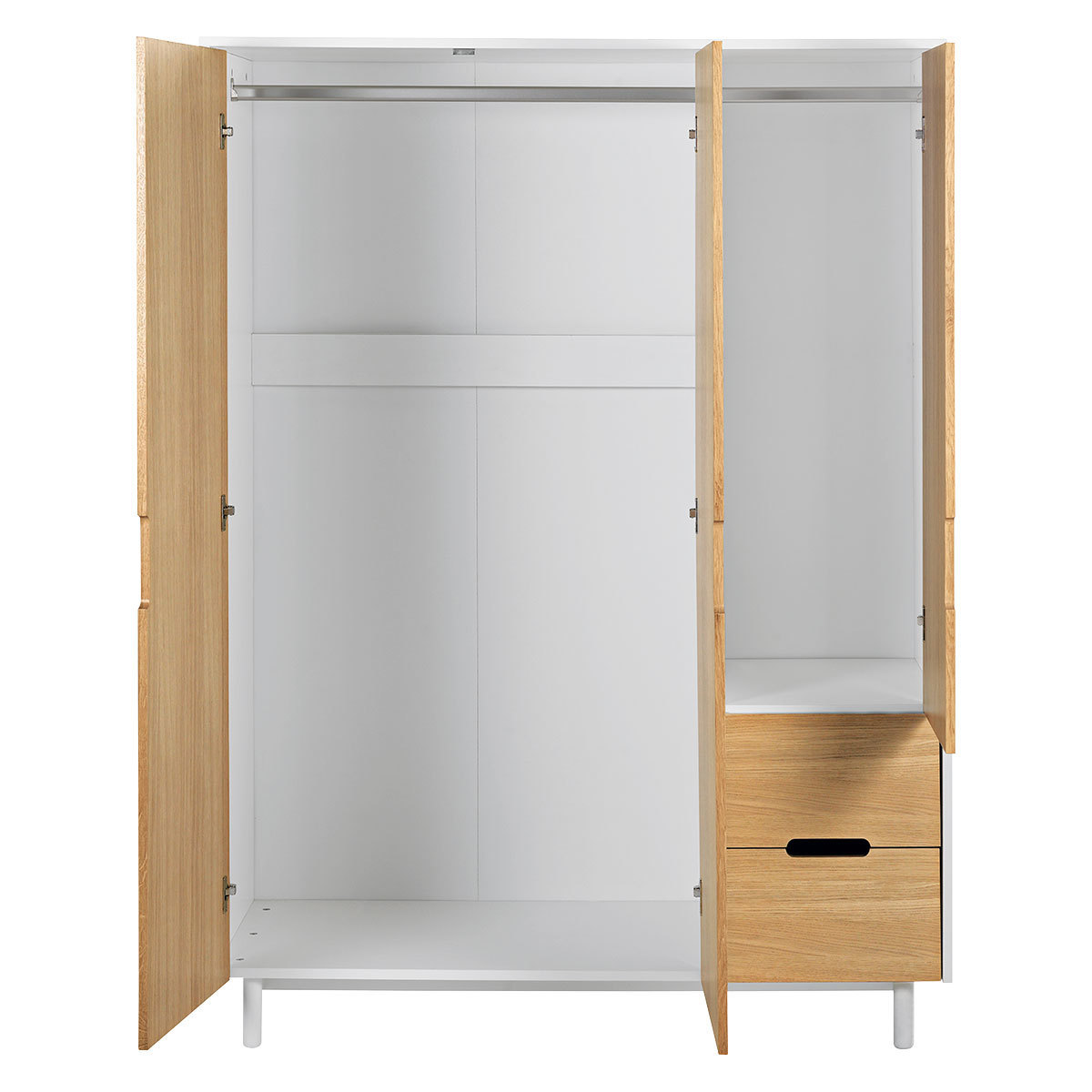 The Bumble white and oak 3 door wardrobe combines a crisp white carcass with warm-toned, beautifully grained veneer in a streamlined design. The spacious wardrobe offers full- and half-height hanging and has 2 drawers, its doors and drawers have a feature cut-out detail for handles and the design sits on solid wood feet. Designed in house and exclusive to Habitat, the Bumble range includes white and oak bedroom furniture and occasional tables in a choice of colours.