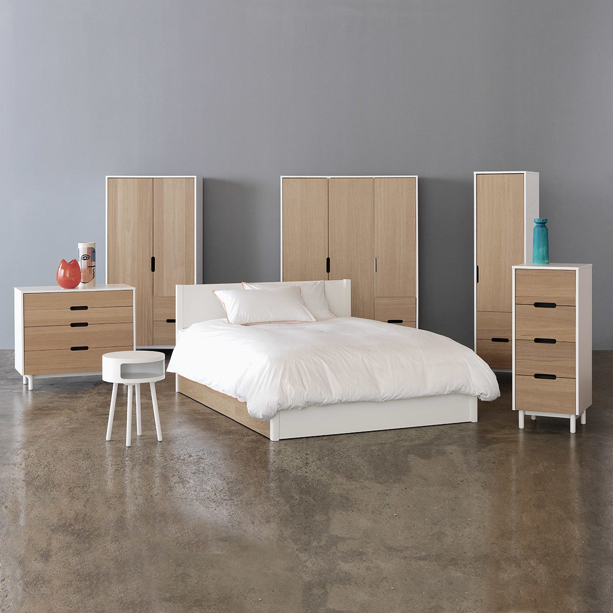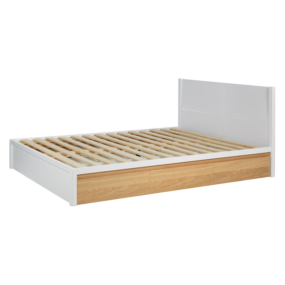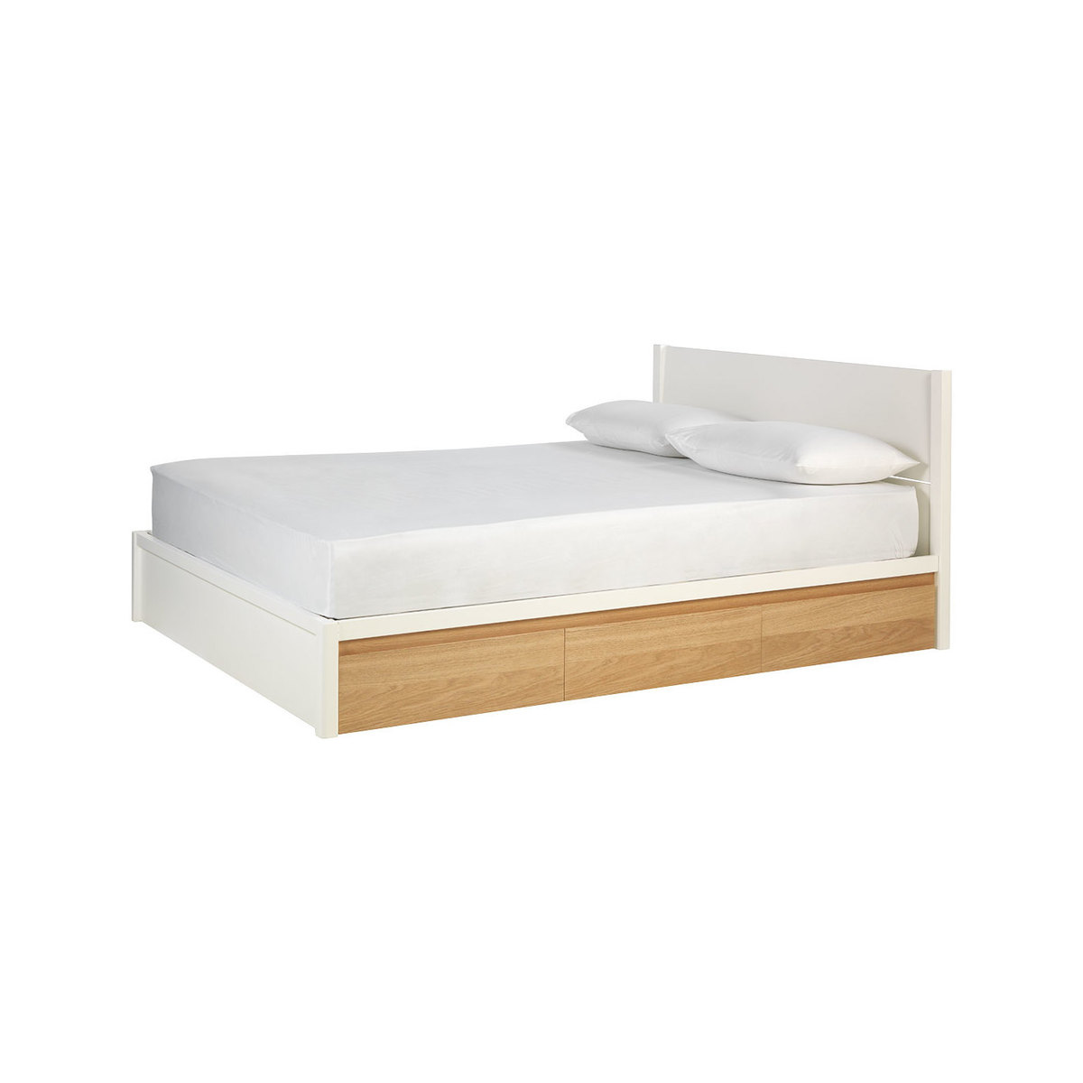 The Bumble white and oak double bed with 6 storage drawers combines a crisp white carcass with warm-toned, beautifully grained veneer. The streamlined bed's capacious drawers hold the equivalent of a large chest of drawers, saving valuable space in small rooms, and have hidden, chamfered handles and wheels for easy access. Also available as a kingsize bed, the Bumble bed has a white-painted headboard and base, and fits a standard UK 135cm double mattress. Designed in house and exclusive to Habitat, the Bumble range includes white and oak bedroom furniture and occasional tables in a choice of colours.