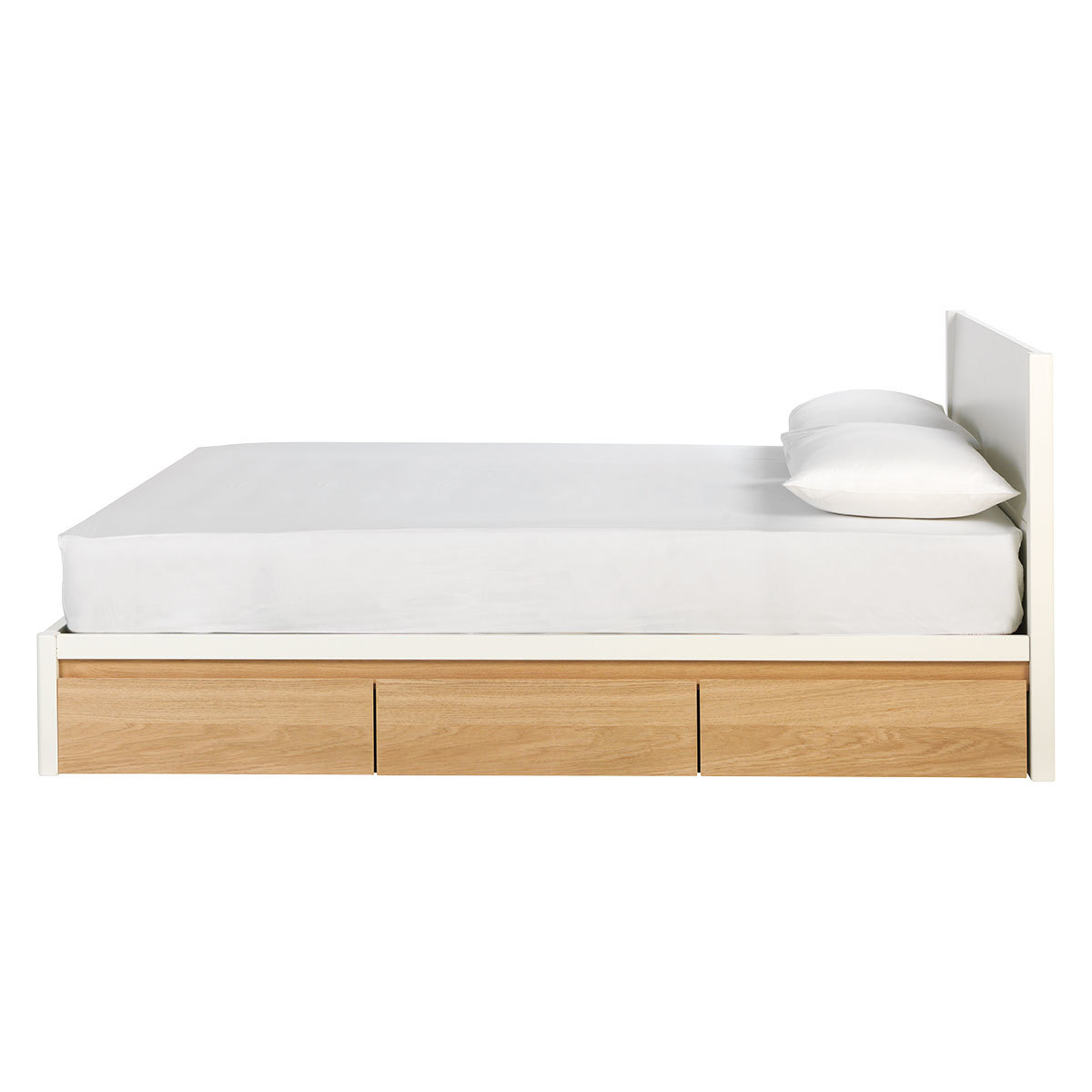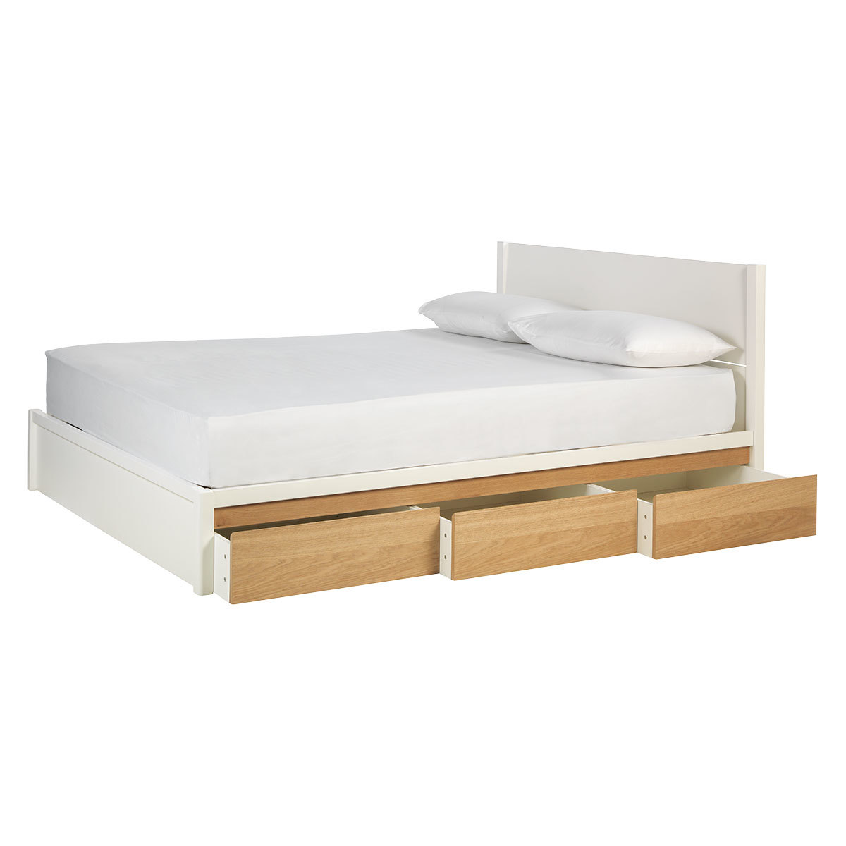 The Bumble white and oak kingsize bed with 6 storage drawers combines a crisp white carcass with warm-toned, beautifully grained veneer. The streamlined bed's capacious drawers hold the equivalent of a large chest of drawers, saving valuable space in small rooms, and have hidden, chamfered handles and wheels for easy access. Also available as a double bed, the Bumble bed has a white-painted headboard and base, and fits a standard UK 150cm kingsize mattress. Designed in house and exclusive to Habitat, the Bumble range includes white and oak bedroom furniture and occasional tables in a choice of colours.