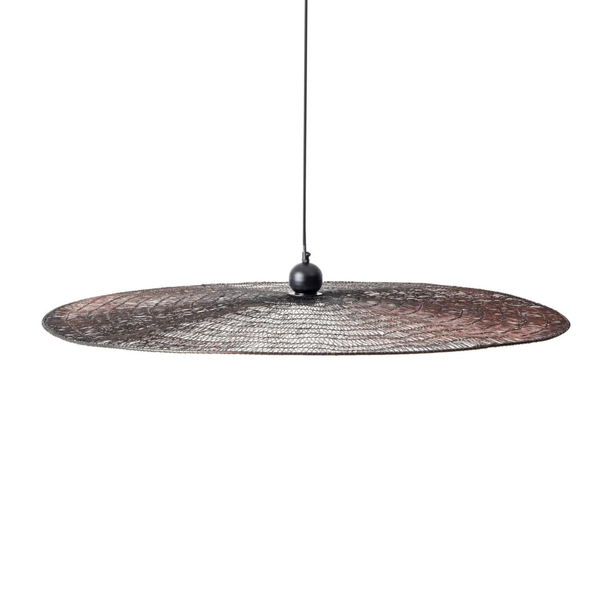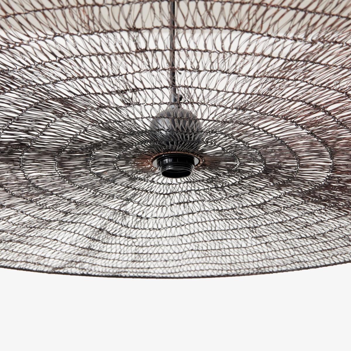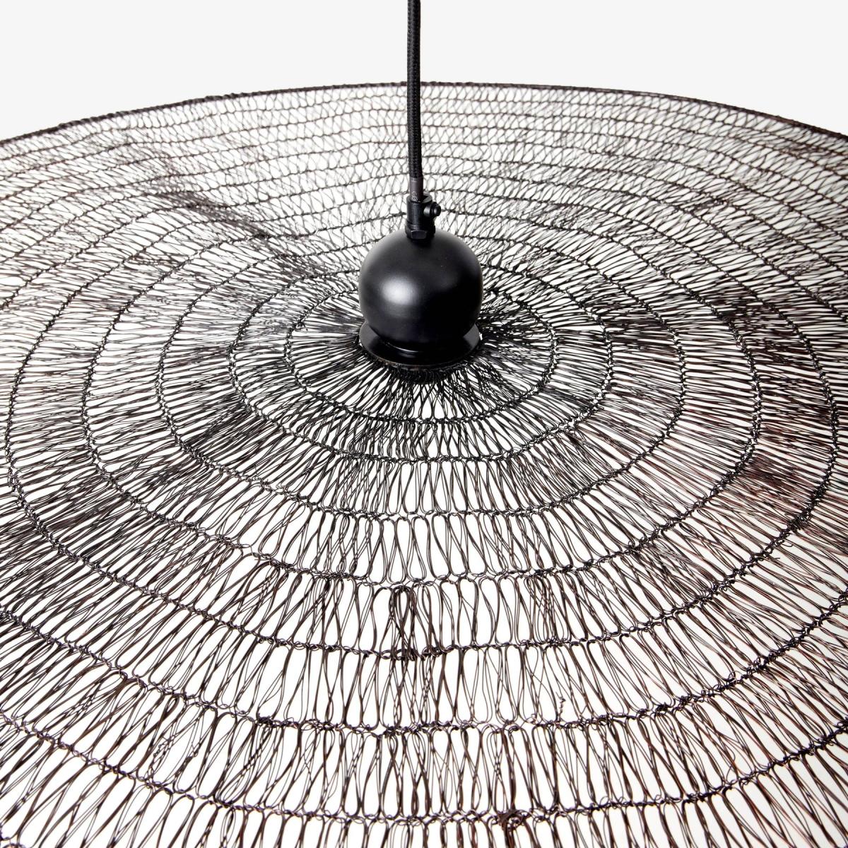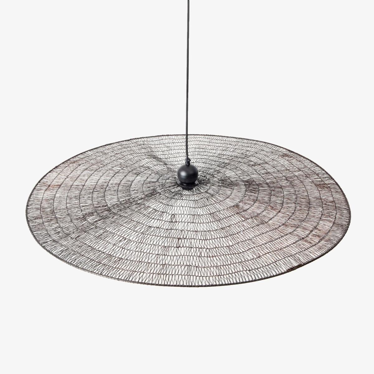 Give your interior a natural touch with our timeless Bunayi pendant lamp. The handmade pendant lamp is made of wire, a durable material, and appears to float in the air. Featuring a flat shape that almost appears to float in midair, this black disc-shaped ceiling pendant evokes nostalgia and earthy aesthetics. This charming bohemian form is achieved by Indian artisans hammering and rolling Bunayi's wire. Providing a sustainable and stylish display, this ceiling pendant would be a great addition to a modern setting.