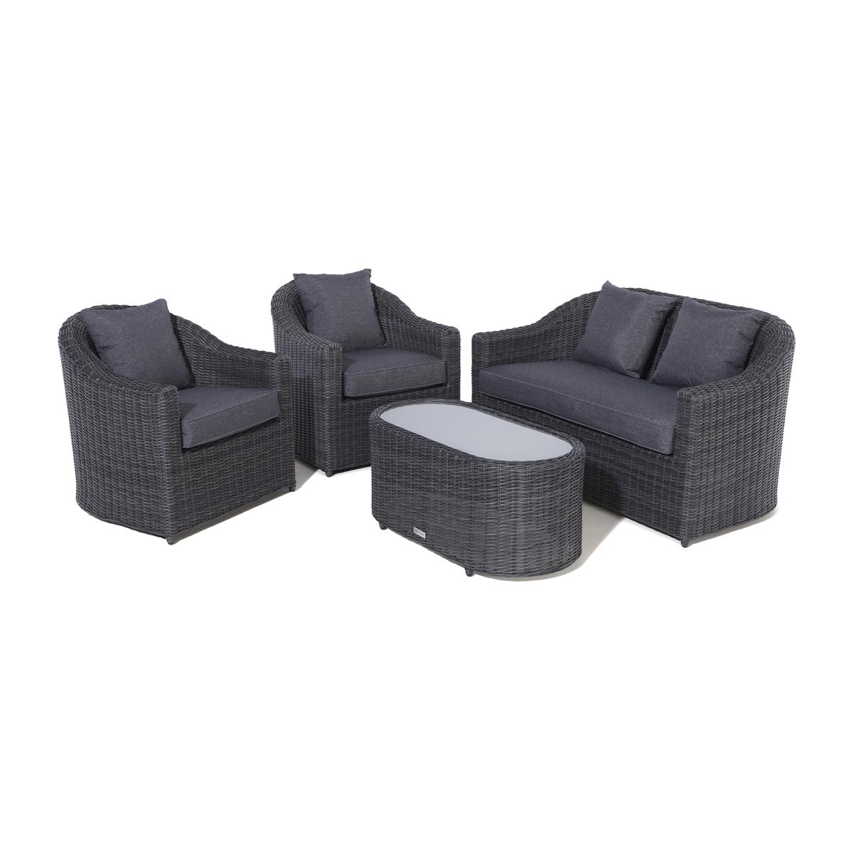The Rowlinson Bunbury Rattan Sofa Set is a contemporary rattan set that will provide a comfortable and attractive seating space in any garden, patio or conservatory. Made up of a sofa and two chairs, complete with plush cushions, as well as an oval table with stylish frosted glass top. Supplied in an modern grey weave and set upon durable aluminium frames, the Bunbury Sofa Set will be an excellent addition to your outdoor seating space. Bunbury Rattan Sofa Set - Grey