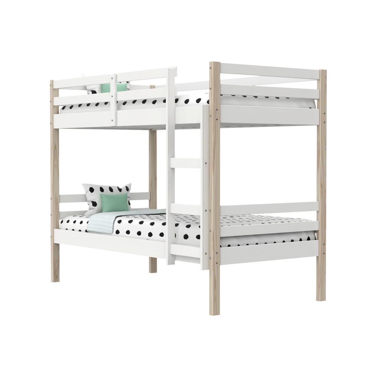 Features we love Unisex design with a white and pine finish. Once outgrown the bunk bed splits into two single beds. Classic bunk bed design with slatted base is timeless. Fits two standard UK single mattress (3ft)Also available in an all-white colour Need to know. Packaging dimensions. Box 1 W29 x D99.4 x H24 cm / Box 2 W23 x D198.4 x H148 cm Packaging weights. Box 1 29.1kg / Box 2 30.3kg Product dimensions. W103.8 x D197.8 x H156 cm Mattress size. Standard UK single (90 x 190cm / 3ft) Max mattress height. 15cm Max weight capacity. 80kg Product weight. 42.2kg Colour. White and natural pine Finish. Painted Material. Solid pine wood Bed base. Wooden slats For use. Indoors Assembly required. Yes Mattresses included. No Please note Mattresses aren’t included so you have the freedom to select the mattresses of your choice