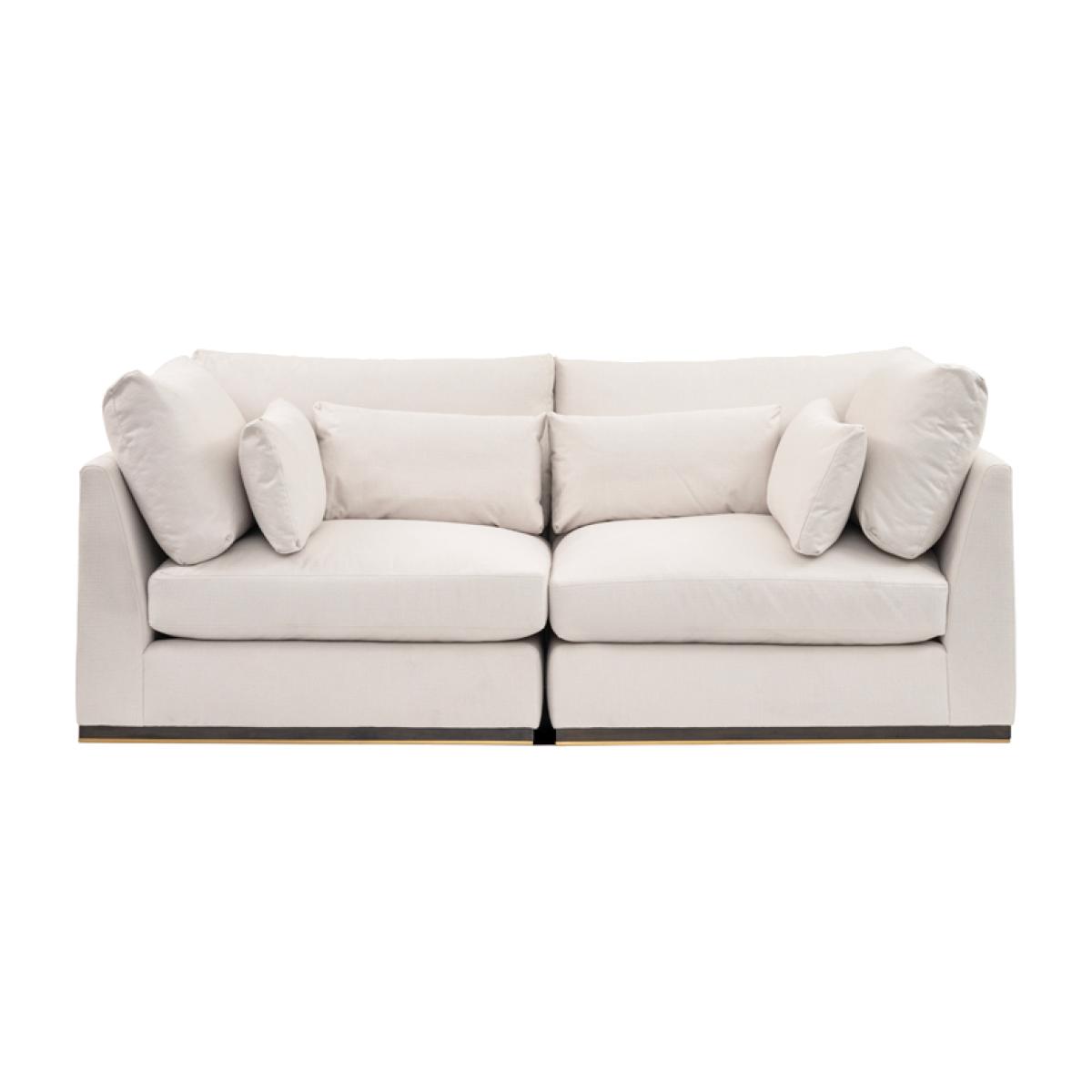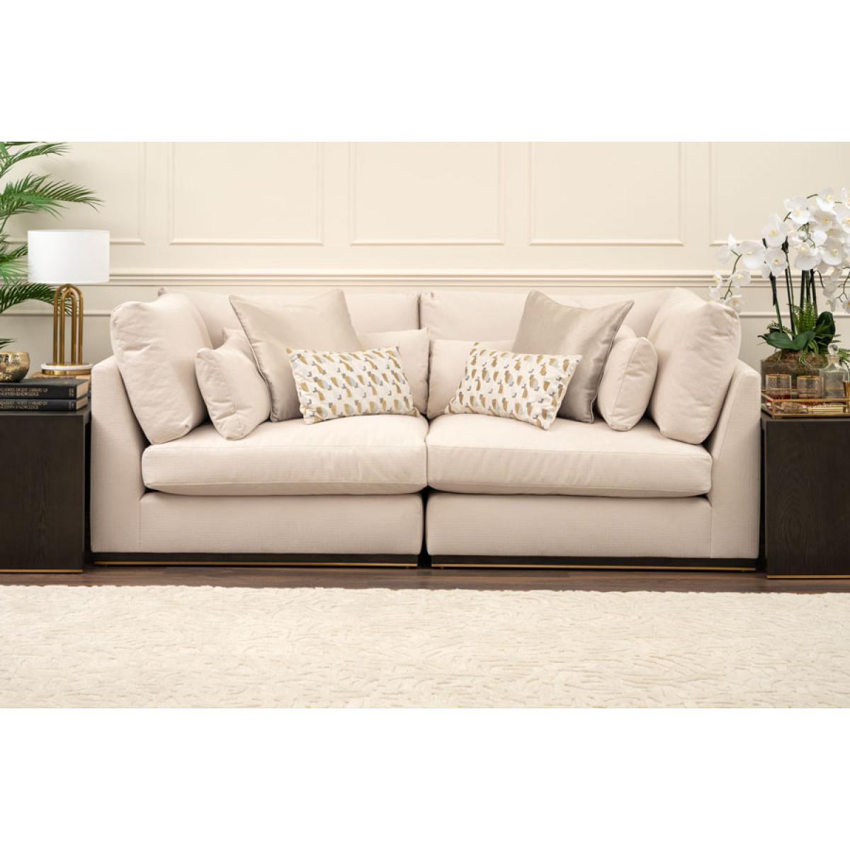 A luxuriously soft, expansive sofa, offering the perfect fusion of comfort and style. Generous deep seat cushions filled with a combination of feather, foam and fibre. Feather and foam-filled back and lumbar cushions. Practical and durable linen effect fabric with a soft, tactile feel. Solid ash base with dark brown finish and brushed brass trim detail. Constructed from modular components that simply and securely connect together, allowing for ease of installation and multiple configurations. Due to the extensive size of this product, please ensure dimensions are carefully checked (of the product, your doorways, hallways, stairs or elevator) prior to ordering to ensure a smooth installation. Free returns on sofas if you change your mind within 7 days, simply notify us, put the sofa back in the box, and we will collect it and send you a full refund. (This offer excludes Scottish Highlands and islands & any Ireland addresses).