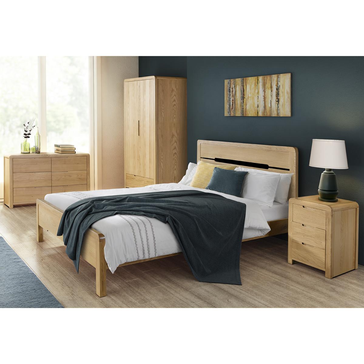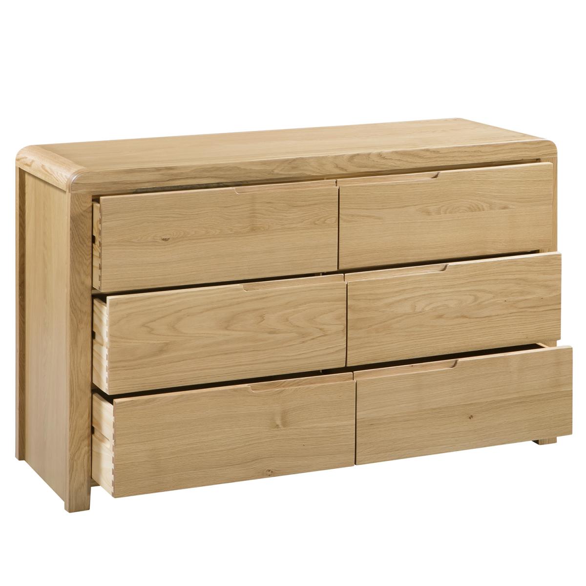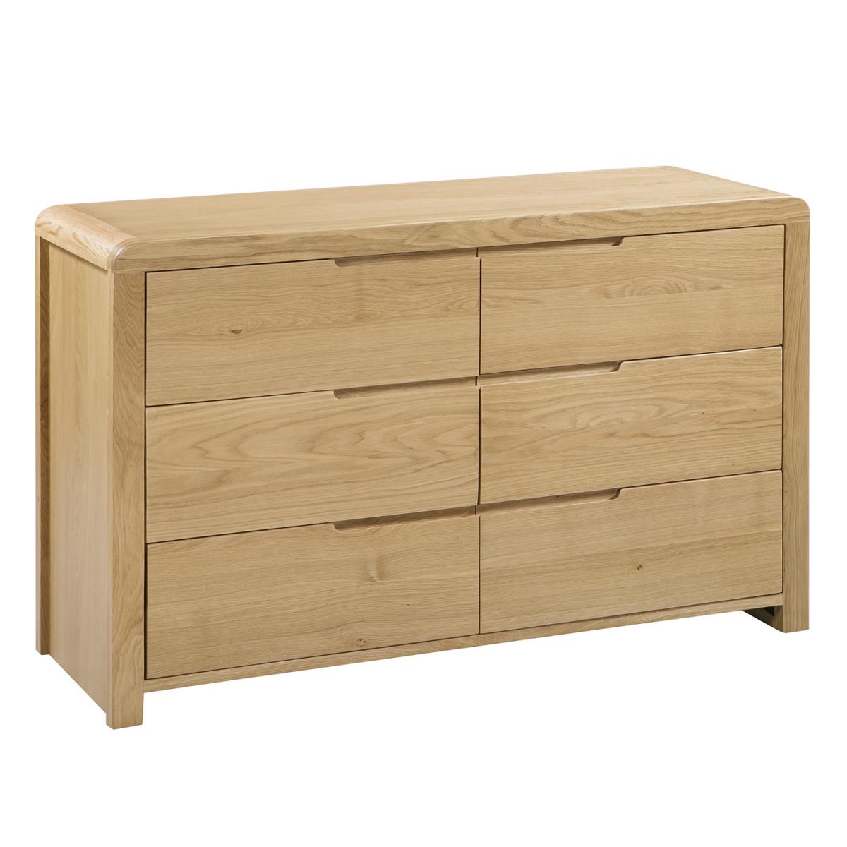 Crafted from solid white oak and oak veneers, this Burford Six Drawer Chest combines clean lines with a gentle curved edging, adding a stunning touch to any bedroom. Designed with recessed handles to enable easy opening, this piece has a stylish modern feel. This wide chest features six large drawers, perfect for extra storage in your home.