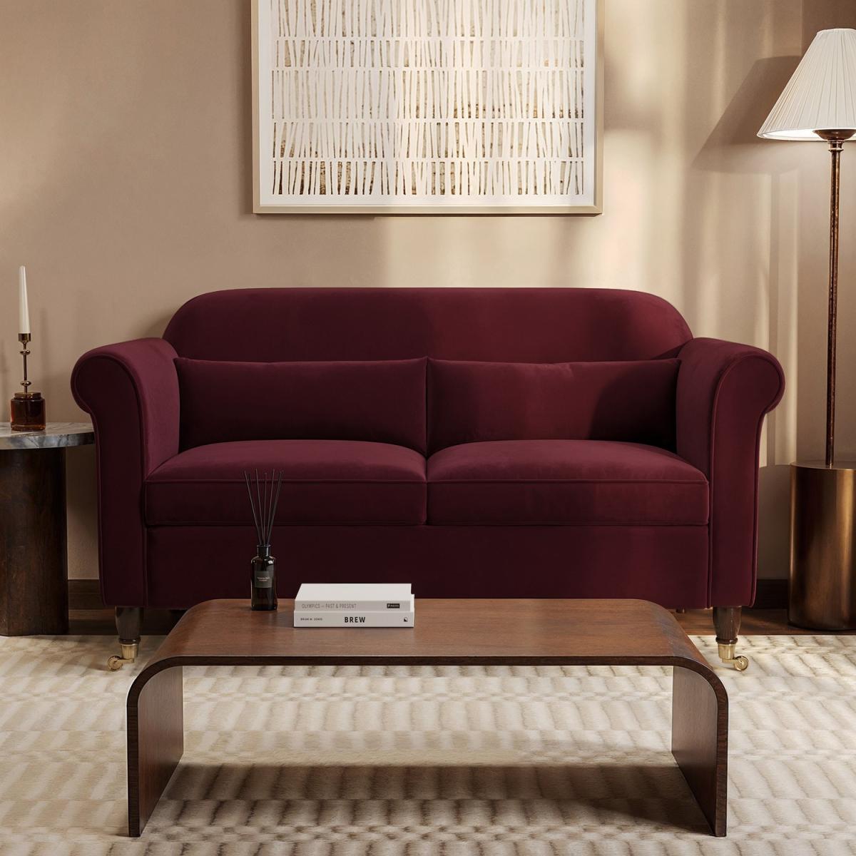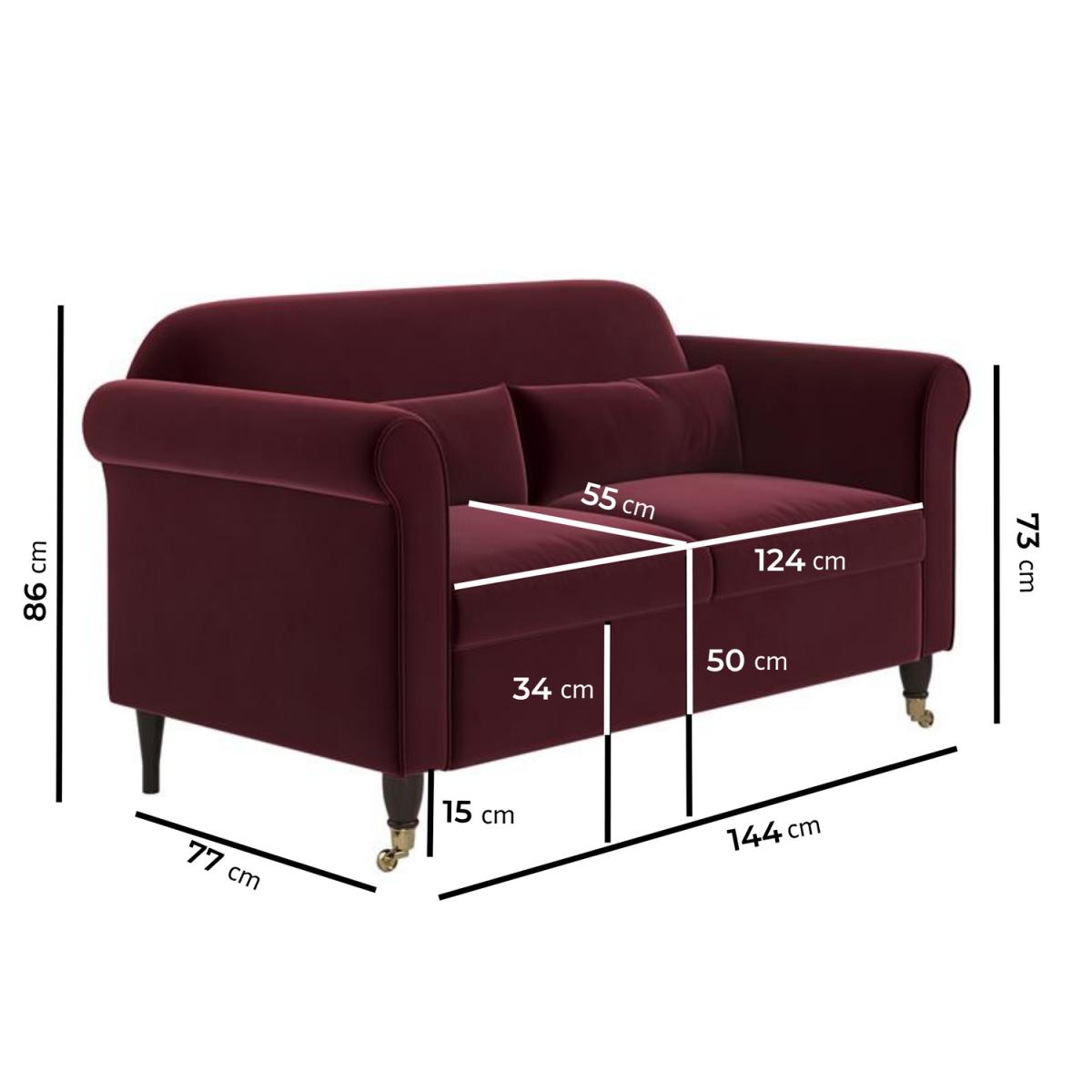 Scatter Cushions Included Finished in a bold yet durable burgundy velvet, Ramona offers both comfort and style, adding a warm and inviting feel to your living space. Features classic scroll arms and turned wooden legs with castors, combining vintage charm with modern practicality. The foam and fibre-filled seats provide exceptional comfort and support, perfect for couples relaxation. Complete with coordinating scatter cushions that complement the overall design, enhancing both comfort and style. Removable cushion covers make cleaning and maintenance a breeze, ensuring lasting beauty and functionality. The Ramona traditional 2-seater sofa in burgundy velvet brings a timeless elegance to any living room. Upholstered in bold yet elegant burgundy velvet, Ramona offers both warmth and sophistication, making it an inviting centrepiece for your space. With classic scroll arms and turned wooden legs with castors, it blends traditional charm with modern touches. The foam and fibre-filled seats ensure long-lasting comfort and support, while the removable cushion covers make cleaning easy. Perfect for couples, the Ramona sofa adds character and comfort, making it an ideal choice for any home.