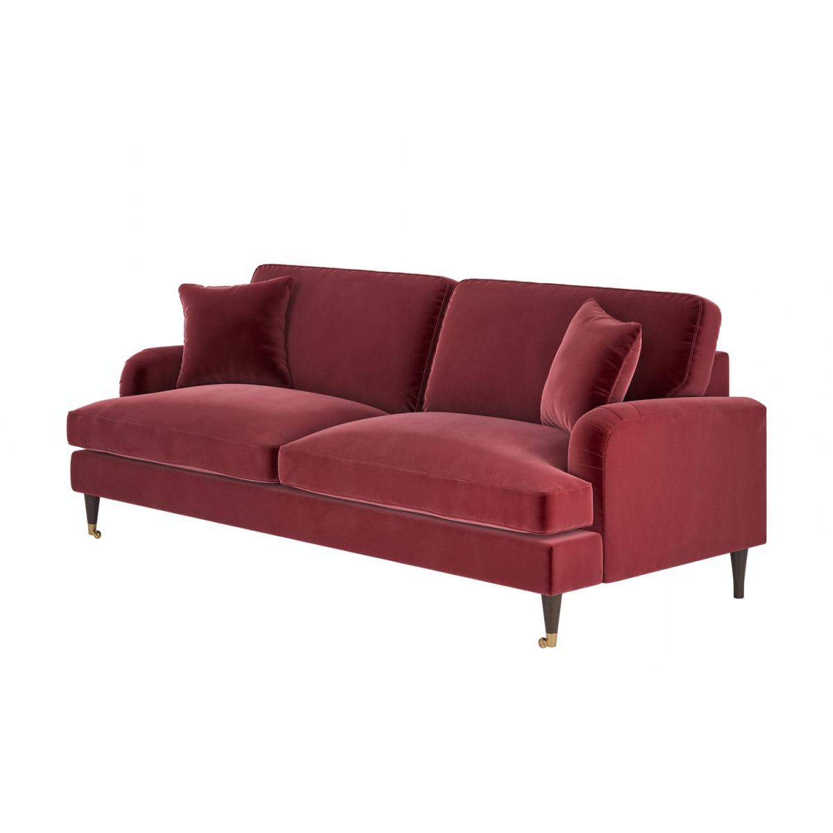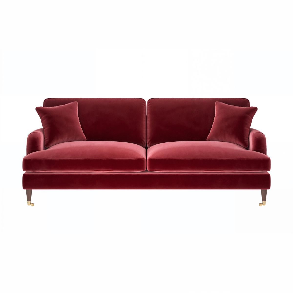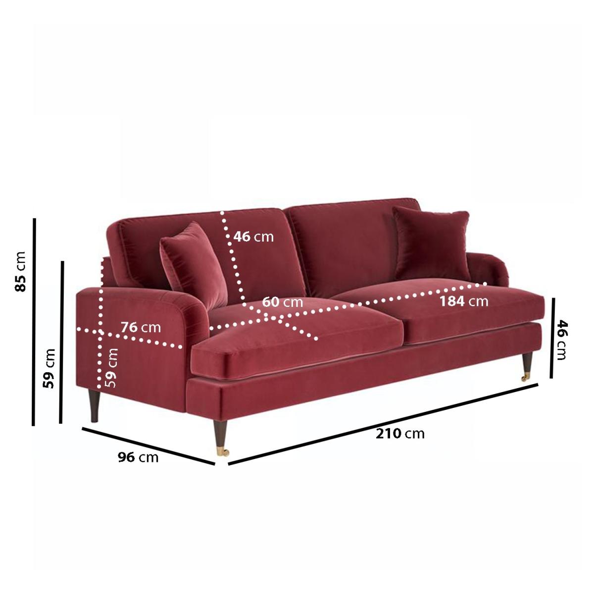 Foam filled Reversible Back Cushions Alternative leg options available Scatter Cushions Included With its classic ruched saddle arms and elegant silhouette, the Payton 4-Seater Sofa brings a touch of traditional charm to any interior. The refined detailing makes it a statement piece in any living space. Designed to seat four people comfortably, this sofa offers generous space for family gatherings, entertaining guests, or cosy nights in. The plush cushions provide deep, luxurious seating, making it an inviting centrepiece for any home. Crafted from high-quality solid wood, this sofa is built to last, providing strong and reliable support for years to come. The sturdy construction ensures everyday durability, making it a practical investment for your living space. The dark oak legs add a sophisticated touch, while the gold castors provide both aesthetic appeal and functional mobility. The castors make it easy to reposition the sofa without compromising stability. Upholstered in a high-quality and vibrant burgundy velvet fabric, the Payton Sofa is soft to the touch, offering a comfortable and inviting seating experience. The bold red tone complements a variety of colour palettes, making it easy to integrate into any home. Whether used in a formal sitting area, a cosy living room, or an open-plan space, this sofa offers a blend of style, comfort, and practicality, making it ideal for families, couples, or entertaining guests. The Payton 4-Seater Sofa is the perfect blend of traditional elegance and modern comfort. Designed to accommodate four people comfortably, this spacious sofa offers a timeless aesthetic with ruched saddle arms, adding a touch of classic charm. Upholstered in high-quality burgundy velvet fabric, the versatile dark red tone effortlessly complements any interior style. Built with a solid wood frame, this sofa is designed for durability and long-lasting support. The oak legs with gold castors provide a sleek and stylish contrast, elevating the look while ensuring easy manoeuvrability. For added personalisation, light oak legs are available as an alternative, allowing you to tailor the sofa to your décor preferences. Comfort is key, and the removable back and seat cushions ensure plush seating and easy maintenance. Two matching scatter cushions add extra cosiness and style, making it an inviting centrepiece for your living space. With simple assembly required—just attach the legs—this sofa is a practical, stylish, and long-lasting addition to any home. Dimensions: W210 x D96 x H85 cm Weight: 54 kg Max supported weight: 100 kg per seat Seats: 4 people Colour: Burgundy Finish: Upholstered Material: Velvet Frame: Solid plywood and eucalyptus wood Assembly required: Yes - just attach the legs Packaging dimensions: W212 x D98 x H61 cm