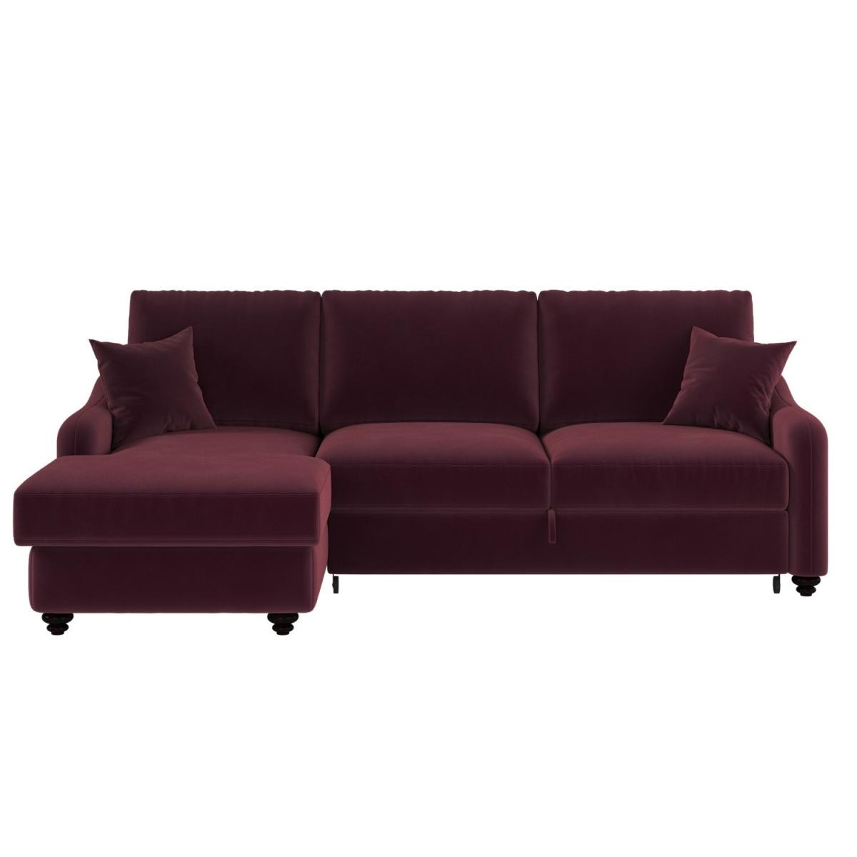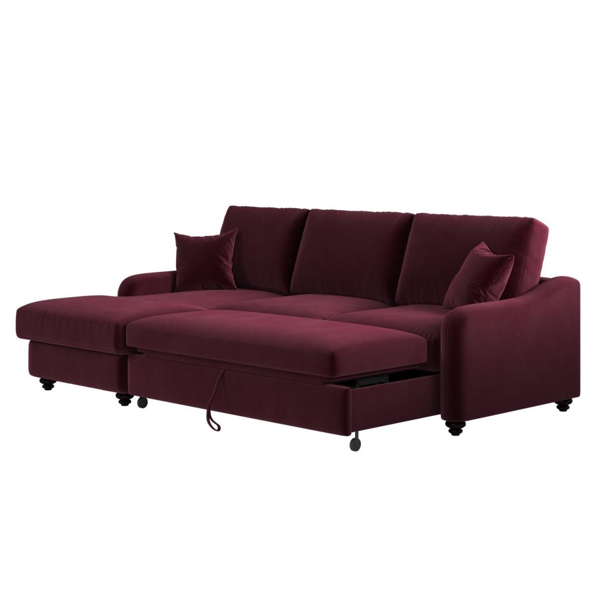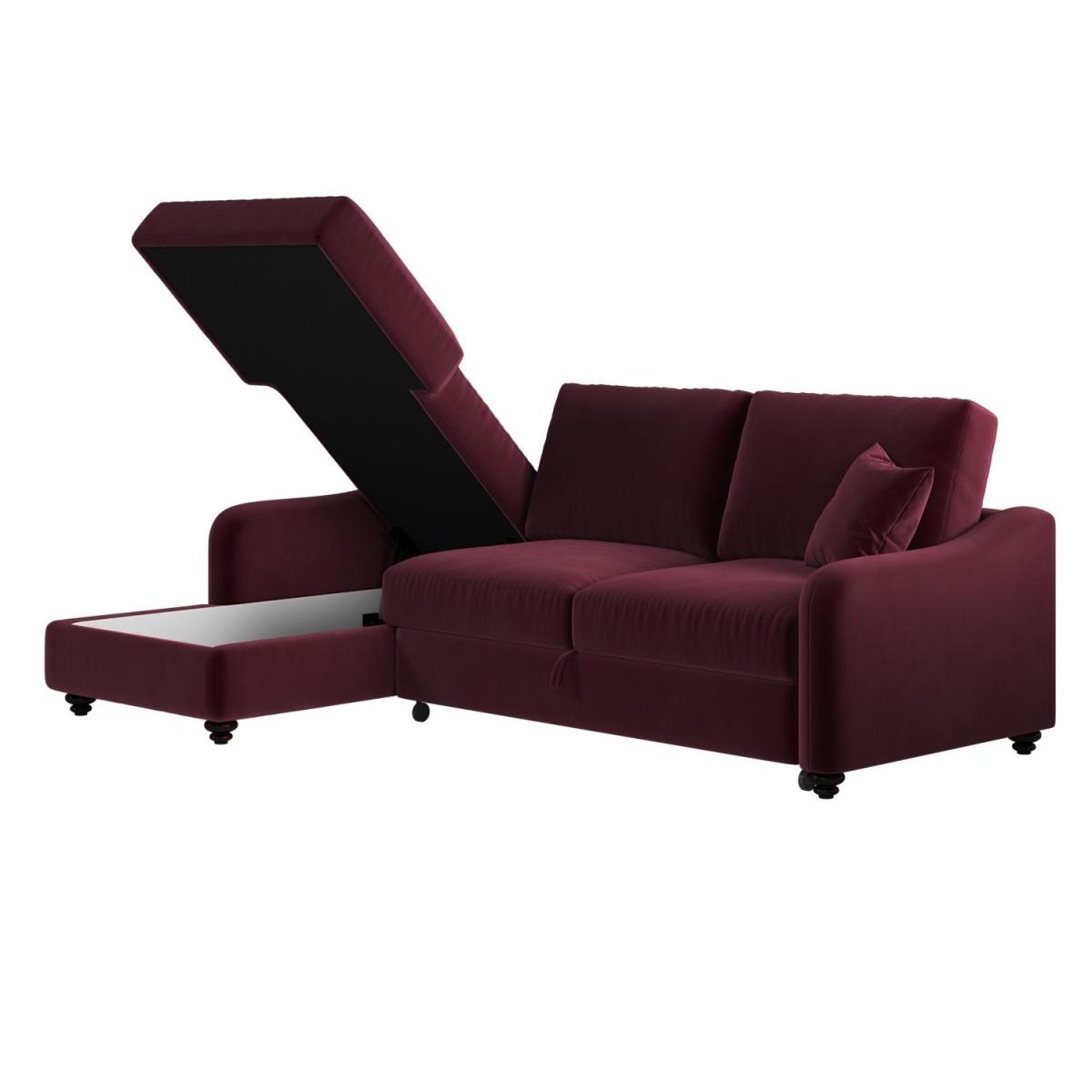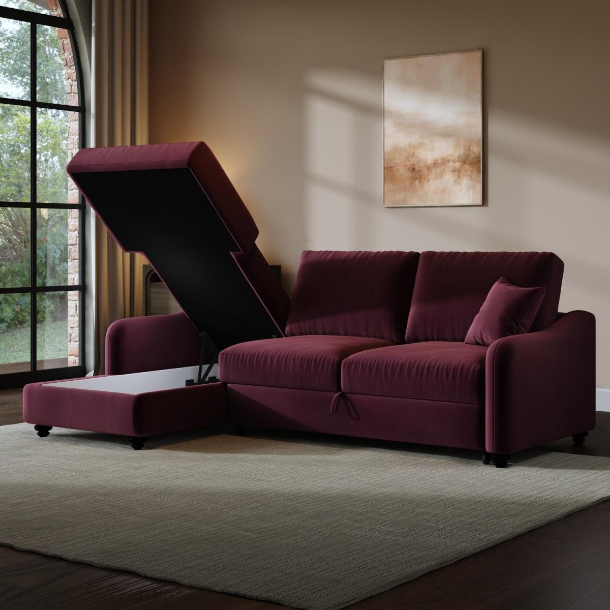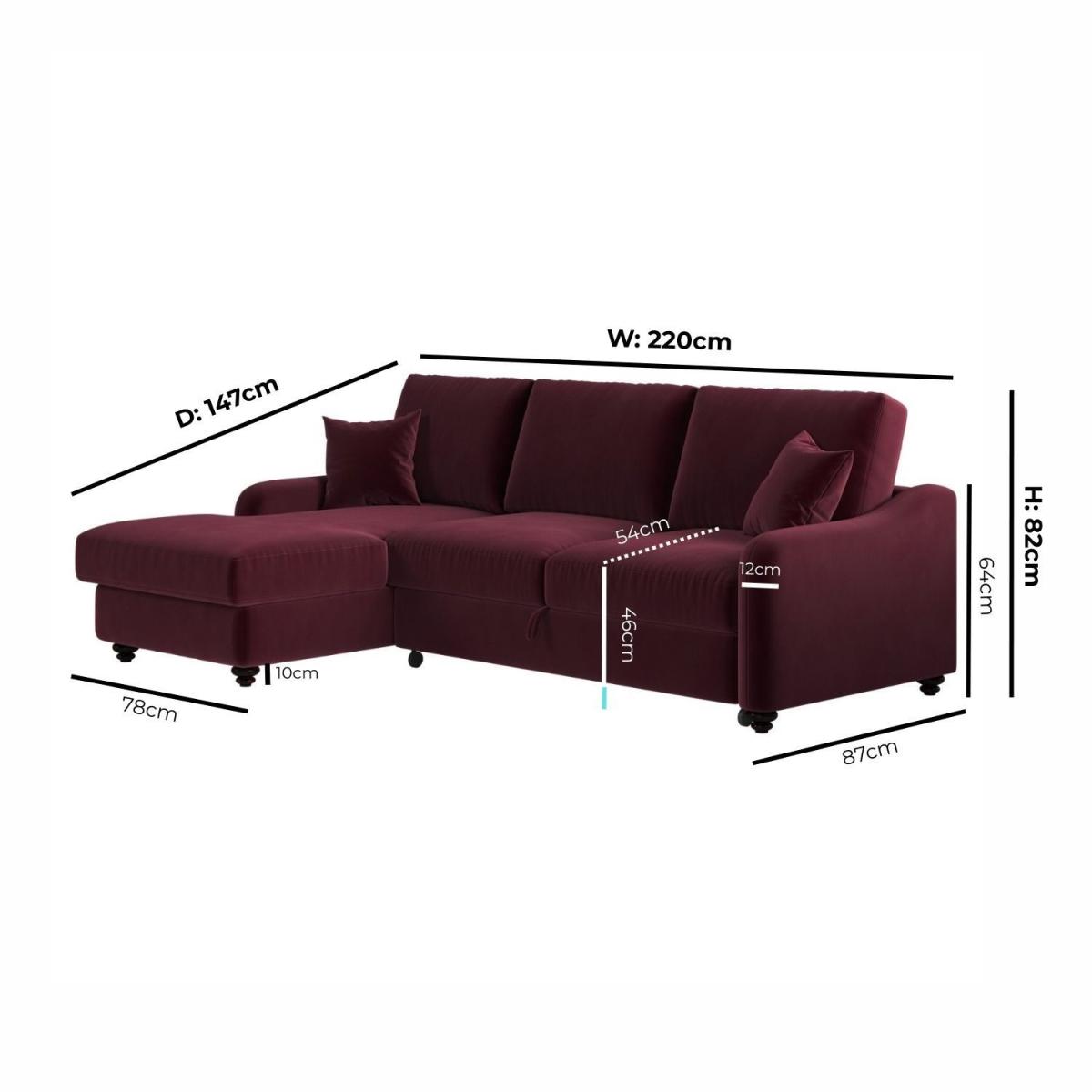 Foam filled Upholstered in rich burgundy velvet, it adds a bold, elegant statement to your living space while remaining timeless and versatile. Generously seats up to four people, perfect for lounging or relaxing with family and friends. The built-in compartment under the chaise keeps extra bedding, pillows, or blankets neatly stored and out of sight. The smooth pull-out mechanism allows you to convert the sofa into a cosy bed in seconds, perfect for accommodating overnight guests. Reversible and removable back and scatter cushions make it easy to plump and maintain for maximum comfort. Comes with two matching scatter cushions for added support and style. Elevate your living space with the Quinn Right-Hand Chaise Sofa Bed – a luxurious fusion of comfort, style, and functionality. Upholstered in rich burgundy velvet, it brings an elegant, refined touch to any room. Designed to seat four comfortably, it offers generous space for lounging during the day and easily converts into a cosy bed at night, making it perfect for hosting overnight guests. The smooth pull-out mechanism ensures a hassle-free transition, while the hidden storage beneath the chaise keeps bedding and blankets neatly tucked away.
