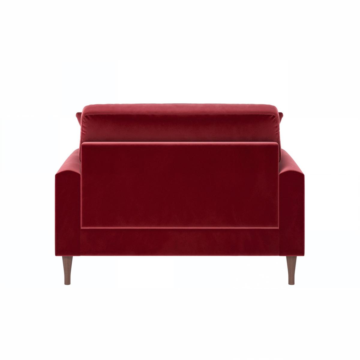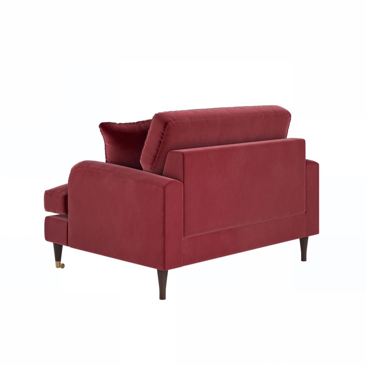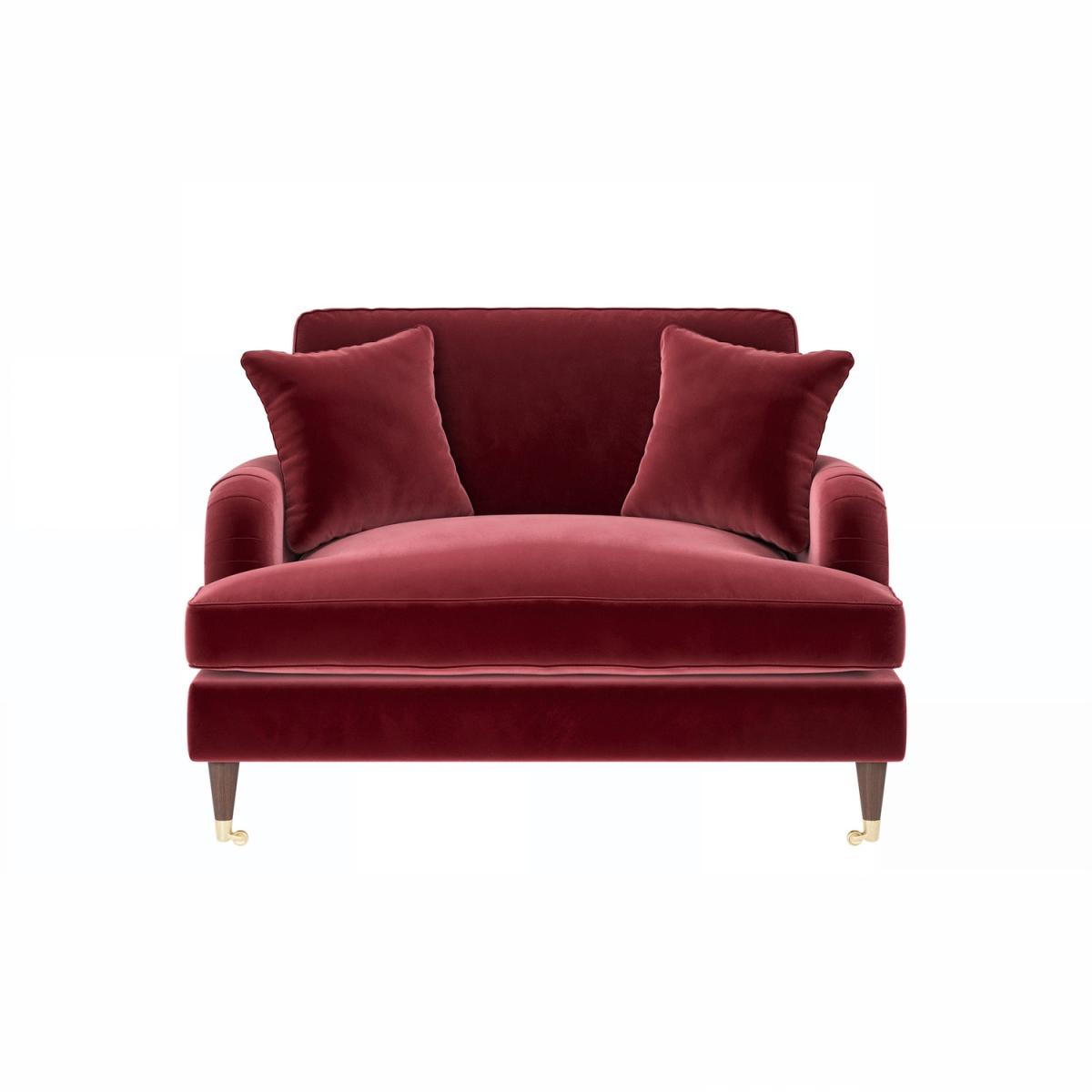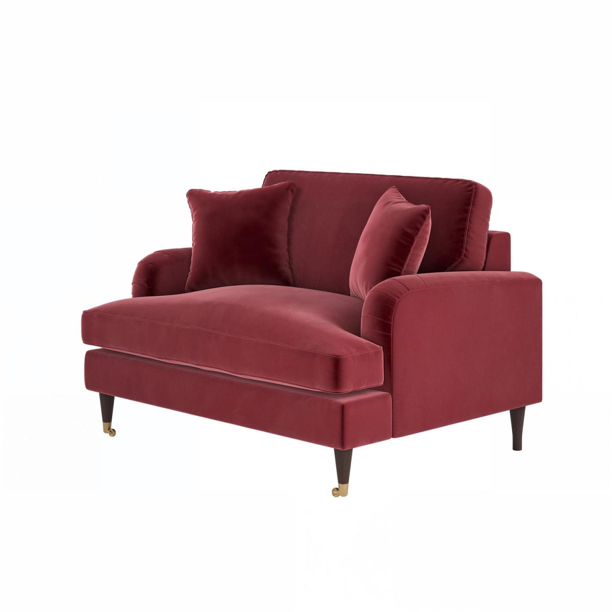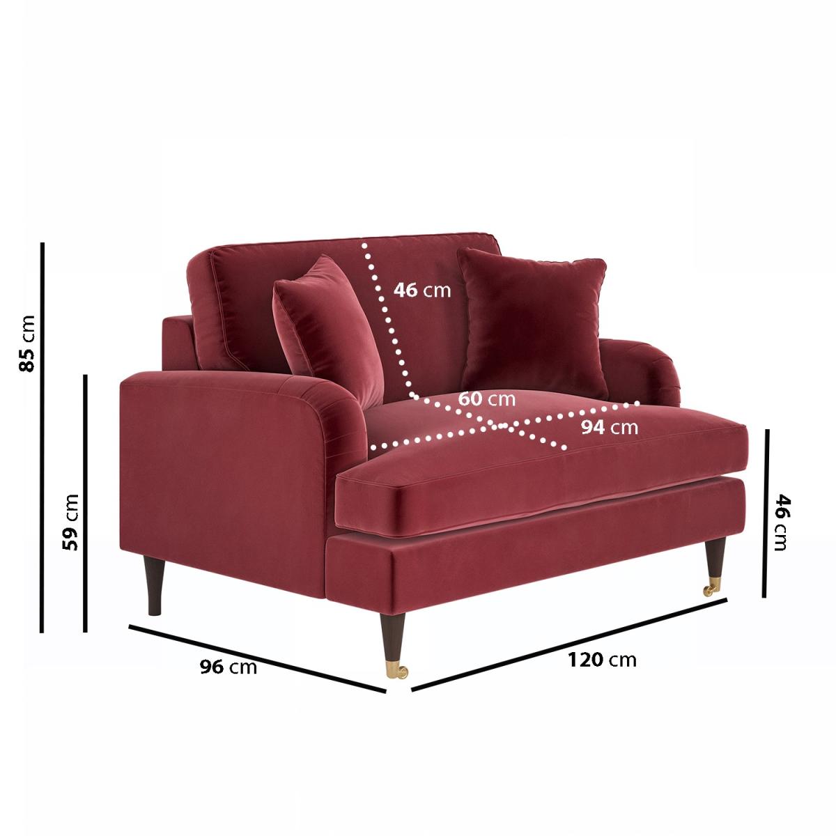 Sink into comfort with the Payton Burgundy Velvet Love Seat. Designed for two, this spacious cuddle chair is perfect for cosy nights in, whether you’re relaxing alone or cuddling up with a loved one. Upholstered in a rich and vibrant burgundy velvet, this love seat brings warmth and a splash of colour to your space. Its deep, plush cushions offer a soft, inviting feel, making it the perfect statement piece for your living room or bedroom. Comes with two matching throw cushions to help customise your seating position for optimum relaxation. Whether you prefer extra support or a laid-back lounging experience, this love seat adapts to your needs. The front legs feature castor wheels, allowing you to reposition the loveseat with ease. The sturdy back legs ensure it stays firmly in place once positioned. The castor wheels are fixed and cannot be removed. Crafted with a solid timber frame and high-quality materials, this traditional love seat is designed for long-lasting durability. It’s an investment in both style and comfort. Sink into the ultimate snuggle spot with our Payton cuddle chair, perfect for two people to cuddle up together. It comes with two matching throw cushions to help tailor your seating position for optimum comfort. The front legs feature castors for added charm and easy movement, while the back legs hold it in place. The castor wheels can't be removed from the legs. Check out our upholstery care kit to keep your love seat in tip-top condition. Light wood legs are available to purchase on this armchair; just add yours from our package deals, recommended accessories or at checkout. This Payton range comes with dark oak legs as standard. Dimensions:W120 x D96 x H85 cm Packaging dimensions:W122 x D98 x H61 cm Weight: 42 kg Maximum supported weight: 150 kg Seats: 2 people Colour: Burgundy Finish: Upholstered Material: Velvet fabric 100% polyester, wooden frame and legs Filling: Foam Assembly required: Yes - just attach the legs Removable castor wheels:No