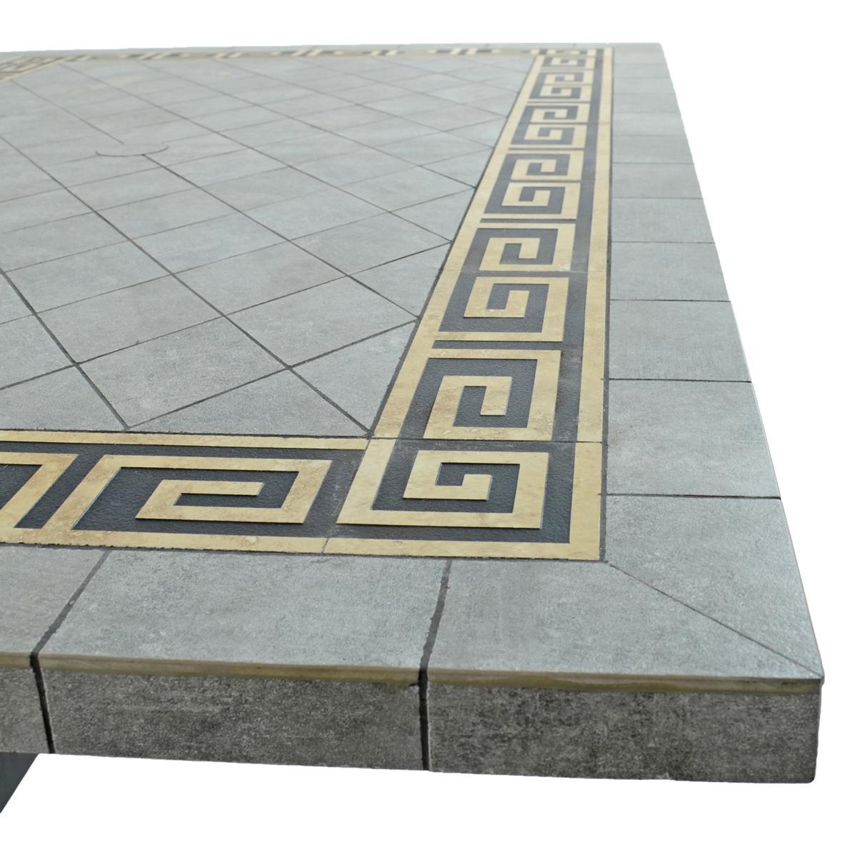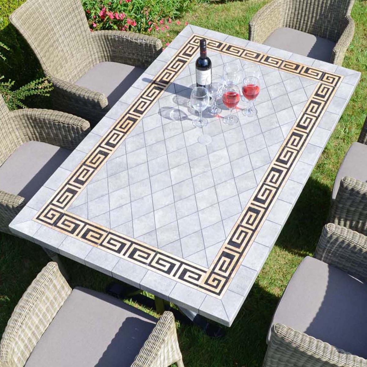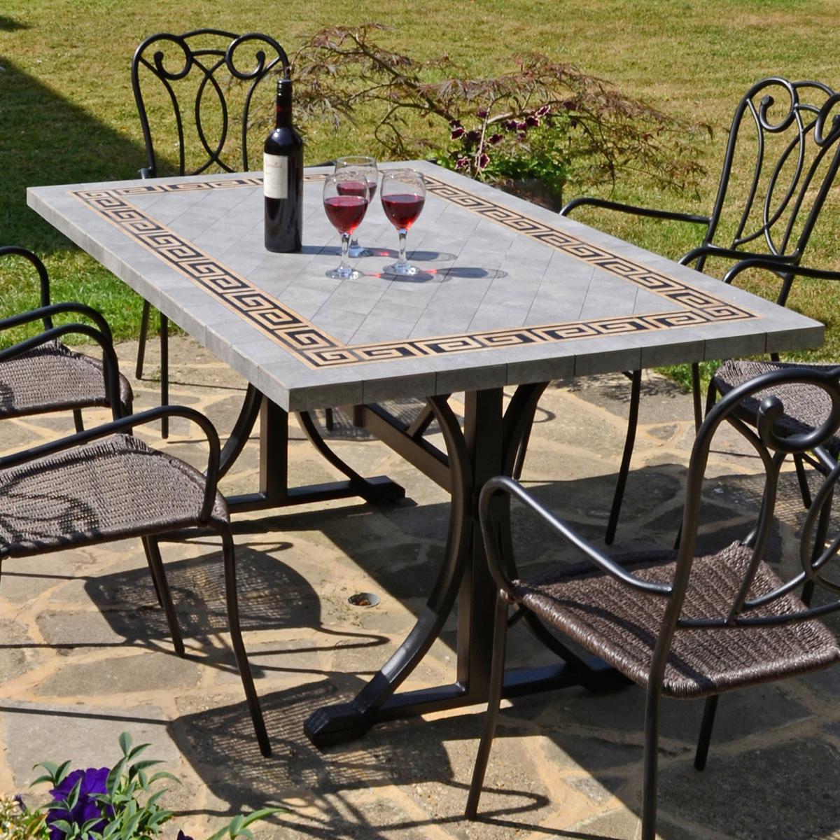This stunning and stately 6 seat dining table features smooth ceramic hand-laid tiles on both its top and edge. The heavy table top is supported by strong steel legs which are powder coated black leaving a smooth and slightly glossed finish. The Ascot Chairs are a deep-seated stacking chair that has a robust frame and the decorative ornate backrest that would look great alongside any grandiose table either indoors or outside. The black finish is slightly glossy and helps to protect from the elements. The chairs also feature slightly textured cushions. This set requires minimal assembly, simply attach legs to the brace and then the whole leg set to the top using enclosed Allen key and fittings.