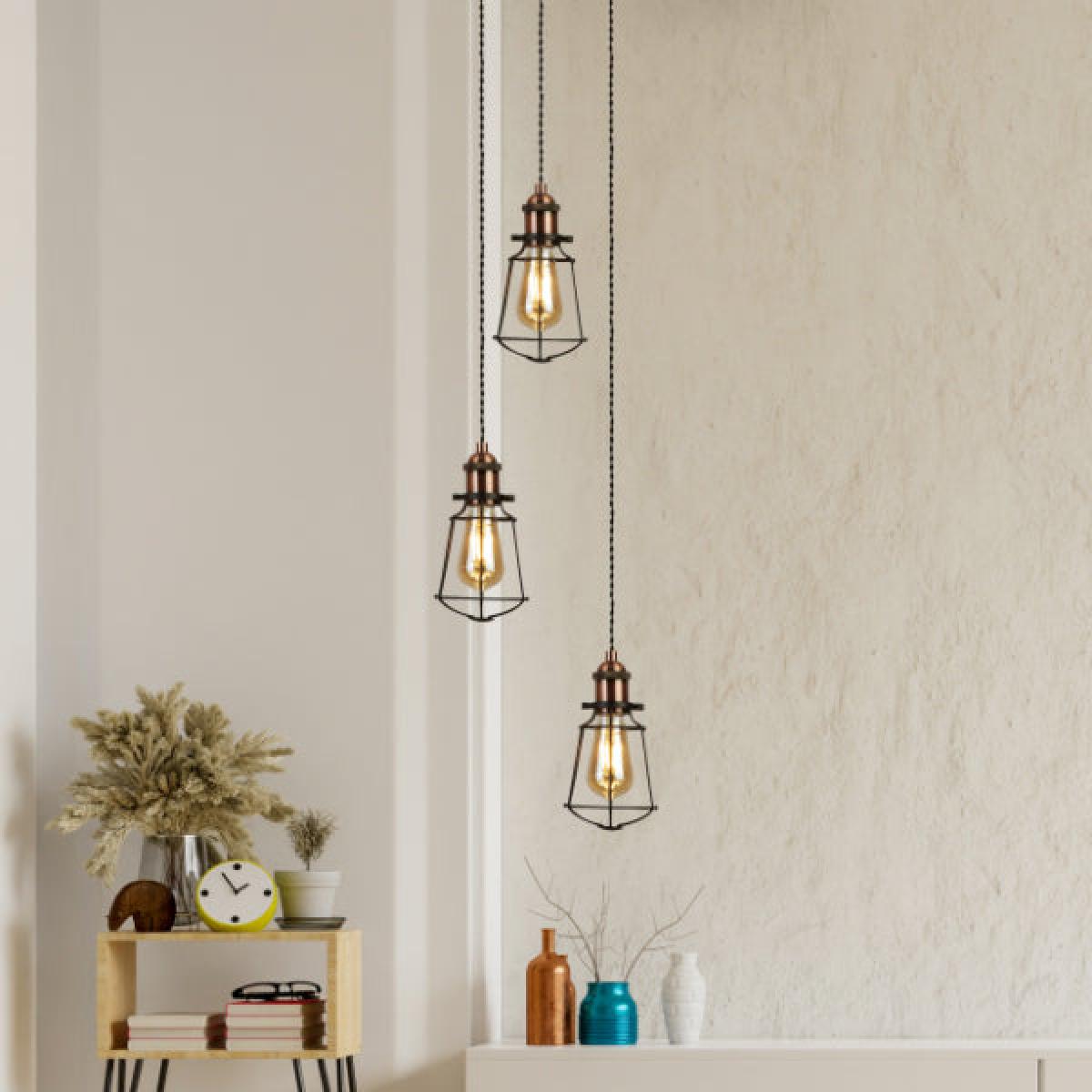 Contemporary 3 light pendant ceiling light boasting a black finish. A modern addition to your living space, the Burns 3 Light is a stylish piece, exclusive to Pagazzi. Boasting three cascading wire shades with a matt black finish, it comes complete with antique copper detailing. Height adjustable by altering the length or the black twisted fabric flex, it is perfect for use above your dining table, breakfast bar and hallway. Need Bulbs? Pair this light with our 4w LED Vintage bulbs for a rustic and industrial glow to compliment the copper detailing. Contemporary 3 light pendant ceiling light boasting a black finish. A modern addition to your living space, the Burns 3 Light is a stylish piece, exclusive to Pagazzi. Boasting three cascading wire shades with a matt black finish, it comes complete with antique copper detailing. Height adjustable by altering the length or the black twisted fabric flex, it is perfect for use above your dining table, breakfast bar and hallway. Need Bulbs? Pair this light with our 4w LED Vintage bulbs for a rustic and industrial glow to compliment the copper detailing.