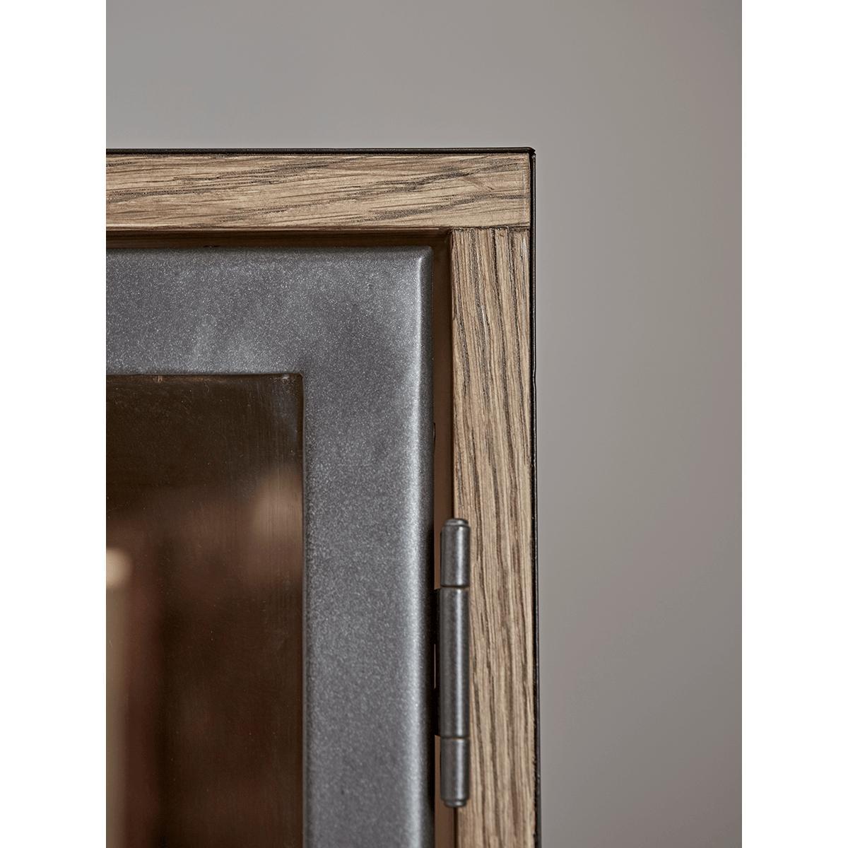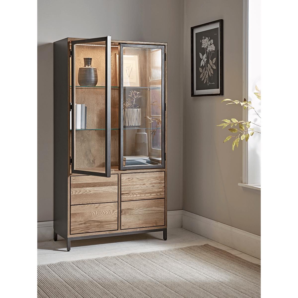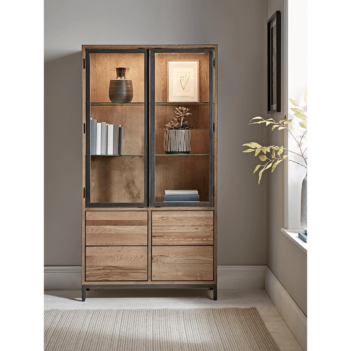 Perfect for displaying a variety of decorative accessories illuminated by a central light,our simple but impactful oak cabinet has iron-framed doors for a touch of industrial style. The glazed shelving behind lightens the piece, and the warm, natural appearance of the oak softens.