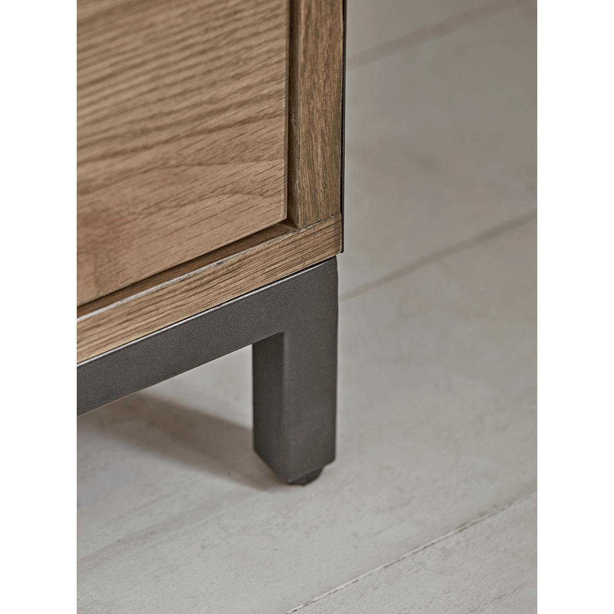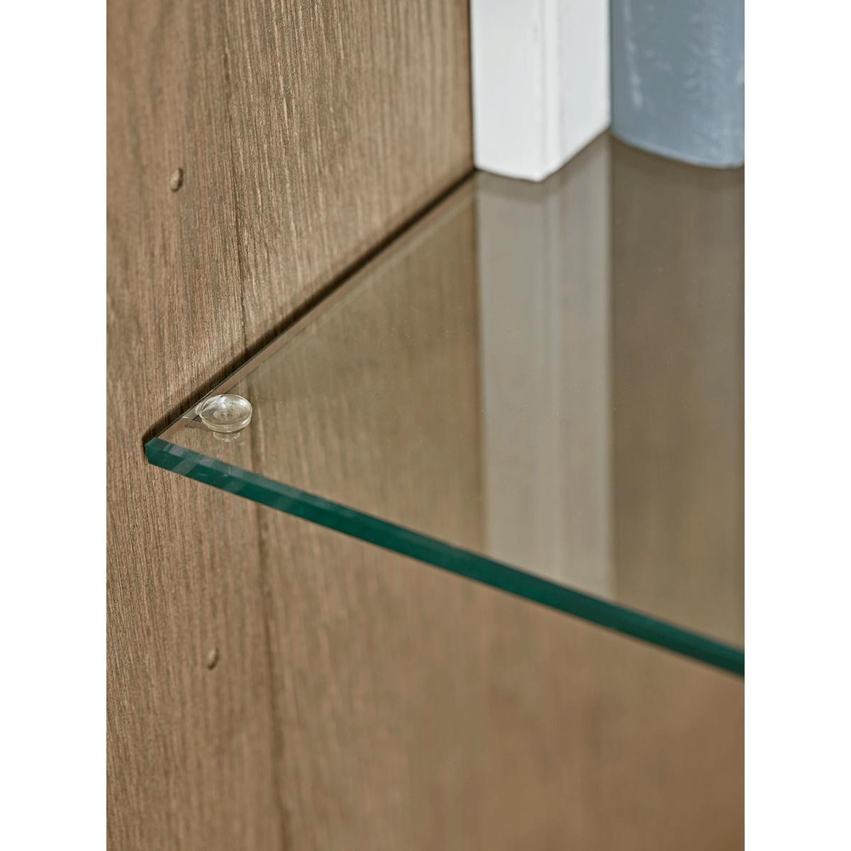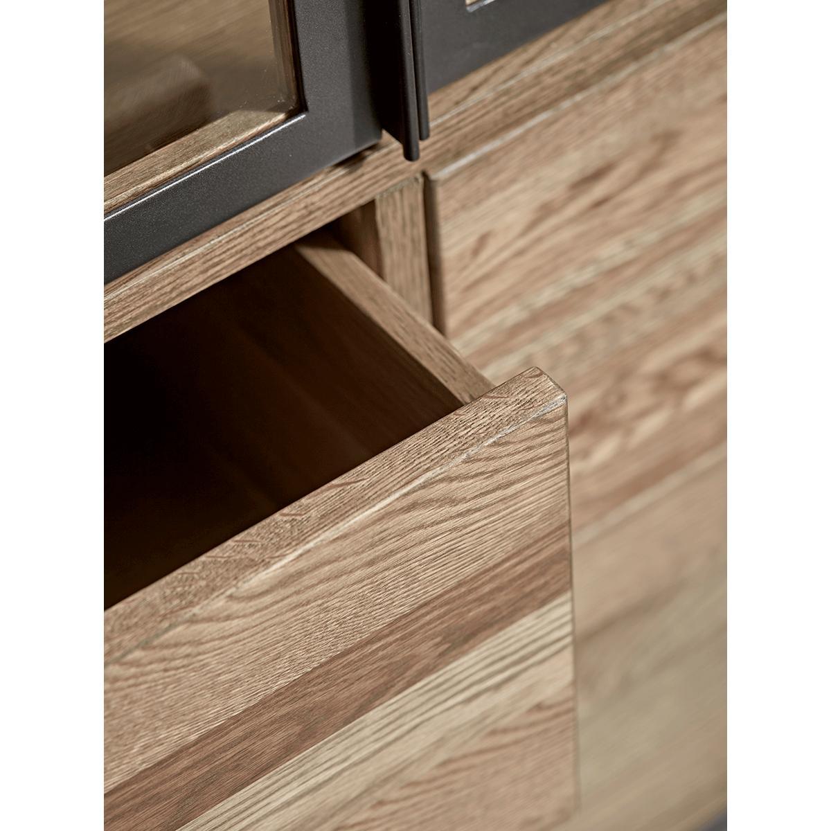 Perfect for displaying a variety of decorative accessories illuminated by a central light,our simple but impactful oak cabinet has iron-framed doors for a touch of industrial style. The glazed shelving behind lightens the piece, and the warm, natural appearance of the oak softens.