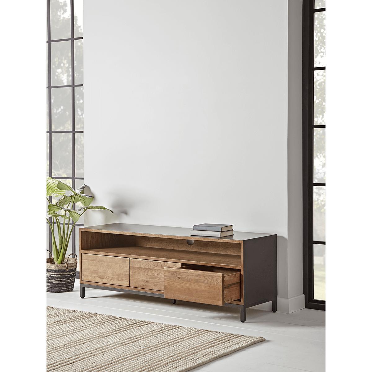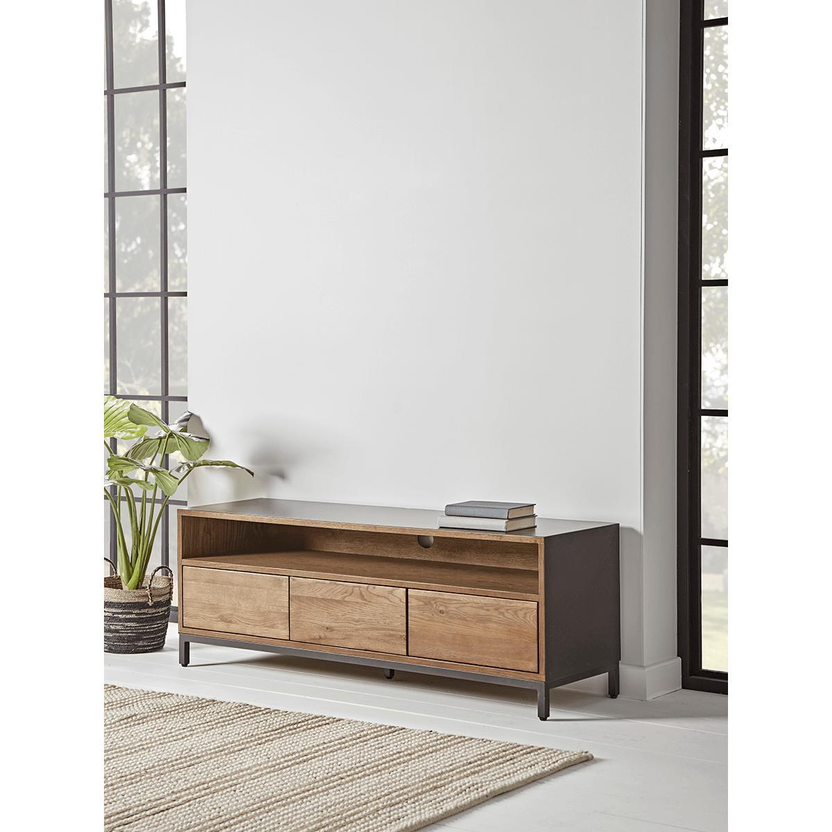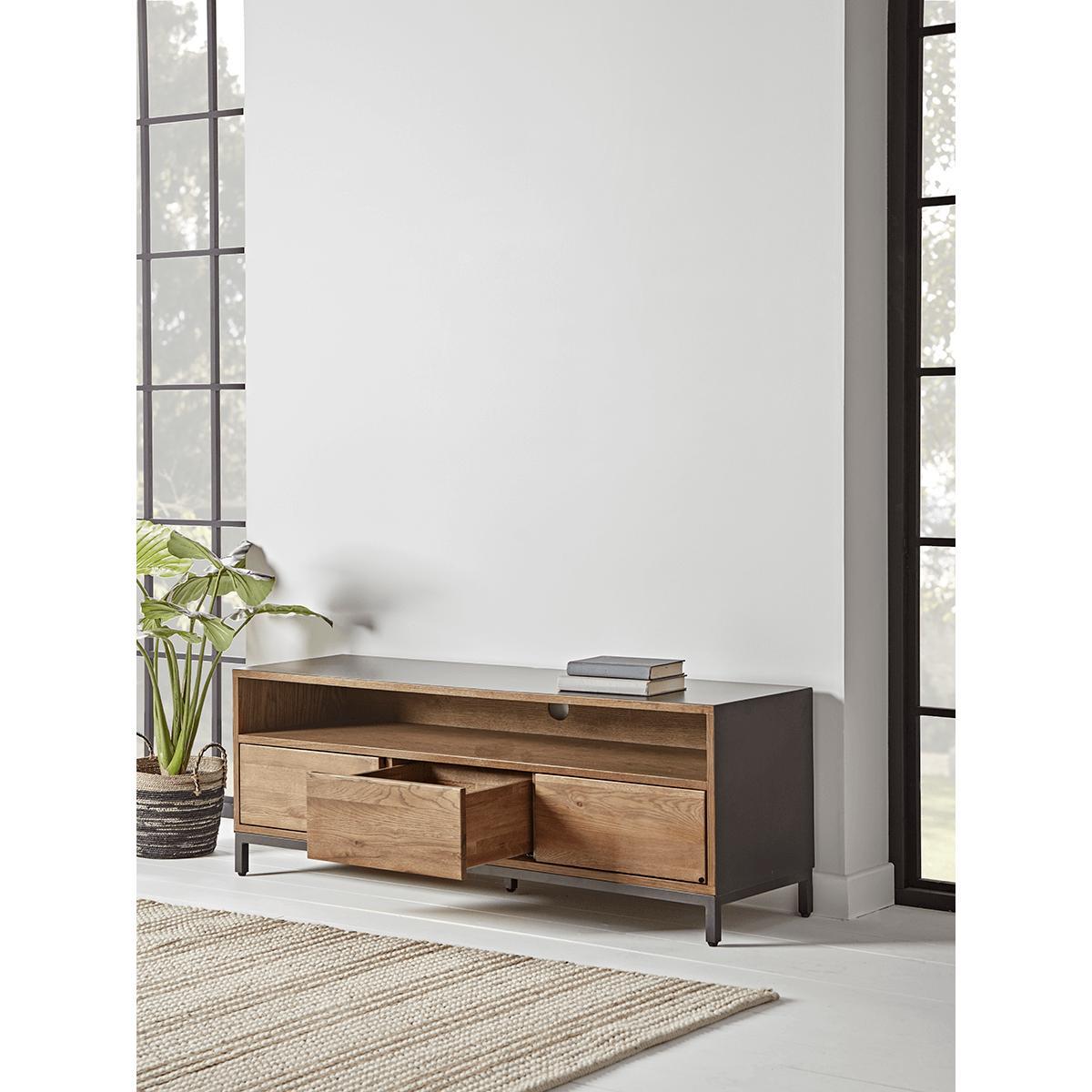 Full of modern loft-living style, the clean aesthetic of our range is most impactful, and it really showcases the natural rich tones of the oak. A black finished metal top and sides nod to industrial style, and a central shelf and three lower drawers provide ample space to store entertainment boxes, devices and DVDs out of view.