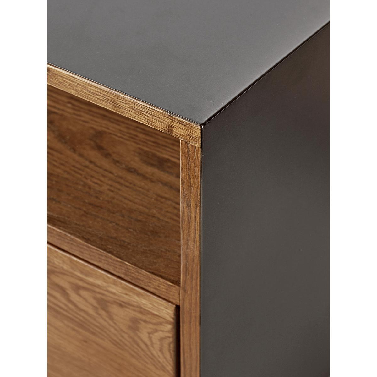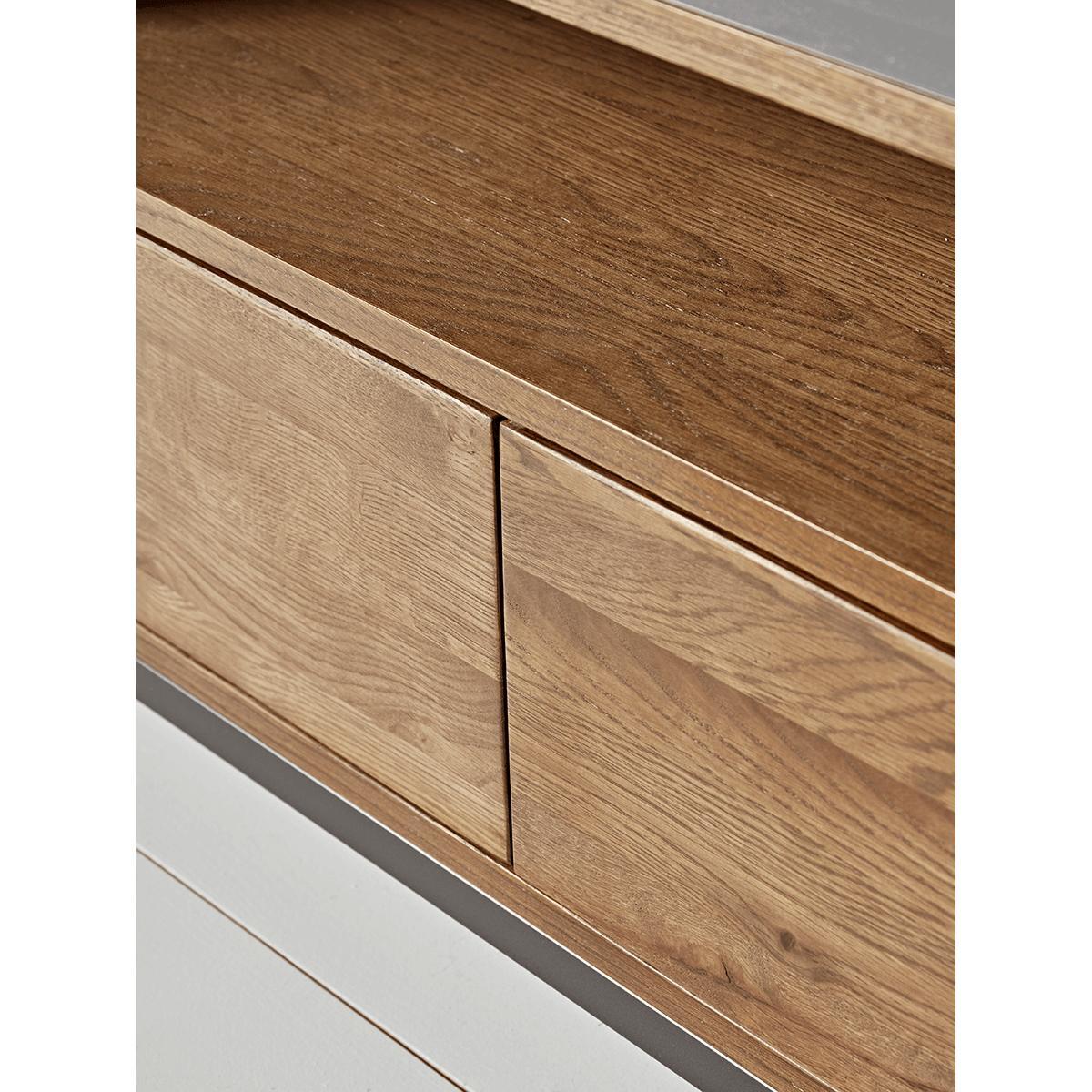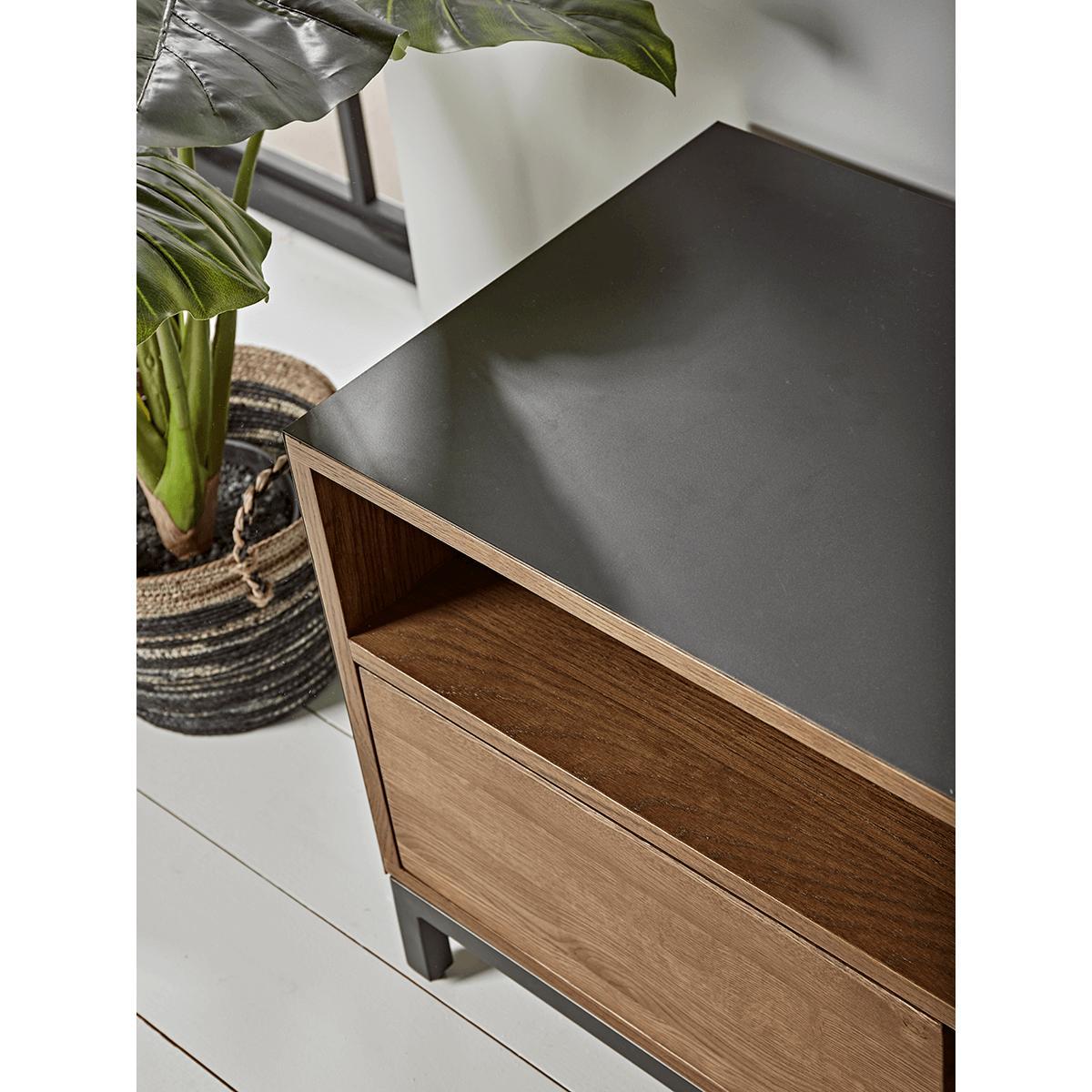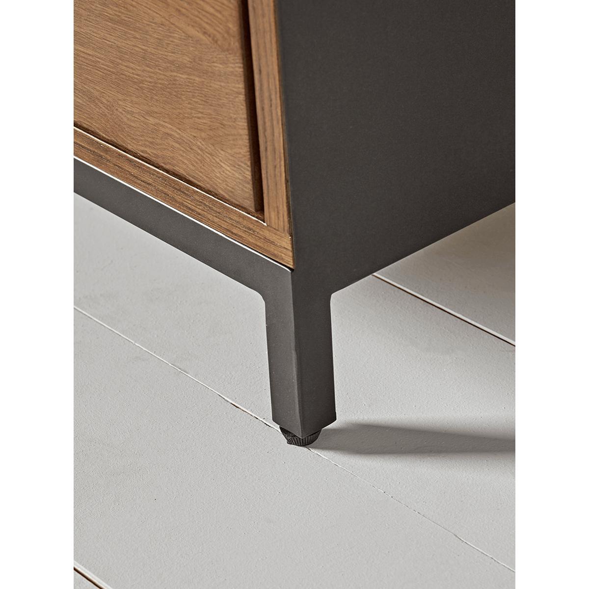 Full of modern loft-living style, the clean aesthetic of our range is most impactful, and it really showcases the natural rich tones of the oak. A black finished metal top and sides nod to industrial style, and a central shelf and three lower drawers provide ample space to store entertainment boxes, devices and DVDs out of view.