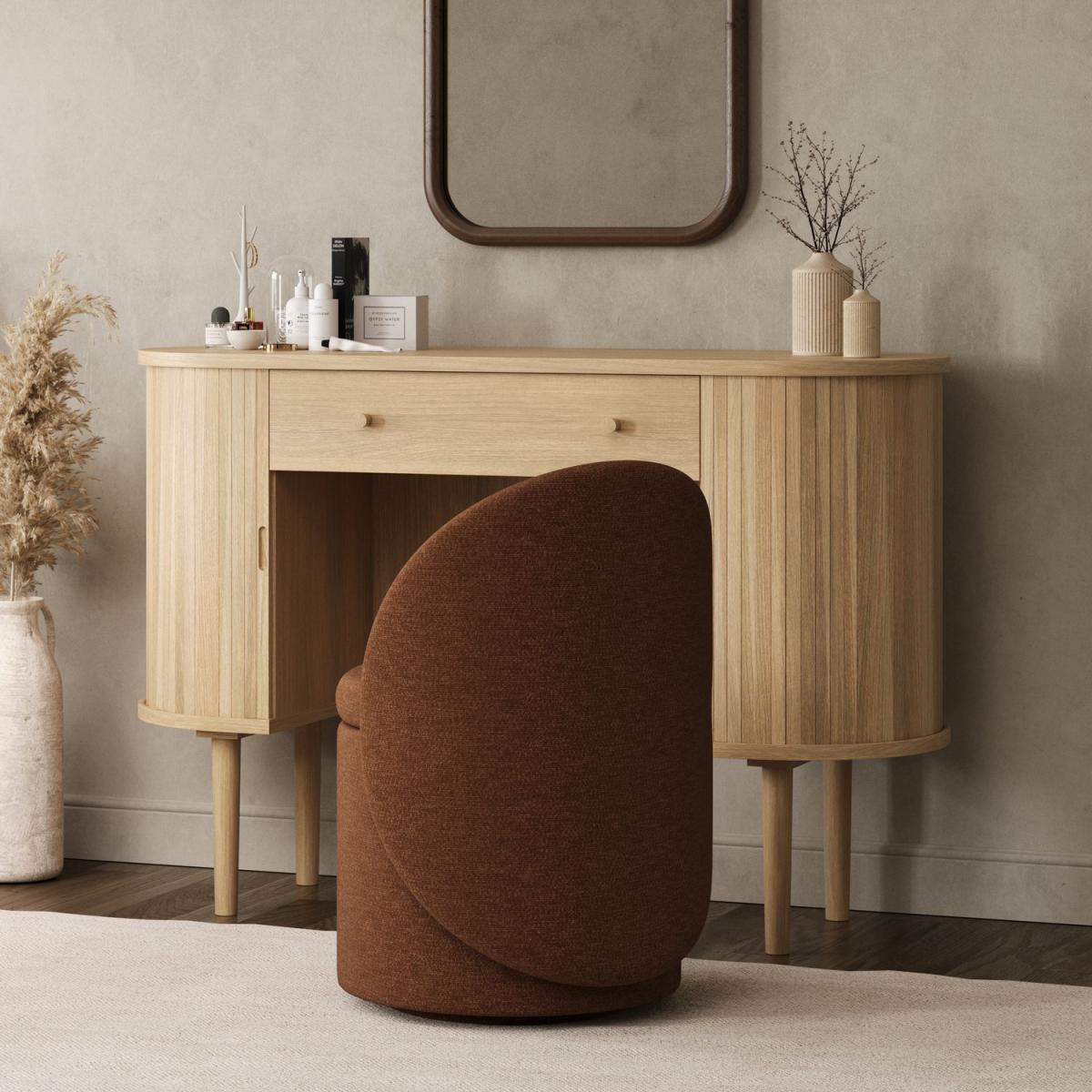 The Burnt Orange Chenille Ottoman Dressing Table Chair, or Leah as it’s called, offers a perfect blend of comfort and contemporary style. I love how the rich burnt orange tone adds warmth and character to a dressing area or bedroom, making it a striking statement piece. It works particularly well in interiors with neutral, minimalist palettes or vintage-inspired schemes, as it can either add a punch of colour or complement softer tones. For styling tips, try pairing it with textured linens, brass accents, or natural wood furniture to emphasise its cosy yet refined aesthetic. Practicality-wise, its plush chenille upholstery invites lounging, and the rounded shape ensures comfortable seating for routines like makeup or hair styling.