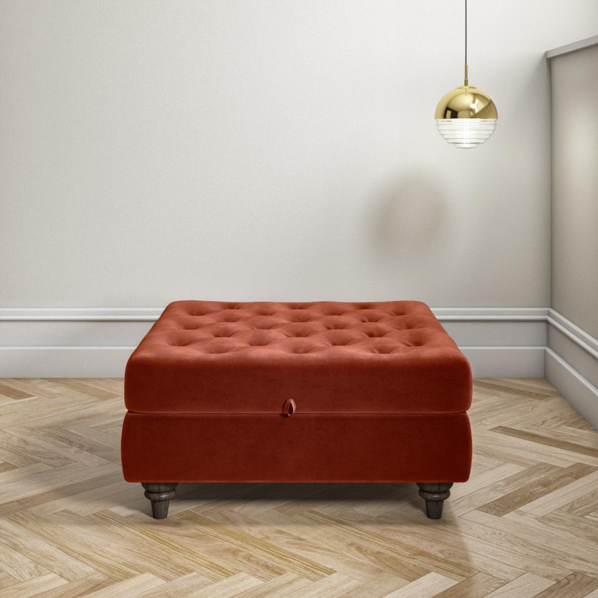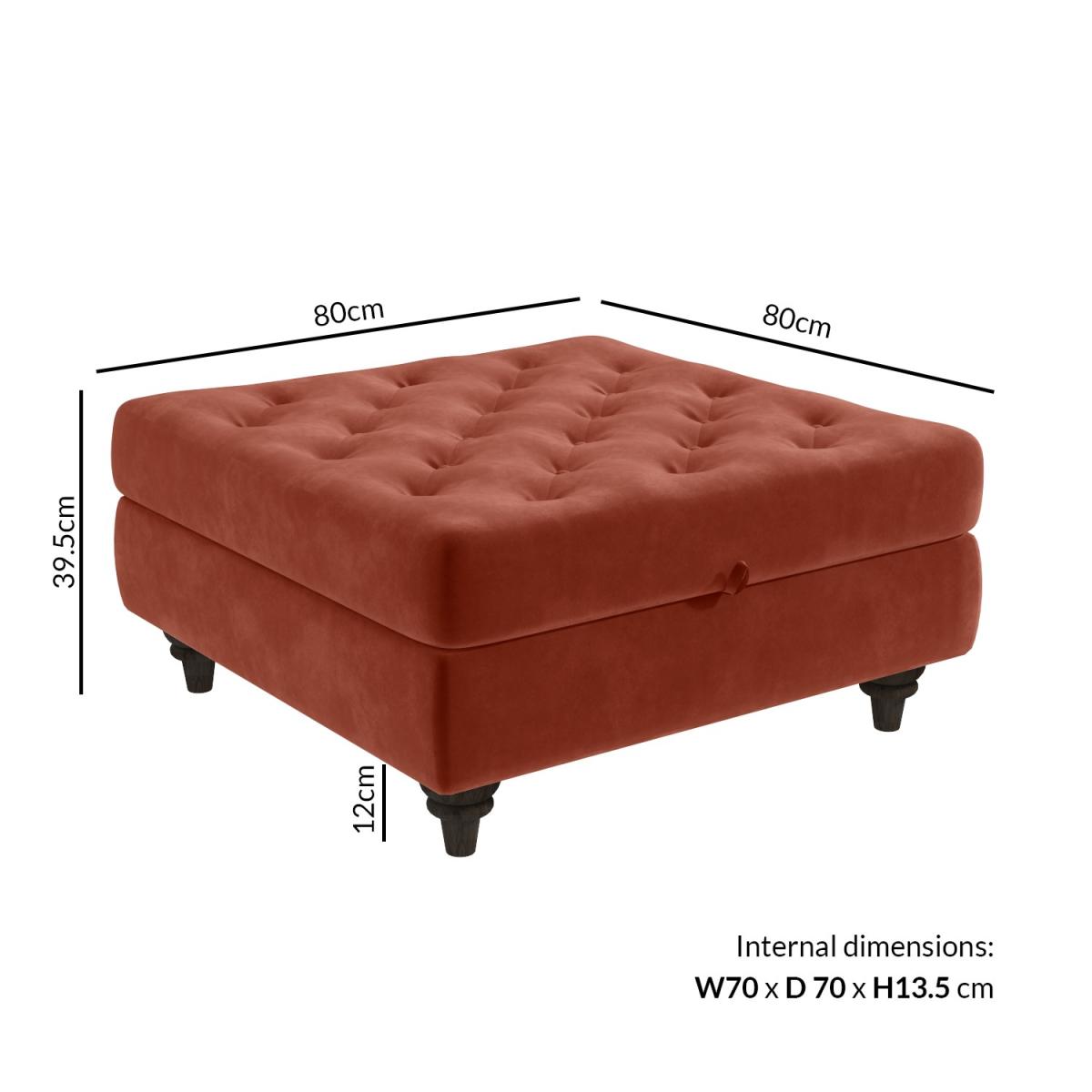 Features we love Stylish and elegant design perfect for updating different rooms in the home with an opulent touch. Beautifully upholstered in a plush velvet fabric with a deep buttoned top for a luxurious finish. Suitable for different rooms in the home like the living room dining room or dressing room. Top lifts up via the tab-style tongue to reveal ottoman storage perfect for clutter Solid light oak feet adds a final display of elegance All about me. Combining style with storage this Inez square footstool has been beautifully upholstered in a plush velvet fabric with a button tufted top to give it an elegant and luxurious finish it'll make quite a statement. It's super soft to touch too and because of the short dense pile it's resistant to abrasion and easy to wipe clean with a damp cloth. Its light oak legs add a final flourish of elegance. It's very practical and makes a versatile addition to any room in the home. Use the versatile Inez terracotta orange footstool as an extra table an extra seat when guests visit or to put your feet up after a long day. Or use it in your bedroom by your dresser. It boosts a hidden Ottoman storage inner which has been fixed with an anti-slam mechanism so it'll stay open. It's perfect for storing your snuggly throw your favourite magazines remote controls and more. It can be used as an extra seat and it doubles as a gorgeous coffee table once you place a tray on top or you can just put your feet up and relax. There's very little assembly it's simply a case of fixing the legs. Need to know. Overall dimensions. H39.5 x W80 x D80 cm (including legs at 12 cm) Internal dimensions. H13.5 x W70 x D70 cm Colour. Dark orange Finish. Velvet Material. Wood construction (including eucalyptus wood) and velvet Assembly required. Yes.