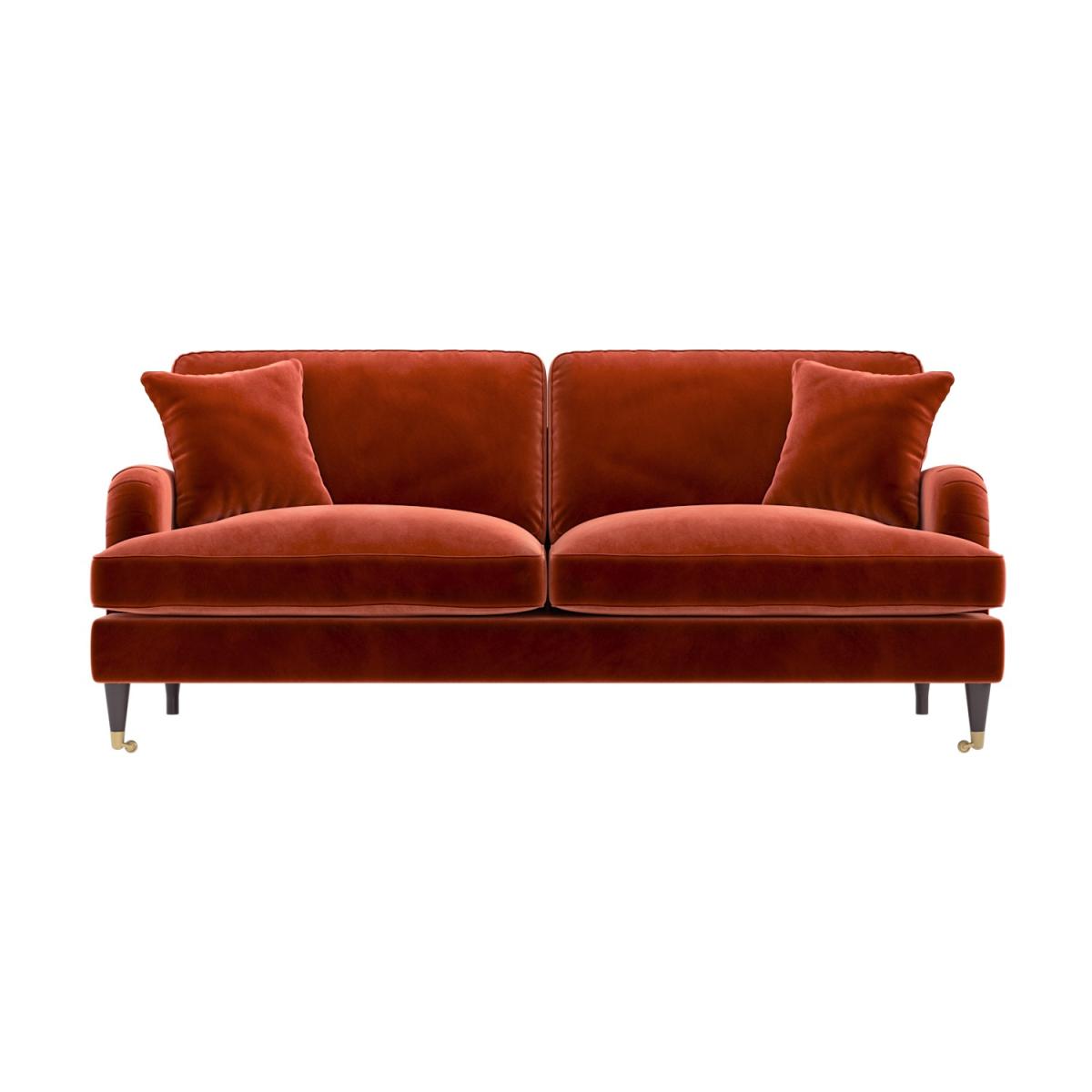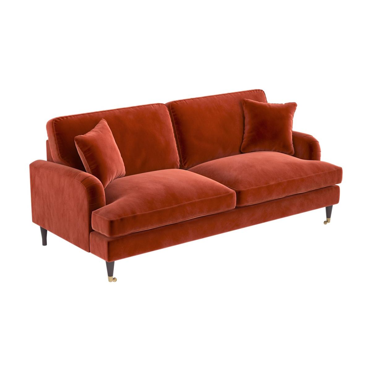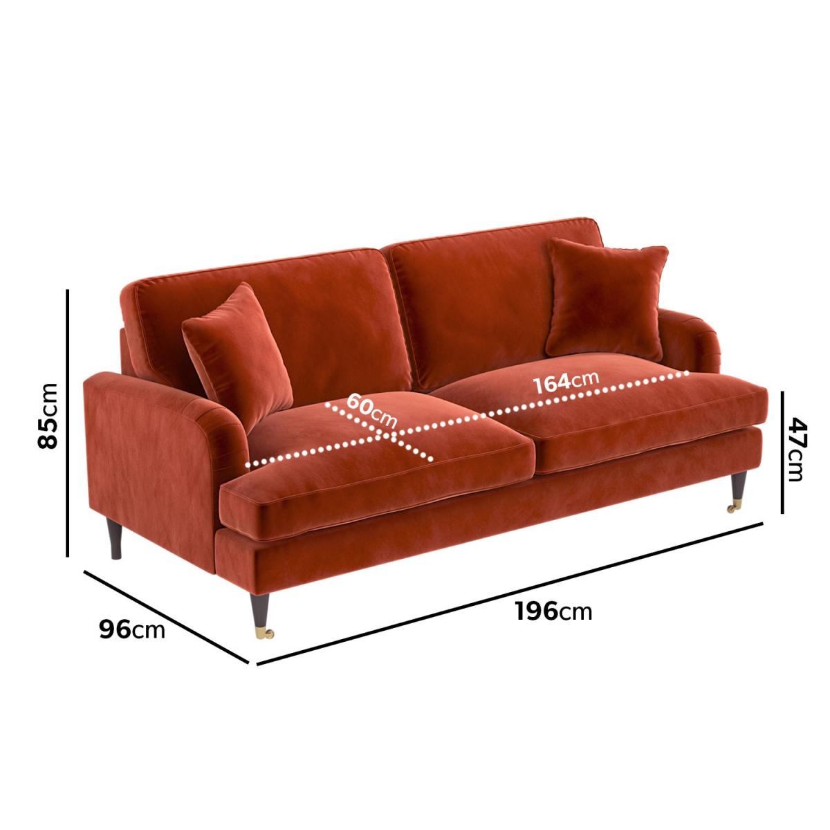 All about me This traditional Payton sofa accommodates up to three people comfortably and includes two matching scatter cushions for added style and comfort. Classic ruched saddle arms and dark wood legs with gold castors complete the modern look. It's built to last too, with a sturdy solid wood frame. Assembly is easy; simply fix the legs into position. Need to know Dimensions: W190 x D96 x H85 cm Weight:54 kg Max supported weight: 100 kg per seat Seats: 3 people Colour: Orange Finish: Upholstered Material: Velvet fabric Frame: Solid plywood and eucalyptus wood Assembly required: Yes - just attach the legs Packaging dimensions: W192 x D98 x H61 cm View Care Guide »