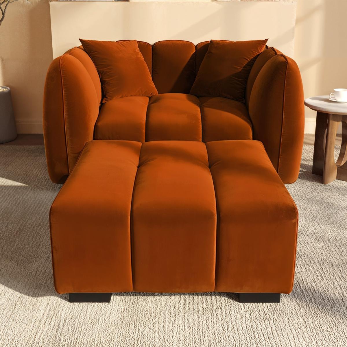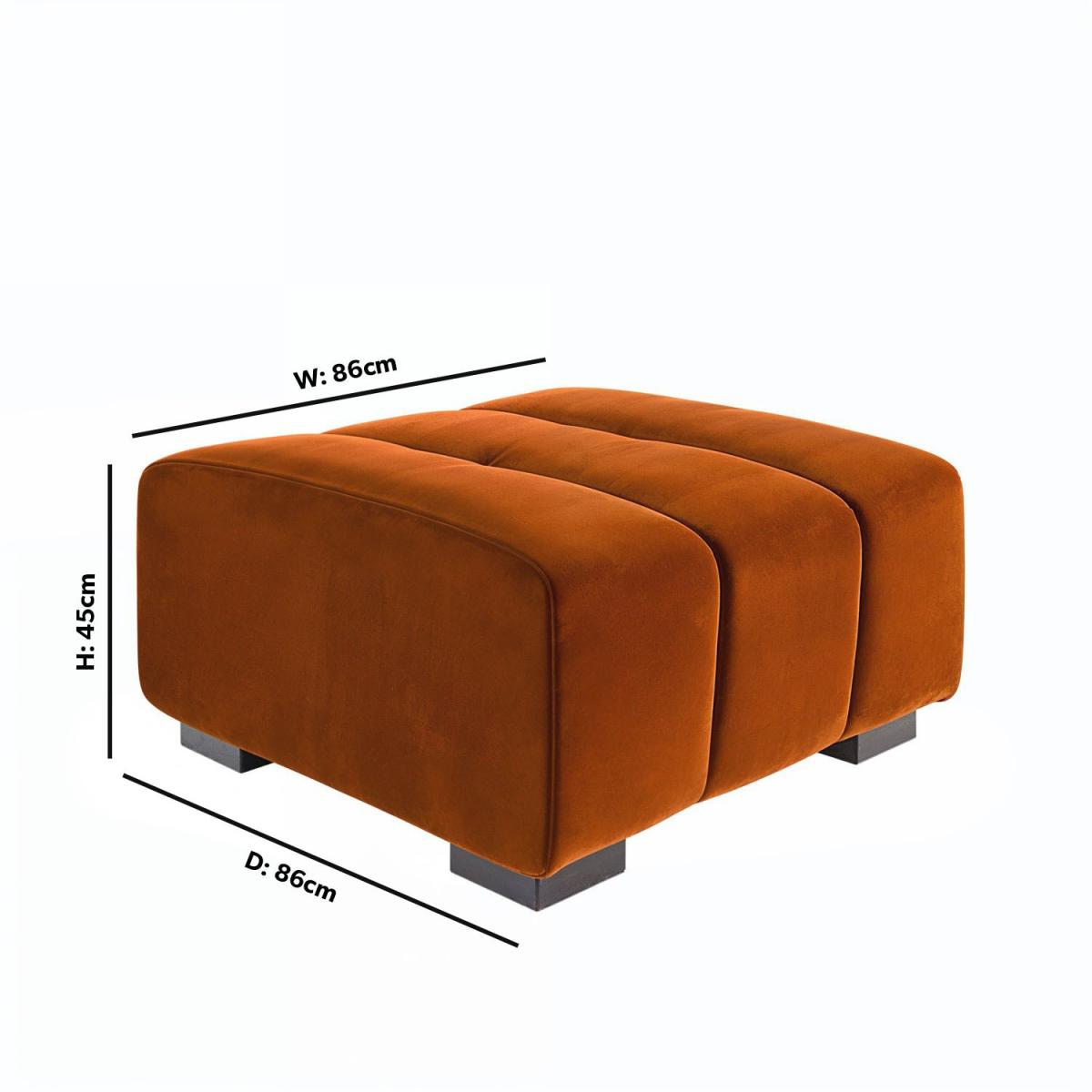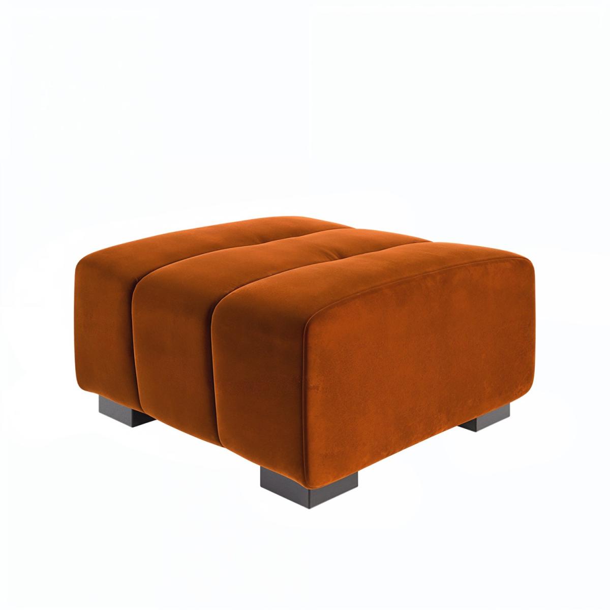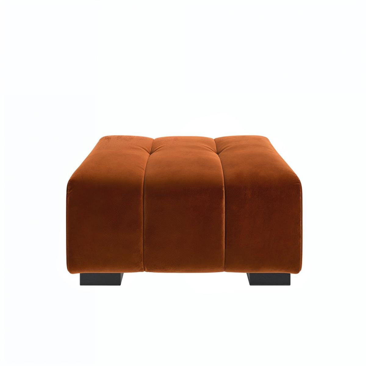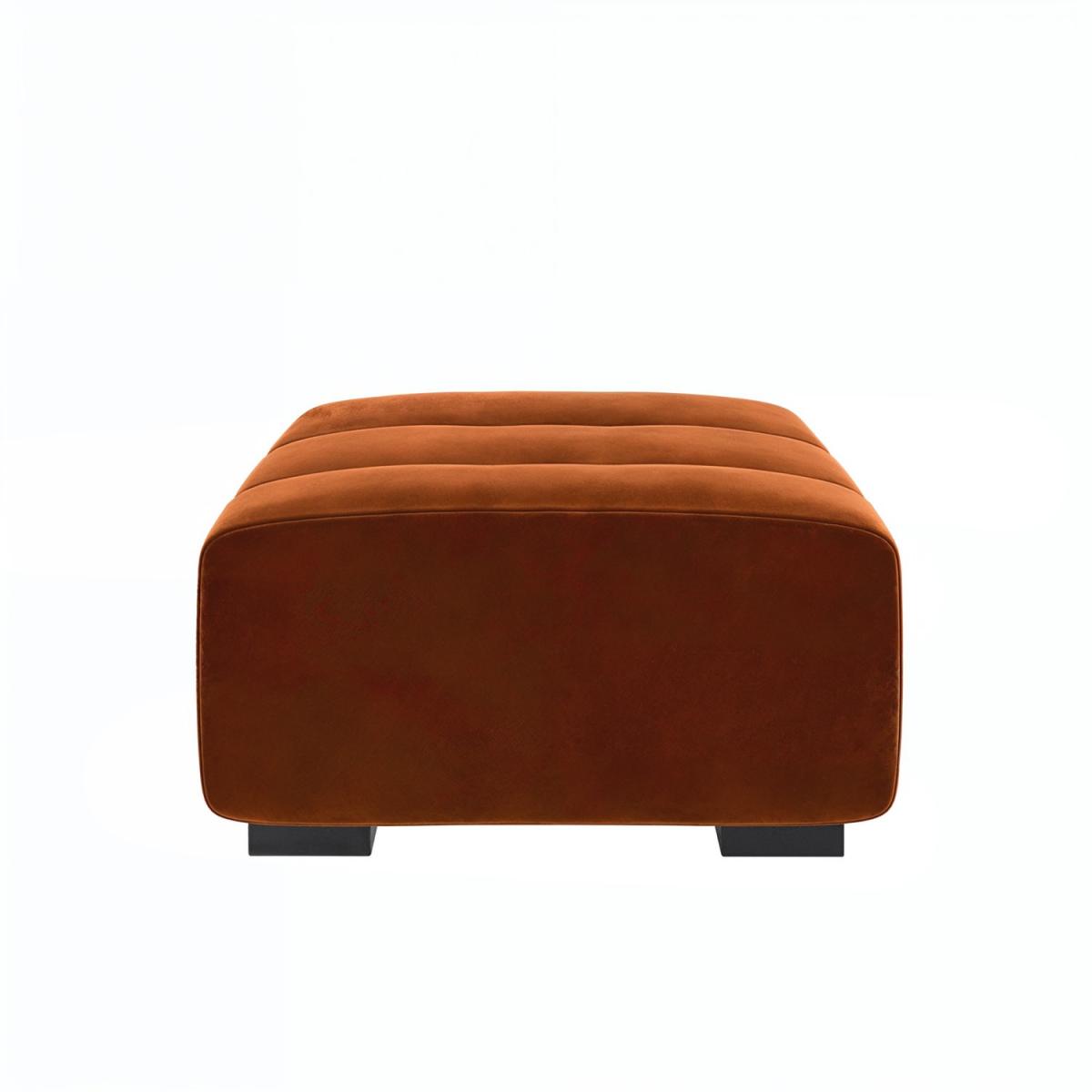 The luxuriously soft velvet fabric brings warmth and a splash of colour to your interior with its vibrant burnt orange finish. Channel tufting and soft, rounded corners combine for a mid-century modern design that’s packed with character. Built with a strong frame for longevity, ensuring this footstool stands up to daily use. The Elod footstool is designed to be the perfect partner for our Elod love seat, which combine for ultimate comfort. Elevate your living space with the stylish Elod Footstool, a perfect blend of comfort and contemporary design. Upholstered in luxuriously soft burnt-orange velvet and finished with chic ribbed detail, it brings a refined touch of modern elegance to any room and is the perfect partner to our Elod love seat or sofa. Whether used as a footrest, extra seating, or a statement accessory, Elod's versatile design effortlessly combines sophistication with everyday functionality.