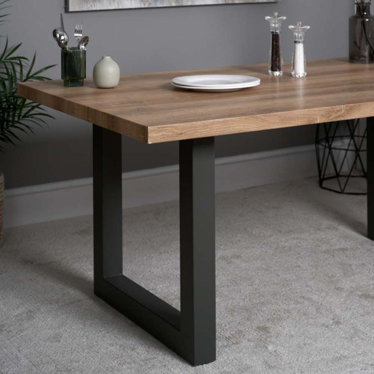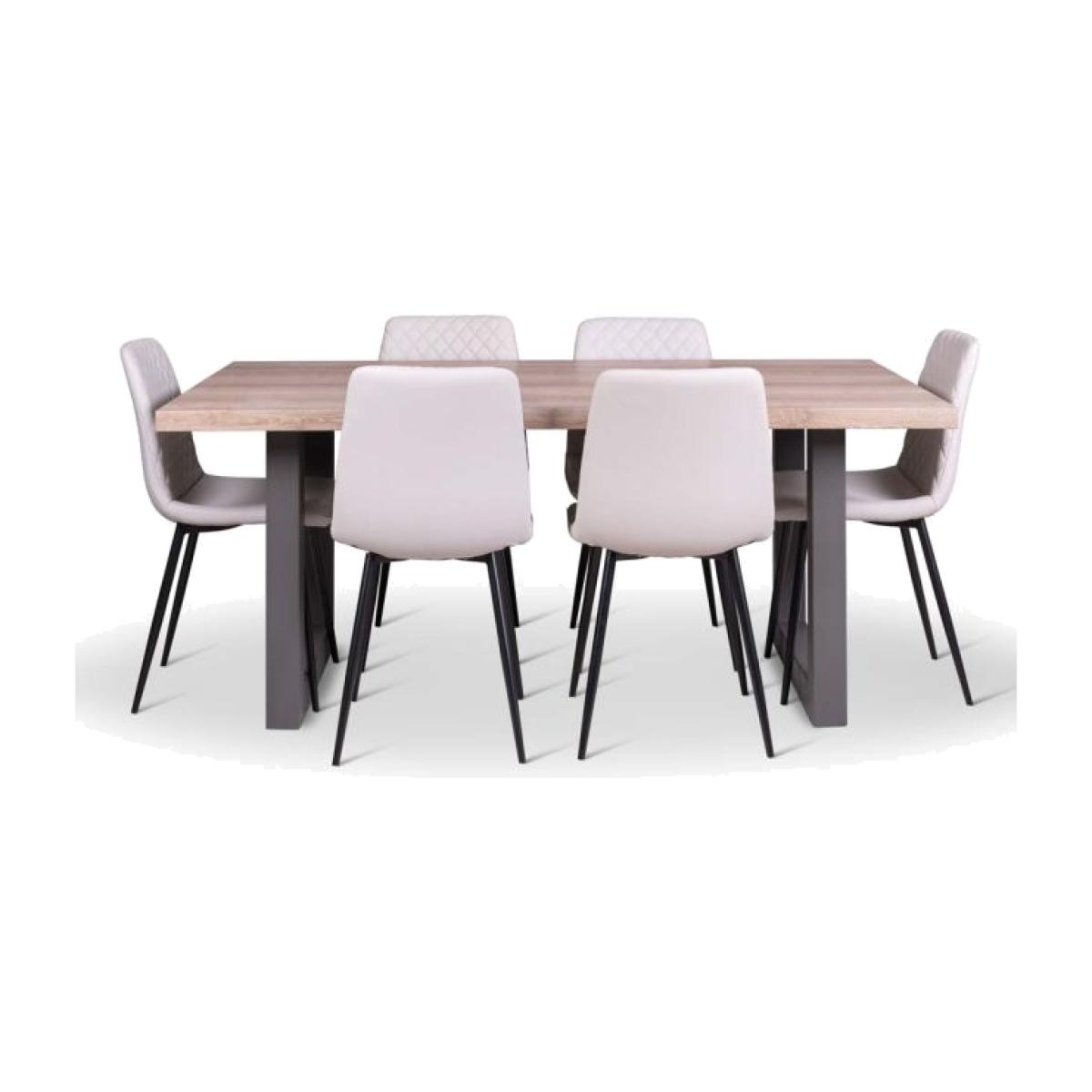 Strong industrial styling is very on trend and what is offered with our dining bundle including the Burton Dining Table plus six Ripley Dining Chairs in chalk. The table is a great example of stunning industrial design, with a high-tech distressed oak effect top and supported by sturdy industrial style metal legs with a matt grey finish. The modern Ripley chairs are upholstered in a faux leather fabric with diamond quilted back detail and sit on top of matt black metal legs.