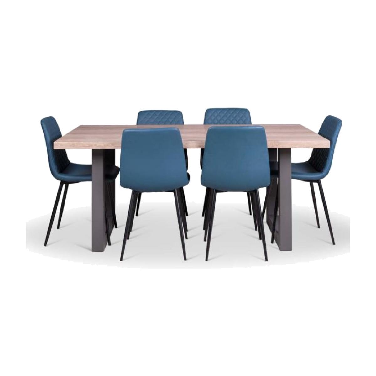 Strong industrial styling is very on trend and what is offered with our dining bundle including the Burton Dining Table plus six Ripley Dining Chairs in teal. The table is a great example of stunning industrial design, with a high-tech distressed oak effect top and supported by sturdy industrial style metal legs with a matt grey finish. The modern Ripley chairs are upholstered in a faux leather fabric with diamond quilted back detail and sit on top of matt black metal legs.