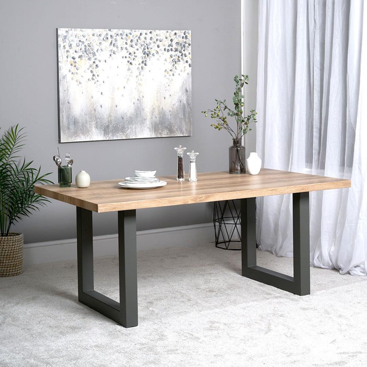 The Burton Dining Table is a great example of stunning industrial design, with a high tech distressed oak effect top. With sturdy industrial style metal legs that have matt grey powder coated finish this table is a great size for flexible dining. The top has a lovely feel and not being real wood is easy to keep clean and is made to last.