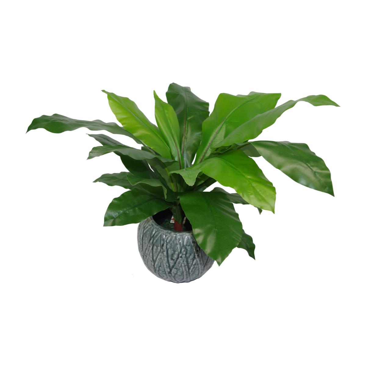 Bird's Nest Ferns also known as "Asplenium Nidus" form large simple fronds visually similar to banana leaves. These are a bold and striking plant ideal for indoors. Our artificial Nest Fern plants are perfect for just about anywhere you wish to add an element of greenery with no maintenance or fuss. Extra large with lots of leaves. Available in various sizes - see our other products. The width will vary depending on exactly how you arrange the leaves. It is highly realistic with botanically accurate large leaves. It comes potted in a plain plastic pot and is ready to display. Ceramic planters shown are for illustration only and are not included.
