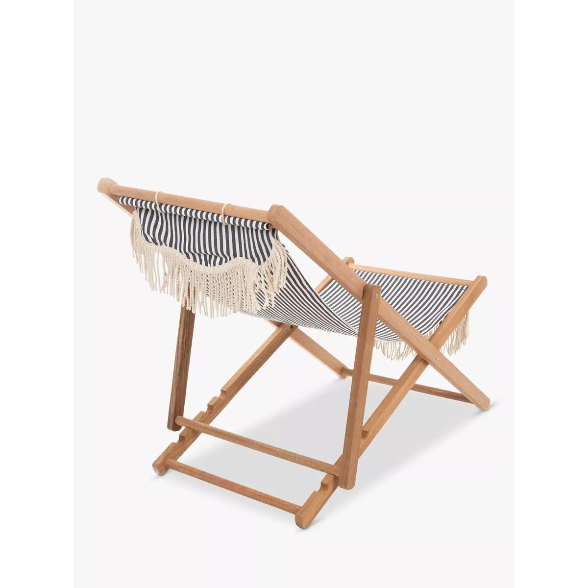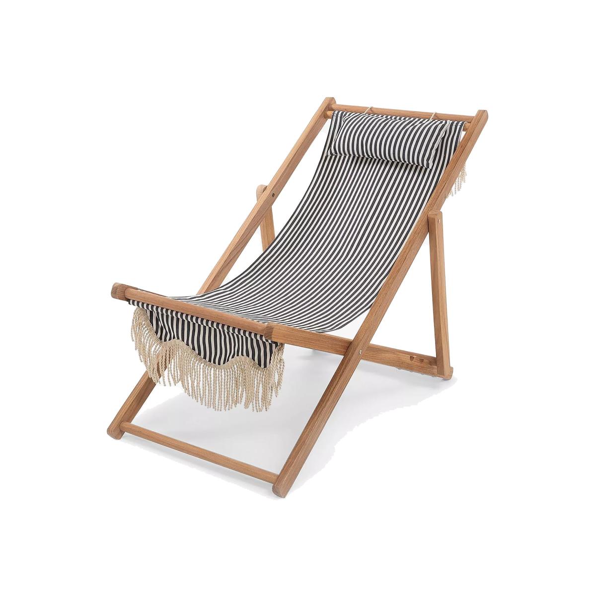 Your classic deck chair, just more beautiful. Featuring Business & Pleasure Co.'s nautical-inspired Lauren's Stripe pattern with a signature scalloped edge and natural cotton fringe. Adds comfort and class to any patio, beach or garden. Compact when folded, it's easy to set up and pack up. Weather-resistant fabric Made with the brand's Pleasuretex® fabric, a signature vintage-look canvas that's UV, mould and water-resistant. Removable to wash or replace when needed. Weather-resistant frame Premium, painted teak wood frame including a weather-resistant coating Rest easy Easy to set up ready for relaxation in under a minute. Includes a cushioned headrest and multiple reclining positions.