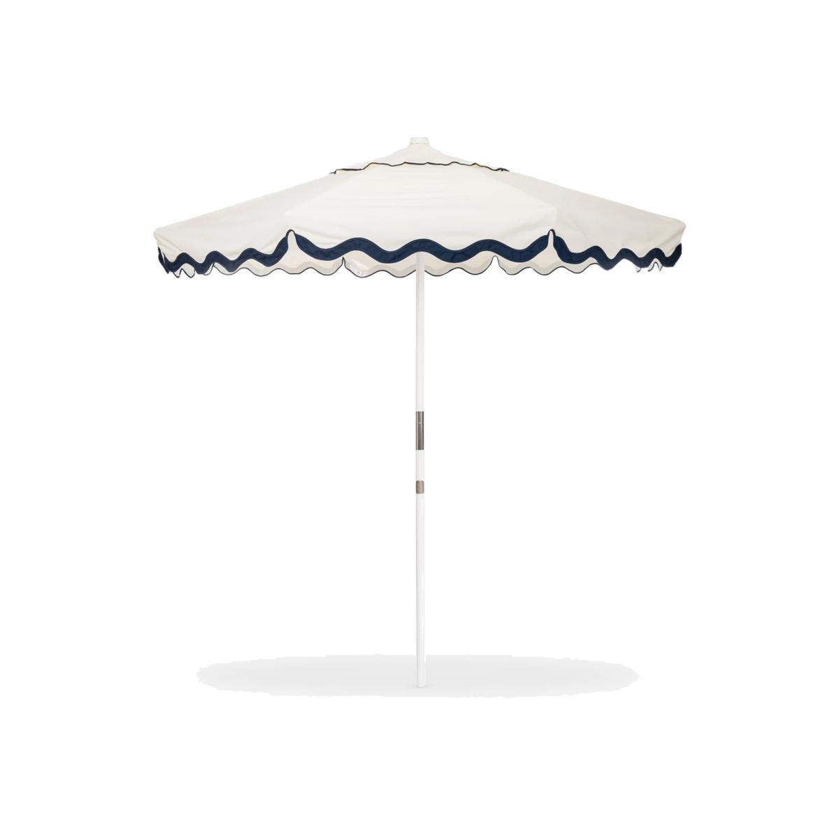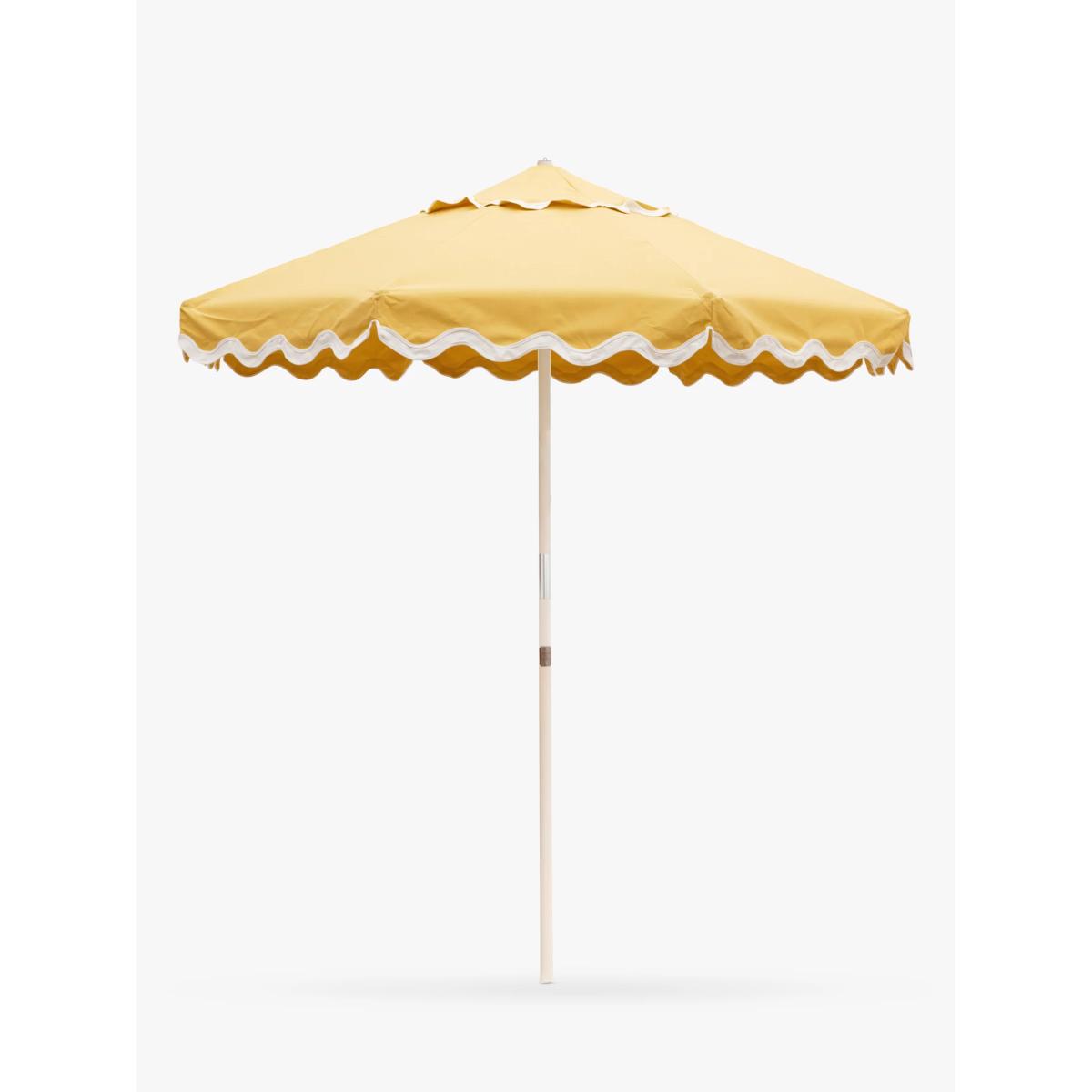 Gorgeous garden parasol for a patio, pool or outdoor area, from Business & Pleasure Co. With a large span, contrasting scalloped trim and an easy set-up, this Riviera-style parasol enhances any outdoor space. Replaceable canopy Made with the brand's Pleasuretex® fabric, a signature vintage look canvas with UV and water protective treatment plus added polyurethane coating. Removable to wash or replace when needed. Protective cover Includes an outdoor cover to keep it pristine. Easily throw the cover over the closed umbrella to offer protection or easy storage when not in use. Easy set-up Ready to provide shade in under two minutes. Simple and strong Eight times coated premium wooden ribs and pole, combined with alloy steel connectors and twin pulleys provide strength and stability. Requires a 25kg base. Choose a suitable parasol base weight. Good to know: The parasol is designed for sun shade protection only. In windy weather, take down the parasol and store safely.