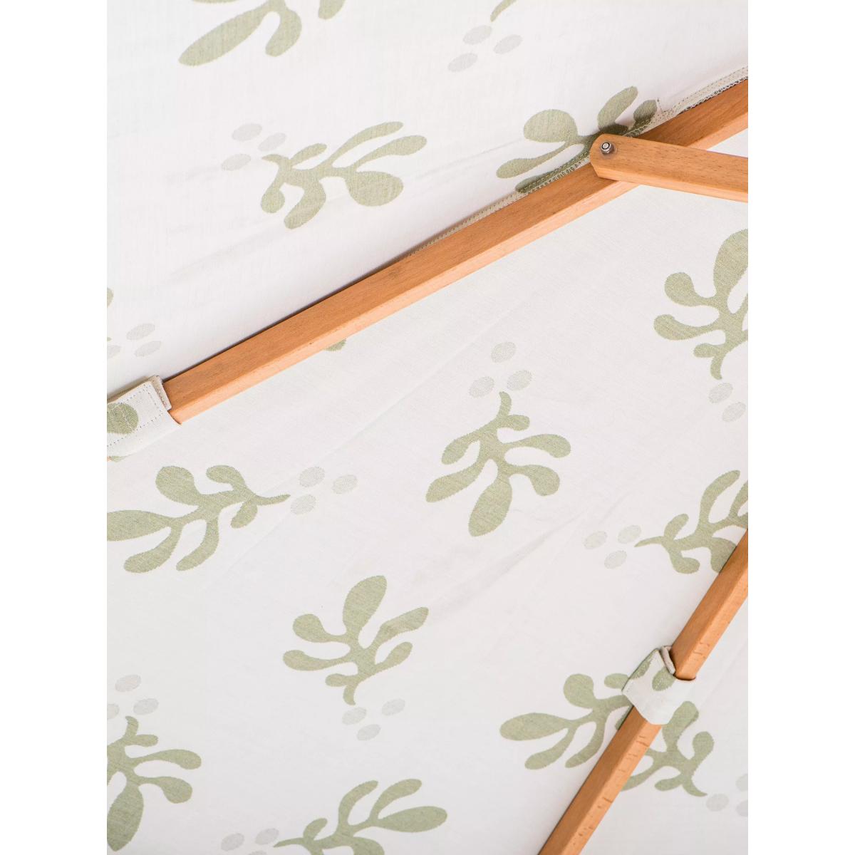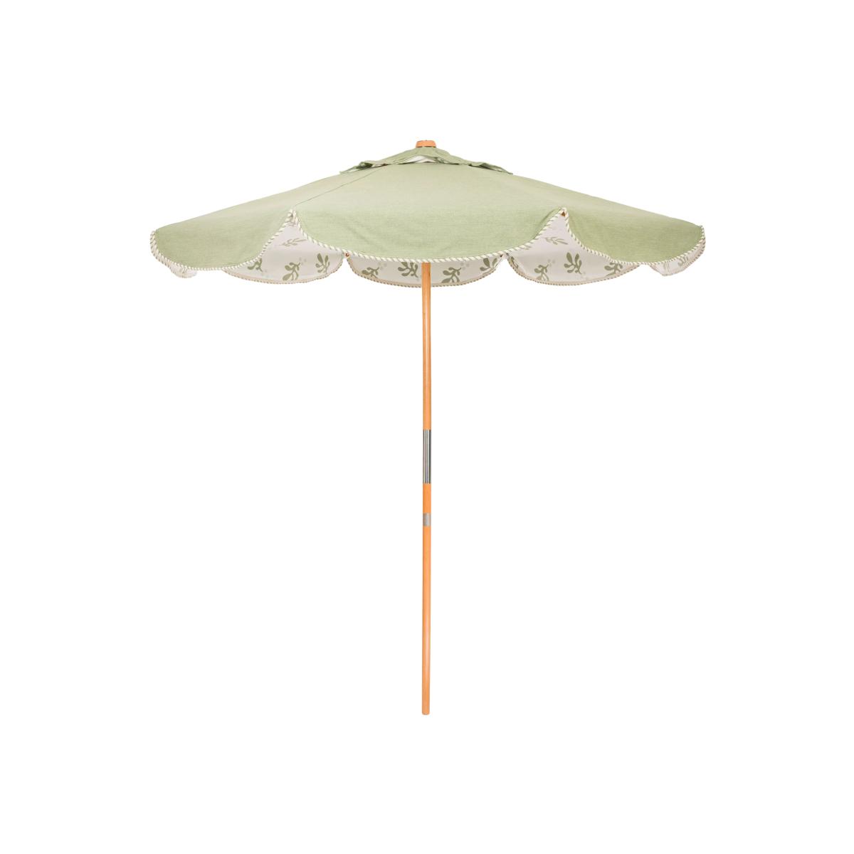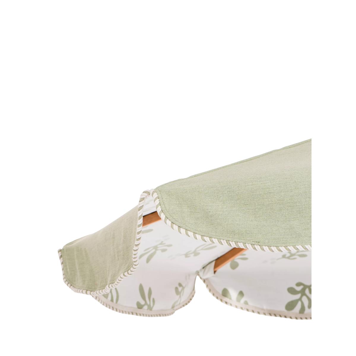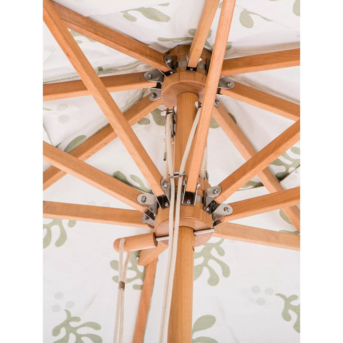 Garden parasol for a patio, pool or outdoor area, from Business & Pleasure Co., made with a large span and an easy set-up. Plain on top with a nature-inspired pattern inside, the canopy is trimmed with stripes in a durable design. Weather-resistant fabric Made with the brand's Pleasuretex® fabric, a signature vintage-look canvas that's UV, mould and water-resistant. Removable to wash or replace when needed. Protective cover Includes an outdoor cover to keep it pristine. Easily throw the cover over the closed umbrella to offer protection or easy storage when not in use. Easy set-up Ready to provide shade in under two minutes. Simple and strong Eight times coated premium wooden ribs and pole, combined with alloy steel connectors and twin pulleys provide strength and stability. Requires a 25kg base. Choose a suitable parasol base weight. Good to know: The parasol is designed for sun shade protection only. In windy weather, take down the parasol and store safely.
