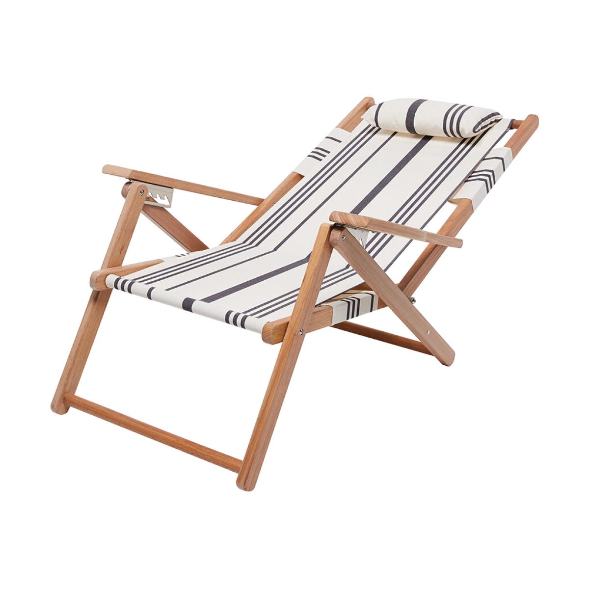 Add laidback vibes to your next beach or pool day with The Tommy Chair from Business & Pleasure Co. The ultimate in beach comfort, this deck chair has three reclining positions and a soft canvas seat with padded headrest. Perfectly portable, it has padded carry straps too. Key features: * Deck chair * Material: canvas, hardwood * Dimensions: H86xW66xD76cm * Solid hardwood frame * Canvas seat * Vintage stripe design * In black and white * 3 position reclining * Padded headrest * Foldable design with carry straps * Back pocket with zip closure * Spot clean with mild, soapy water
