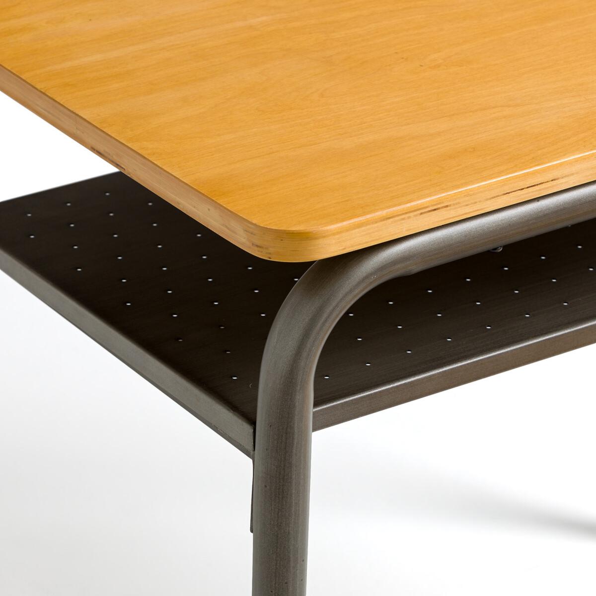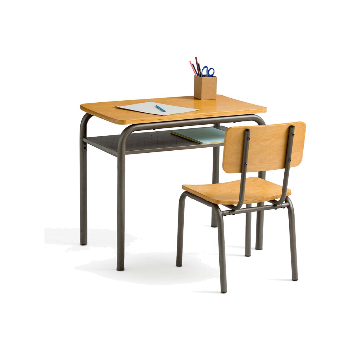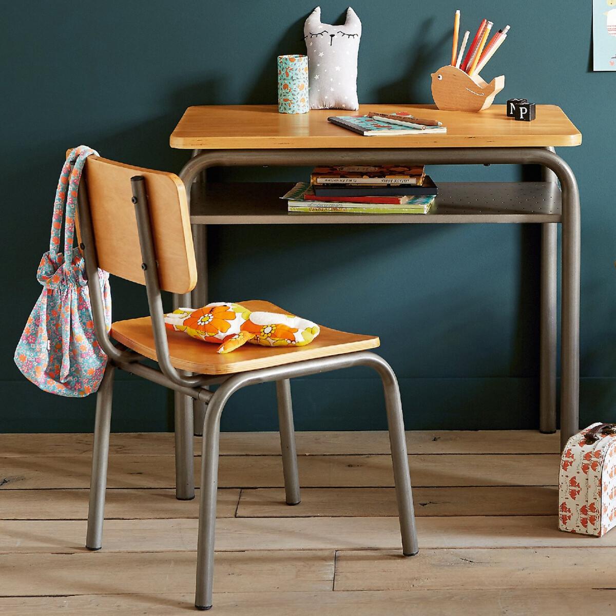 I love this vintage metal school desk and chair for adding a nostalgic, utilitarian touch to both modern and eclectic interiors. Its classic metal frame paired with a warm wooden top offers a balanced mix of durability and charm. It works particularly well in play areas, study nooks, or even as a quirky statement piece in a home office or an industrial-style scheme. For styling tips, consider pairing it with colourful storage bins, vintage accessories, or even mixing it with contemporary furniture for an eclectic vibe. Keeping accessories minimal and functional will highlight its retro appeal while maintaining practicality.