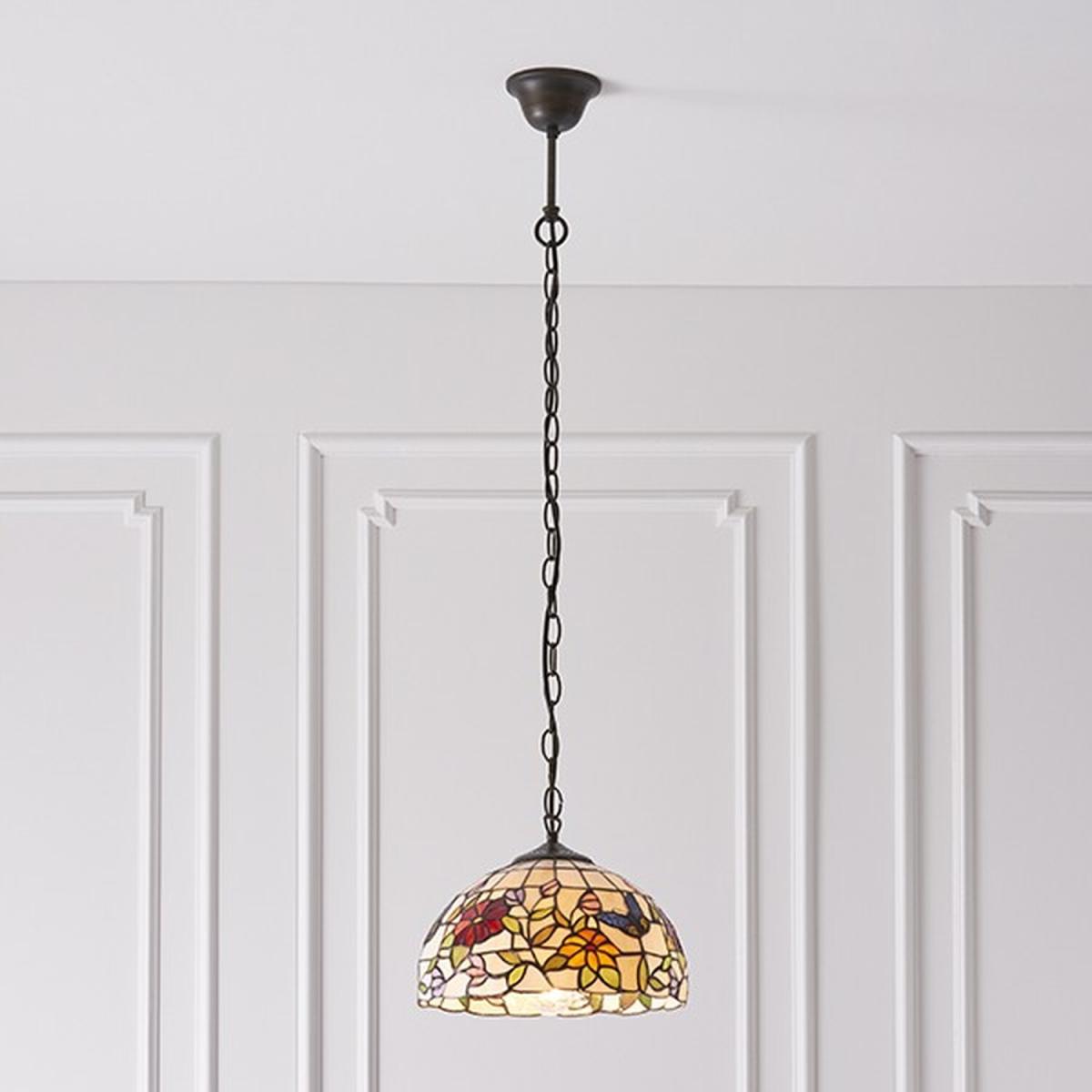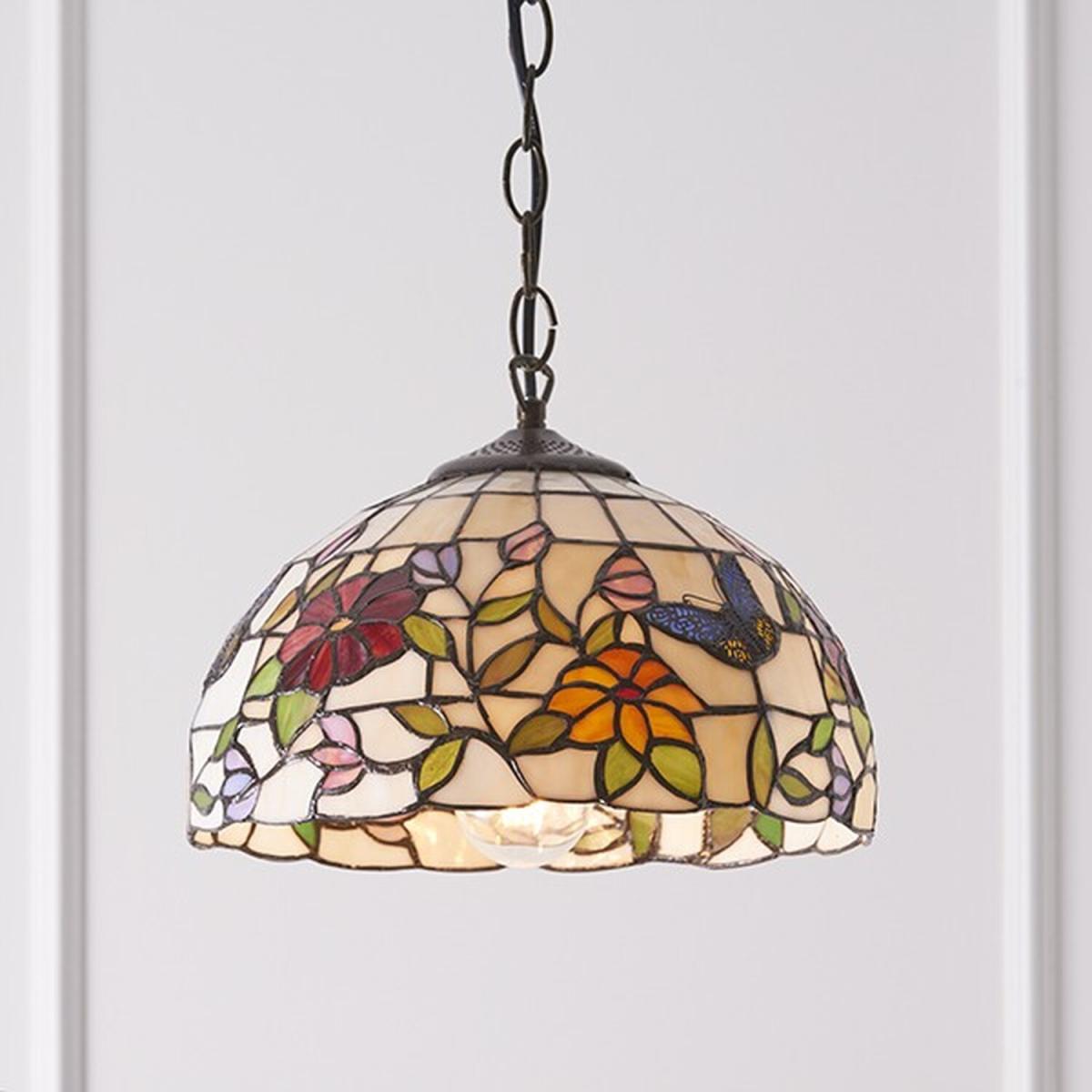 The small pendant is a traditional Tiffany design combining bright flowers and colourful butterflies, made from art glass and teamed with a bronze effect fitting. Compatible with LED lamps and matching items available.