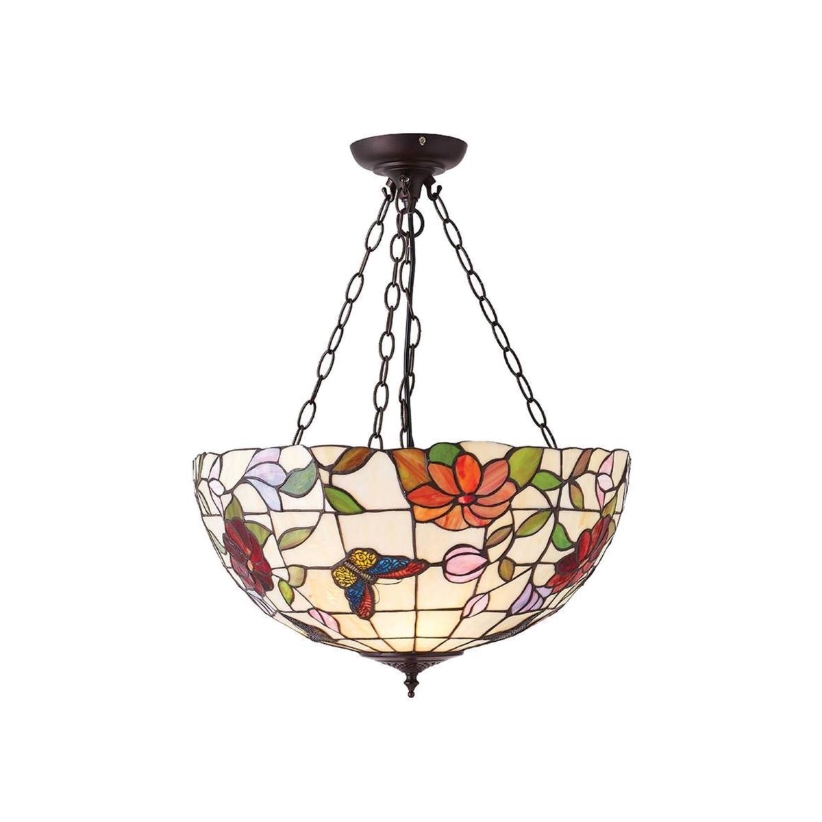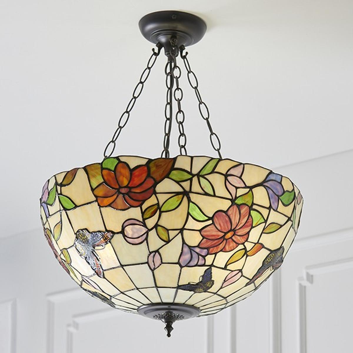 The large inverted pendant is a traditional Tiffany design combining flowers and colourful butterflies, made from art glass and teamed with a bronze effect trim. Compatible with LED lamps, dimmable and matching items available.