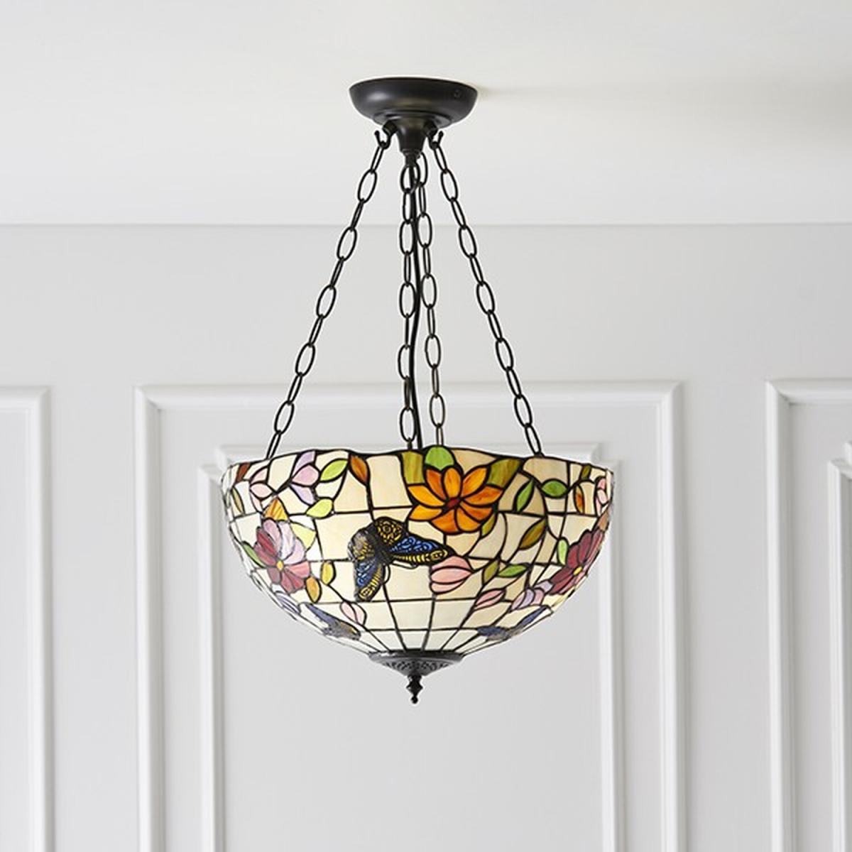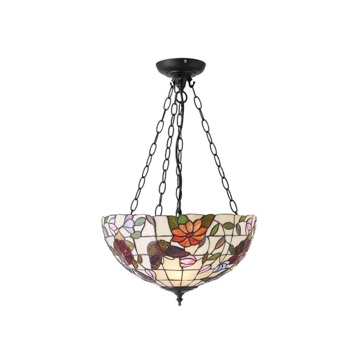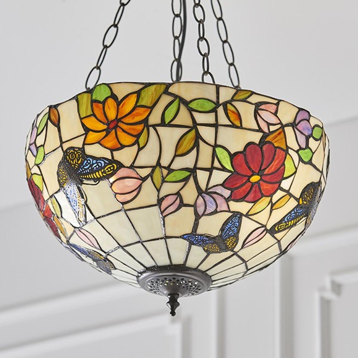 The inverted pendant is a traditional Tiffany design combining flowers and colourful butterflies, made from art glass and teamed with a bronze effect trim. Compatible with LED lamps, dimmable and matching items available.