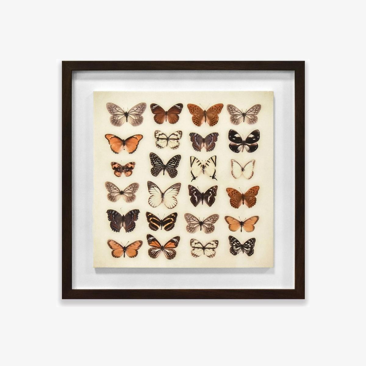 By Ian Winstanley, a wooden plaque paired with a black frame. Framed in black and mounted on a wooden plaque, by Ian Winstanley presents a beautifully arranged study of common butterflies. Set against a soft cream background, the square composition features delicately illustrated butterflies in tones of orange, grey, black and white. This piece blends natural charm with vintage-inspired elegance—perfect for adding a touch of nature and quiet sophistication to any room.