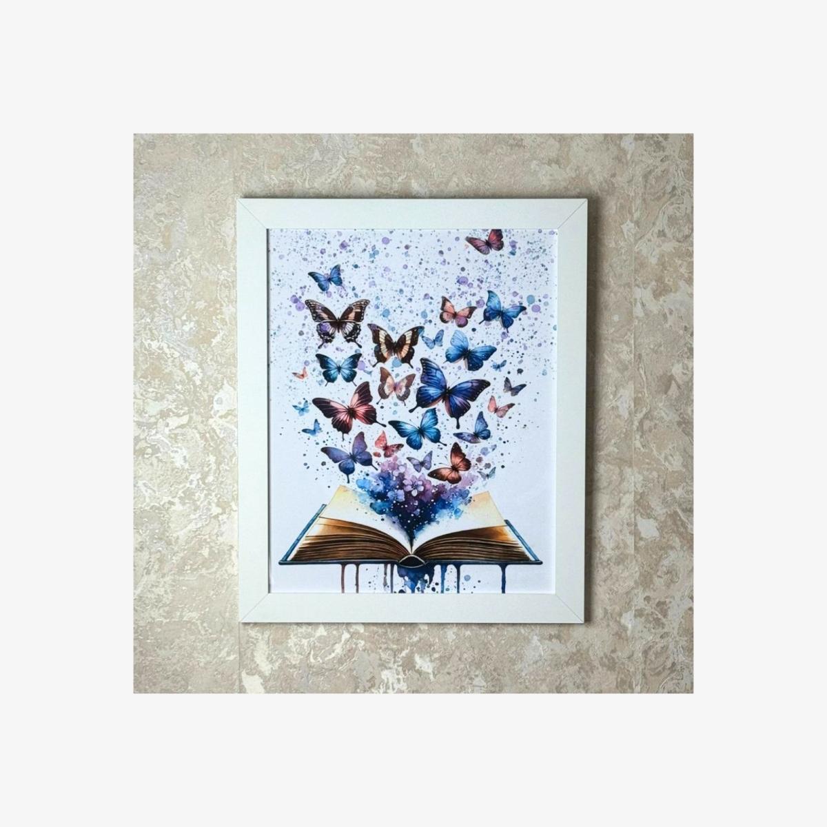 Butterfly Pages wall art, paired with a white wooden frame. A striking and imaginative composition, this artwork depicts an open book set against a bright white background, with vivid butterflies rising from its pages as if brought to life by the words within. The contrast between the colourful tones and the white creates a sense of magic, transformation and storytelling. Finished with a simple white wooden frame, this piece brings depth and intrigue to any wall, making it ideal for book lovers, dreamers and creatives alike.