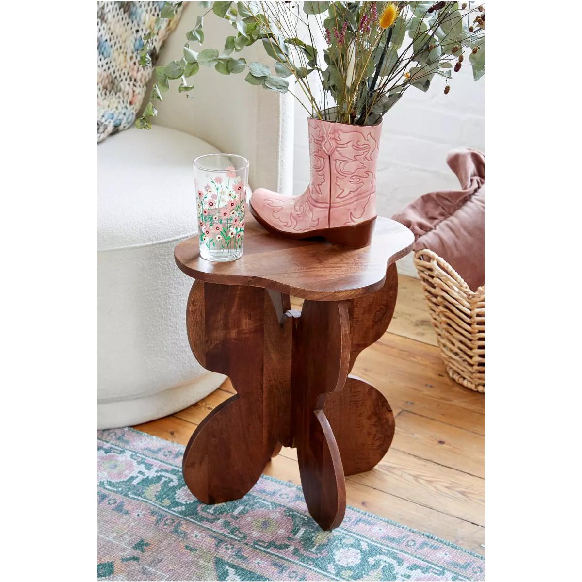 Add fluttery butterfly motifs to your space with this butterfly-base side table. Crafted from quality mango wood with a natural patina finish, complete with rounded edges and cut-out butterfly designed details at the base. *Online return only. This item cannot be returned instore. Please note furniture items currently cannot be shipped to Northern Ireland or The Republic of Ireland. Delivery of large furniture items may take 2-3 weeks and are therefore not eligible for Next Day Delivery.* **Content + Care** \- Mango wood \- Wipe clean **Size** \- Dimensions: 40cm x 40cm x 46cm \- Shipping container: 53cm x 49.5cm x 16.5cm