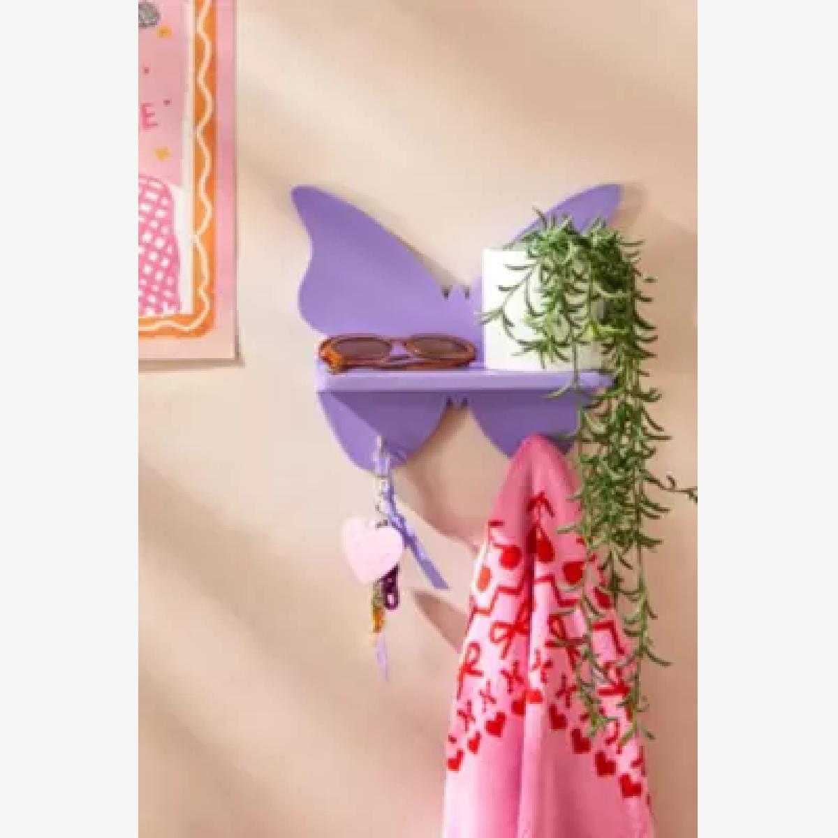 Add a cutesy touch to your space with this butterfly shelf. Buttefly motif constructed from a metal hardware. Complete with a rectangular silhouette for storing all your trinkets and added hooks. **Content + Care** \- 95% MDF, 5% Iron \- Wipe clean
