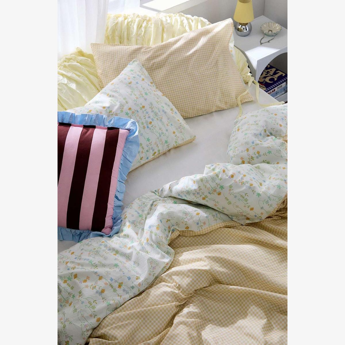 Sweet bedding set with a ditsy floral print and yellow check pattern on the reverse. Crafted from cotton, it includes a duvet cover and matching pillowcases. **About Better Cotton** \- By choosing our cotton products, you’re supporting our investment in Better Cotton’s mission- This product is sourced via a system of mass balance and therefore may not contain Better Cotton- Bettercotton.org/massbalance **Content + Care** \- 100% Cotton- Machine wash **Size** \- Pillowcase: 75cm x 50cm- Single (includes 1 pillowcase): 135cm (W) x 200cm (H)- Double (includes 2 pillowcases): 200cm (W) x 200cm (H)- King (includes 2 pillowcases): 230cm (W) x 220cm (H)