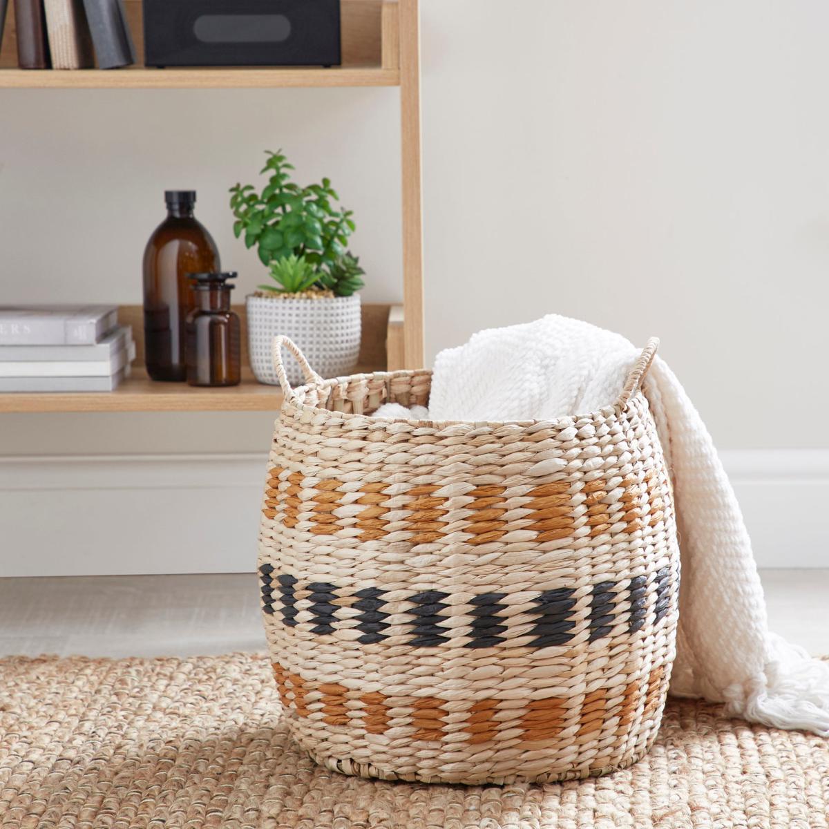 A fan of this basket would appreciate its versatility and warm colour palette, which can easily complement both contemporary and boho interiors. I love it for adding a tactile, natural element to living rooms or bedrooms-perfect for storing throws, magazines, or even laundry. It works particularly well with neutral tones, textured fabrics, and wooden accents, enhancing a cosy and inviting vibe. Practical styling tips include placing it beside a sofa or bed for functional storage, or as a decorative piece with a blanket or plant on top. Its earthy hues and bold pattern make it a great focal point without overwhelming the space.